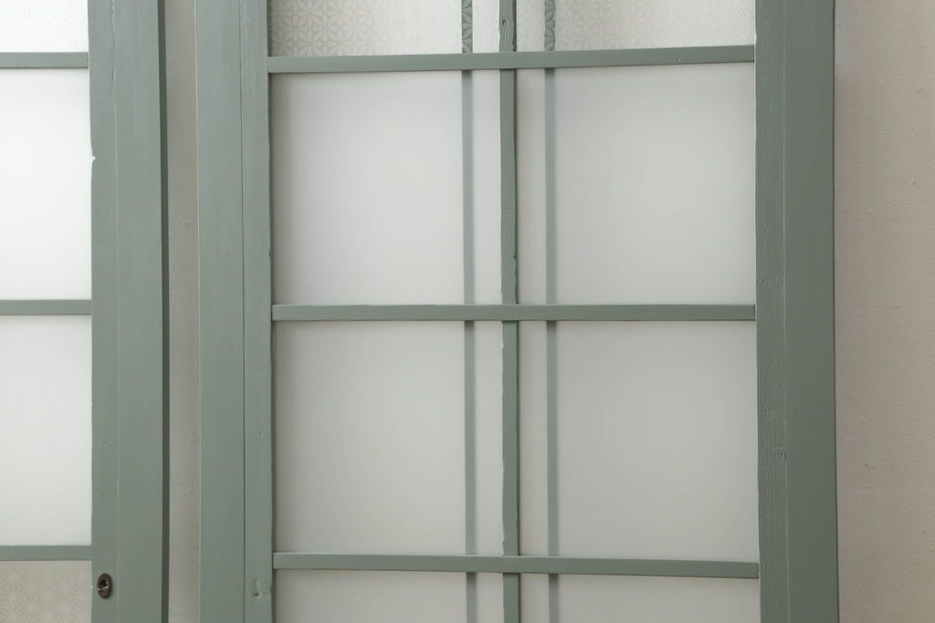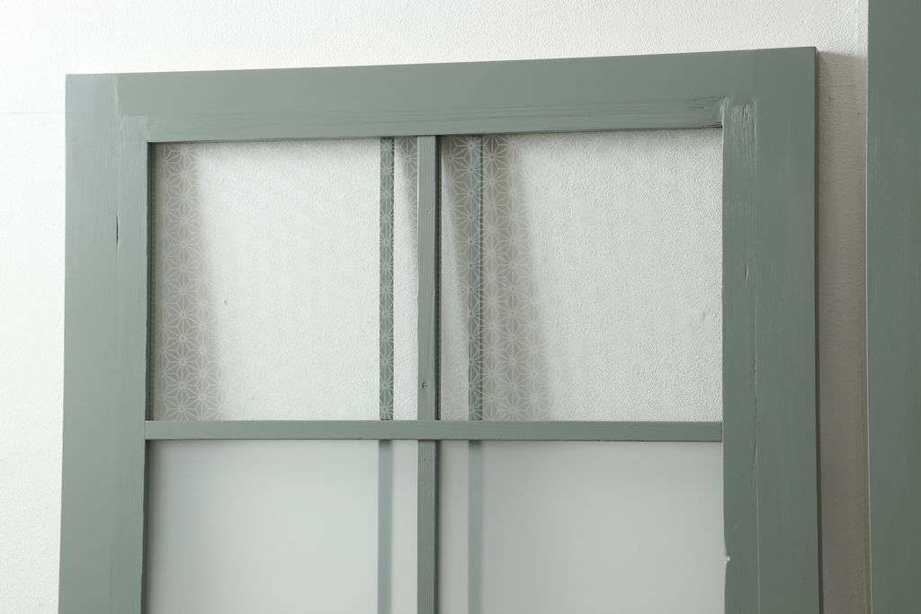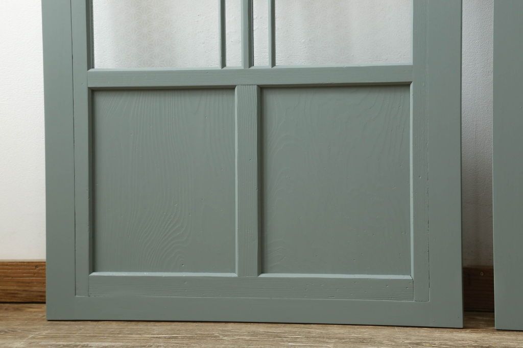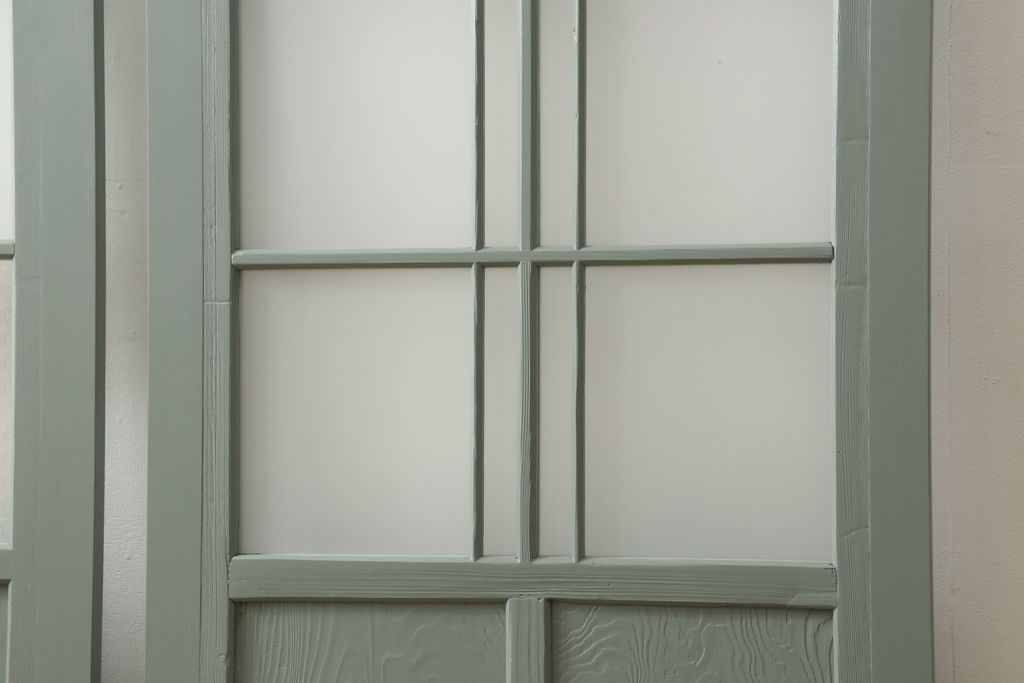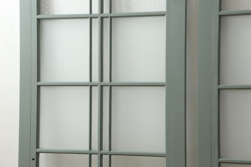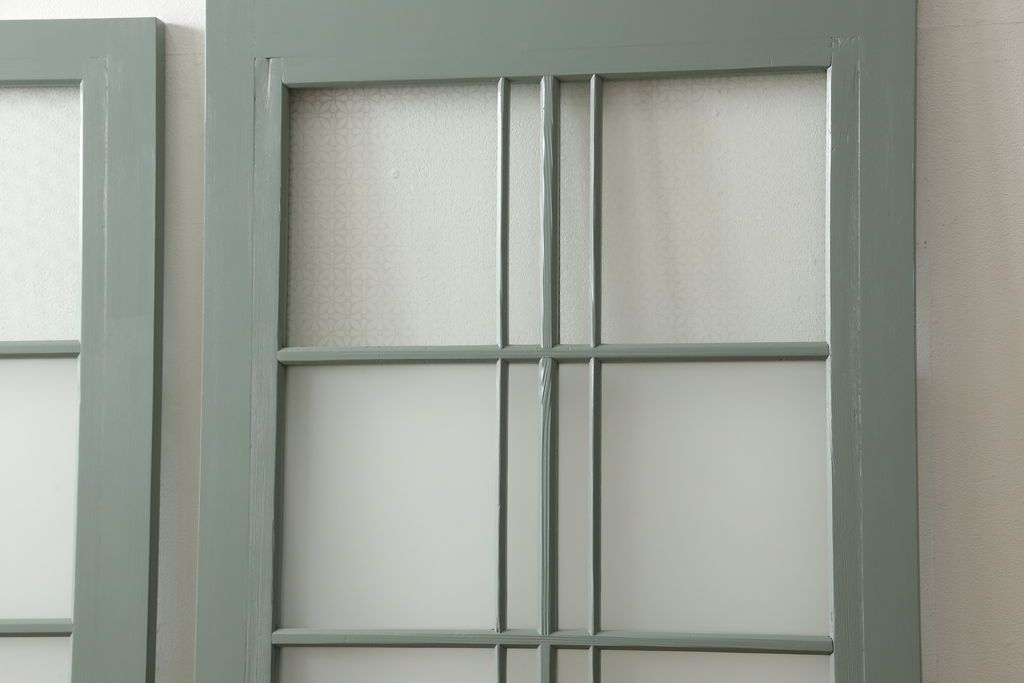 ドア・建具> 引き戸 > 昭和初期のガラス戸2枚セットをリペア&カスタム!高さと幅をリサイズし、指定箇所を花菱模様・市松模様のガラスに差し替え。本体は青緑色にペイント仕上げ。(引き戸、建具)