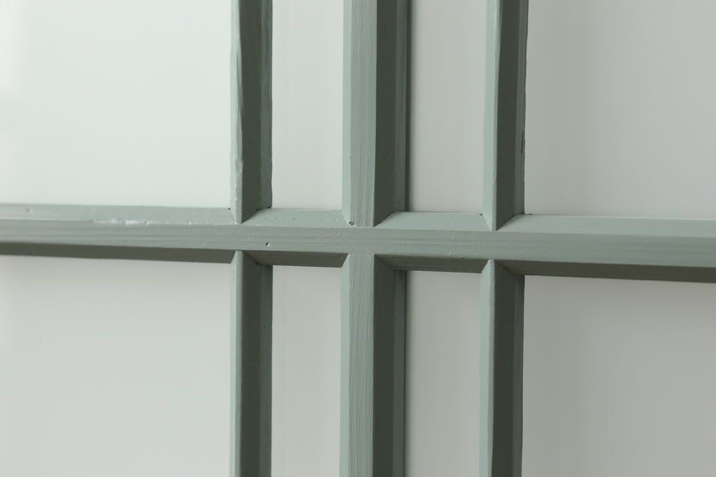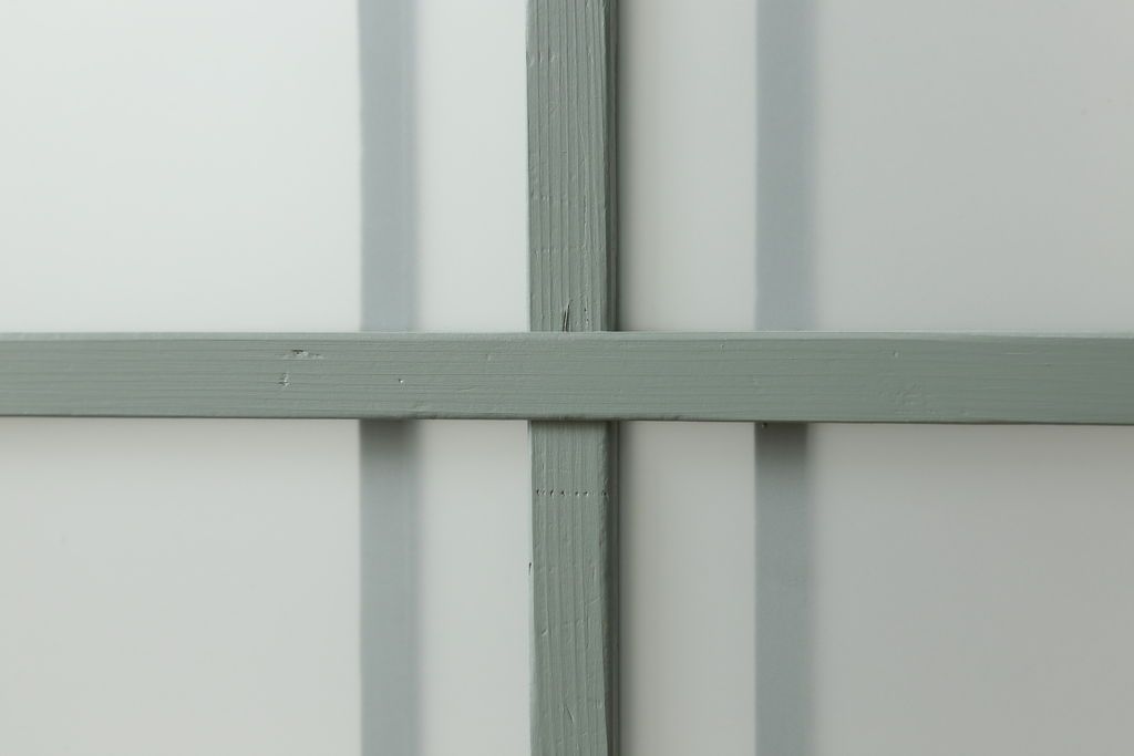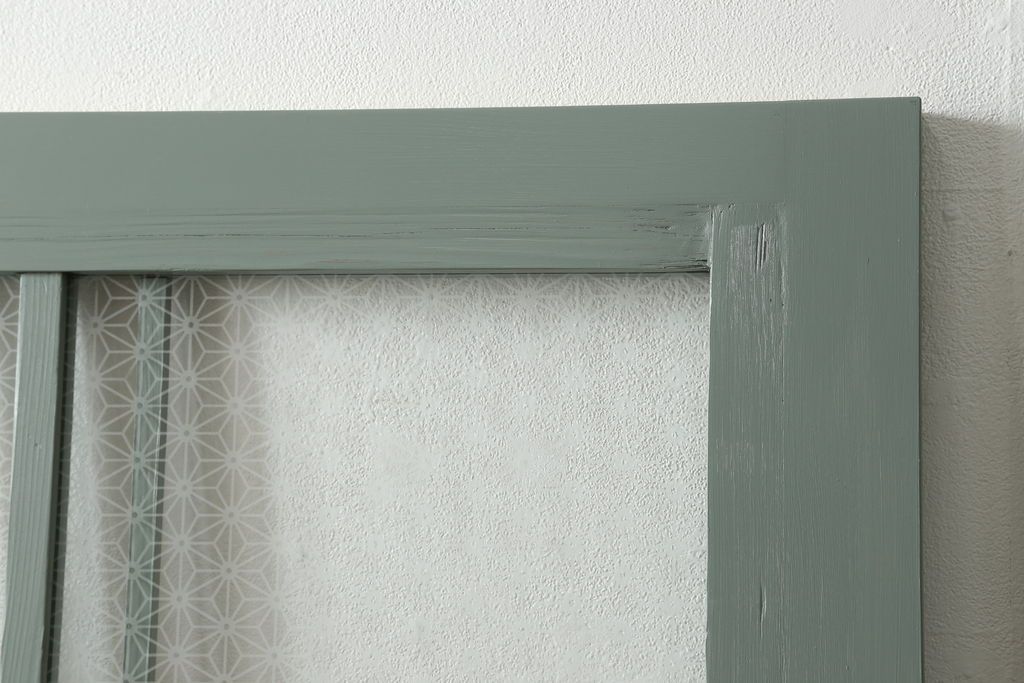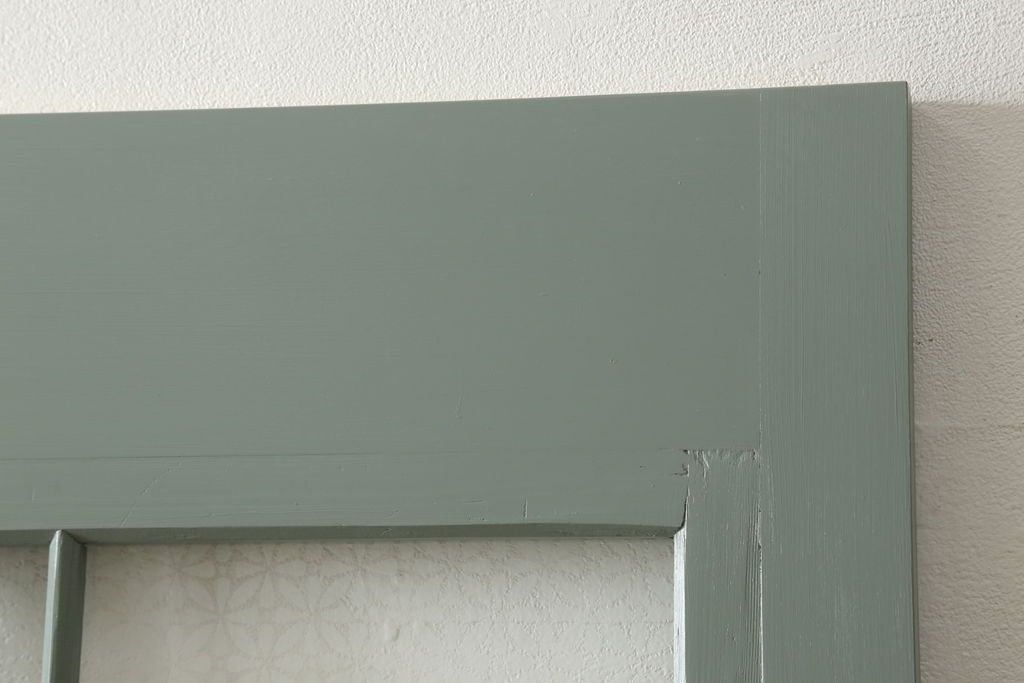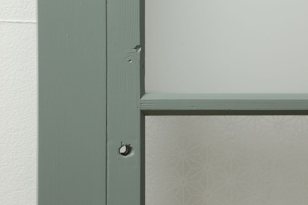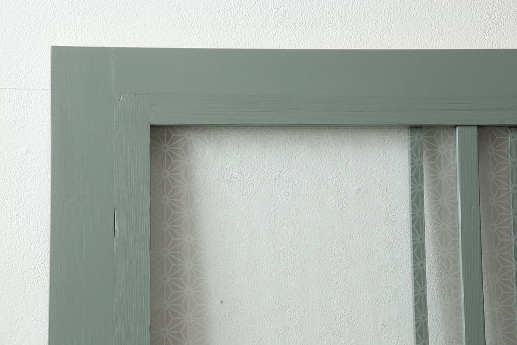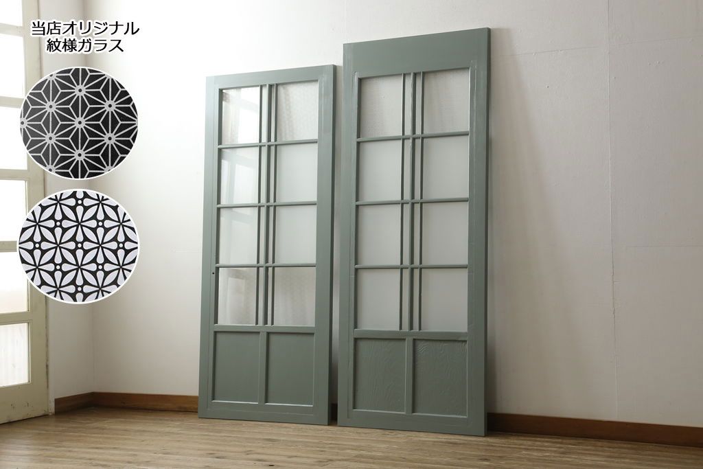 ドア・建具> 引き戸 > 昭和初期のガラス戸2枚セットをリペア&カスタム!高さと幅をリサイズし、指定箇所を花菱模様・市松模様のガラスに差し替え。本体は青緑色にペイント仕上げ。(引き戸、建具)
