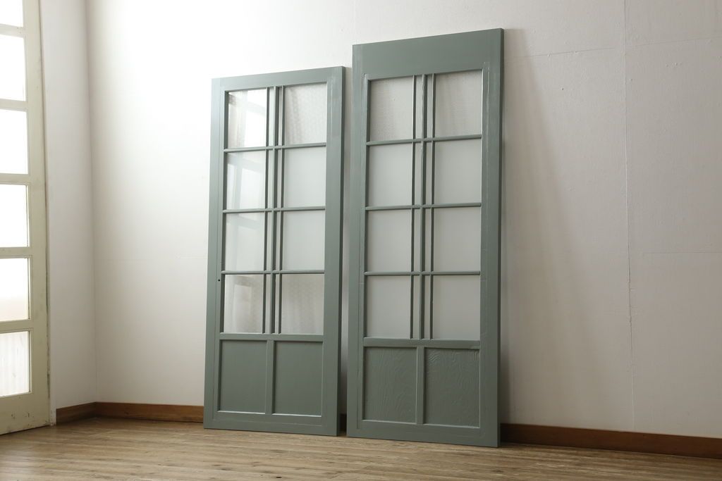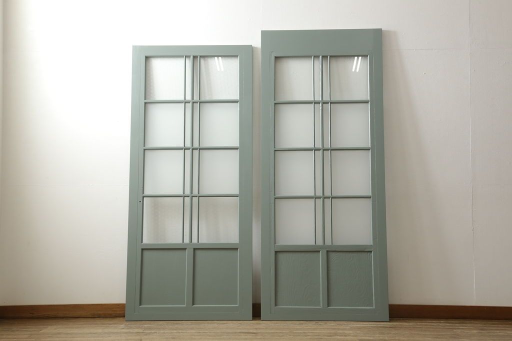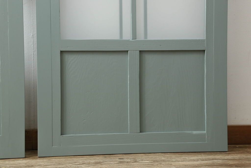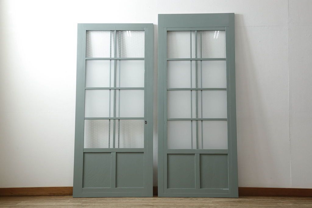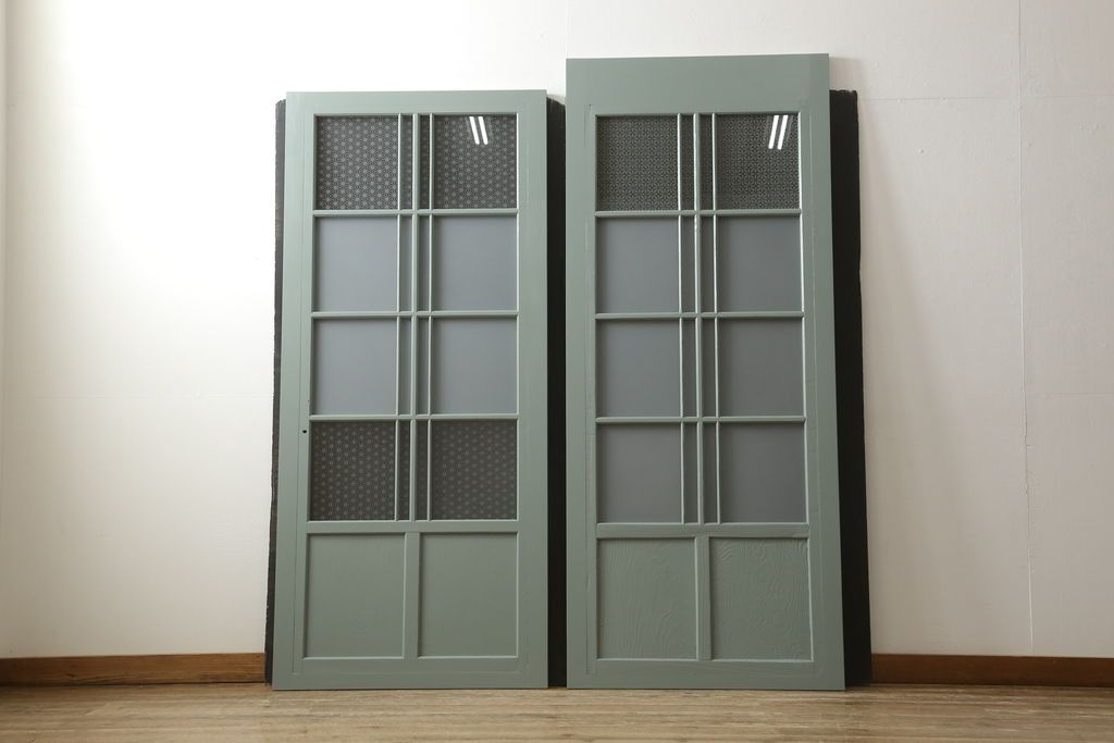 ドア・建具> 2枚・3枚セット > 昭和初期のガラス戸2枚セットをリペア&カスタム!高さと幅をリサイズし、指定箇所を花菱模様・市松模様のガラスに差し替え。本体は青緑色にペイント仕上げ。(引き戸、建具)