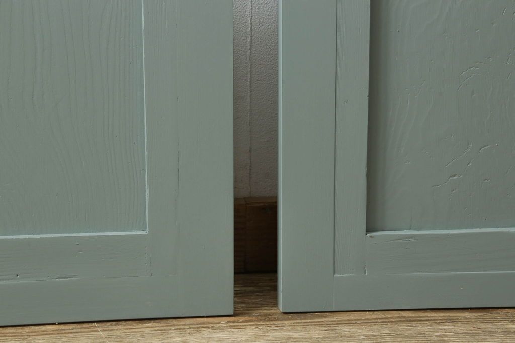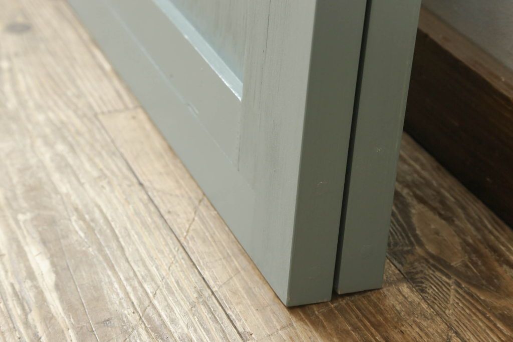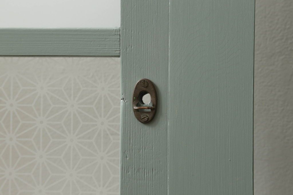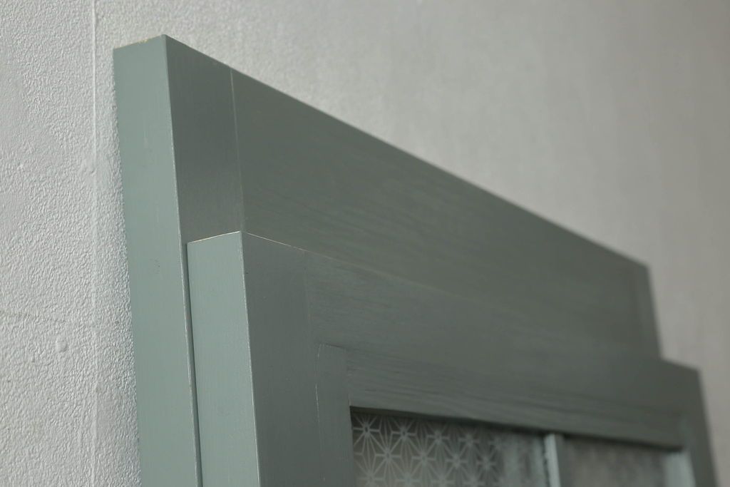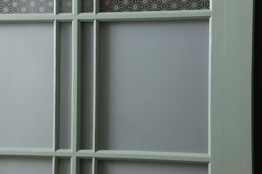 セミオーダー家具実績 > 昭和初期のガラス戸2枚セットをリペア&カスタム!高さと幅をリサイズし、指定箇所を花菱模様・市松模様のガラスに差し替え。本体は青緑色にペイント仕上げ。(引き戸、建具)