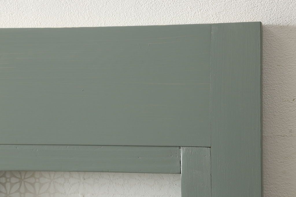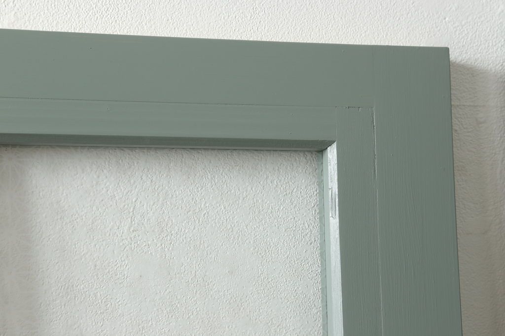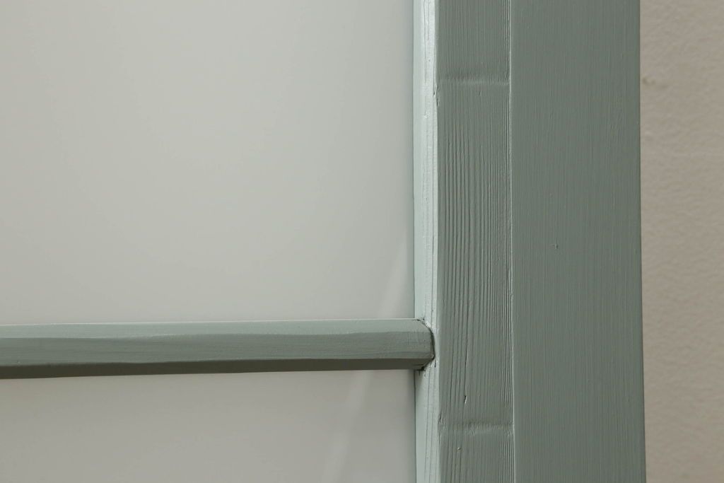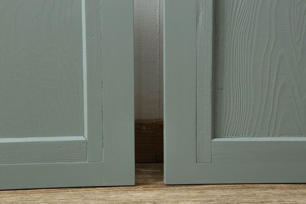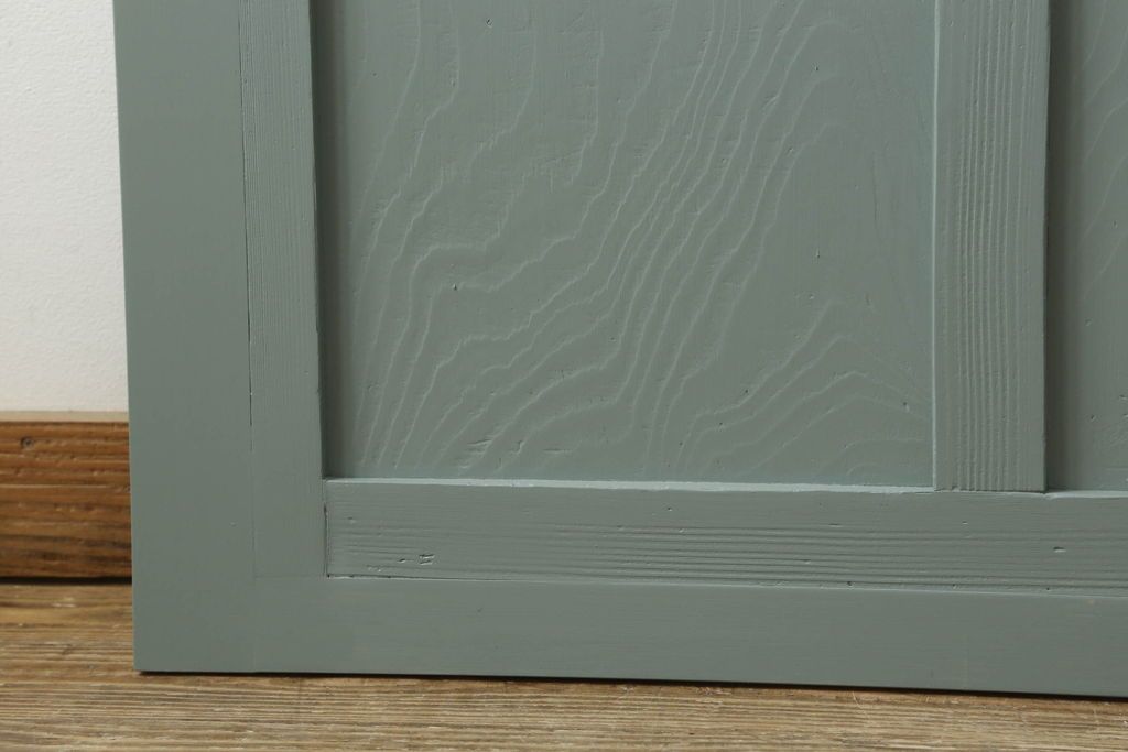 セミオーダー家具実績 > 昭和初期のガラス戸2枚セットをリペア&カスタム!高さと幅をリサイズし、指定箇所を花菱模様・市松模様のガラスに差し替え。本体は青緑色にペイント仕上げ。(引き戸、建具)
