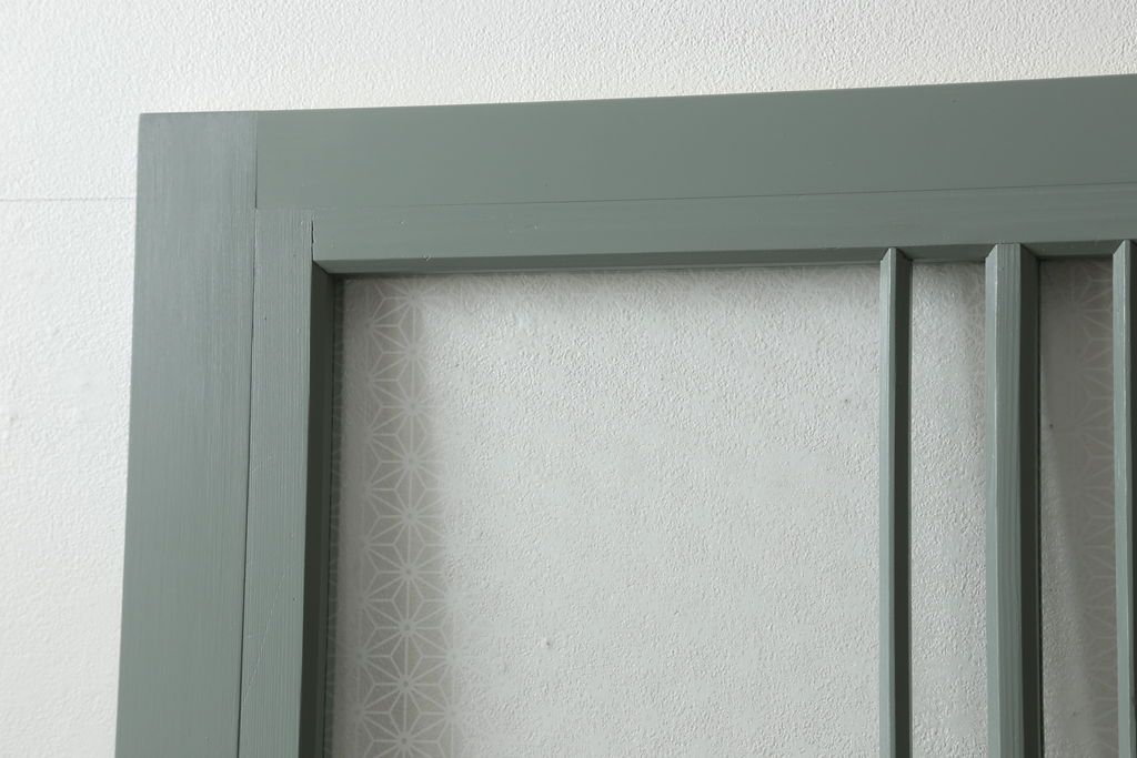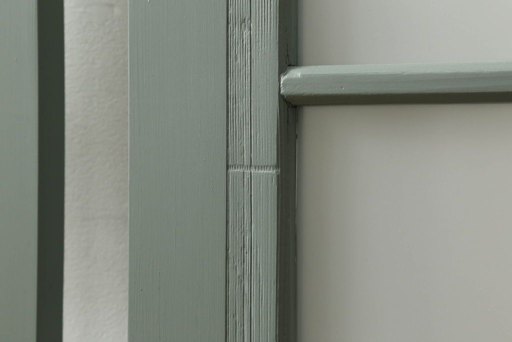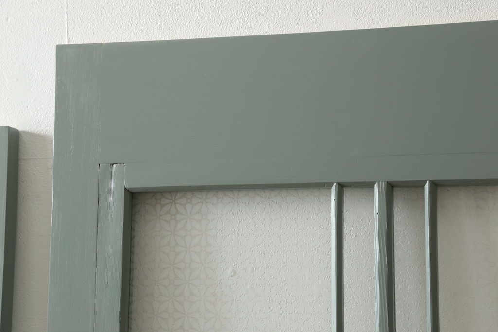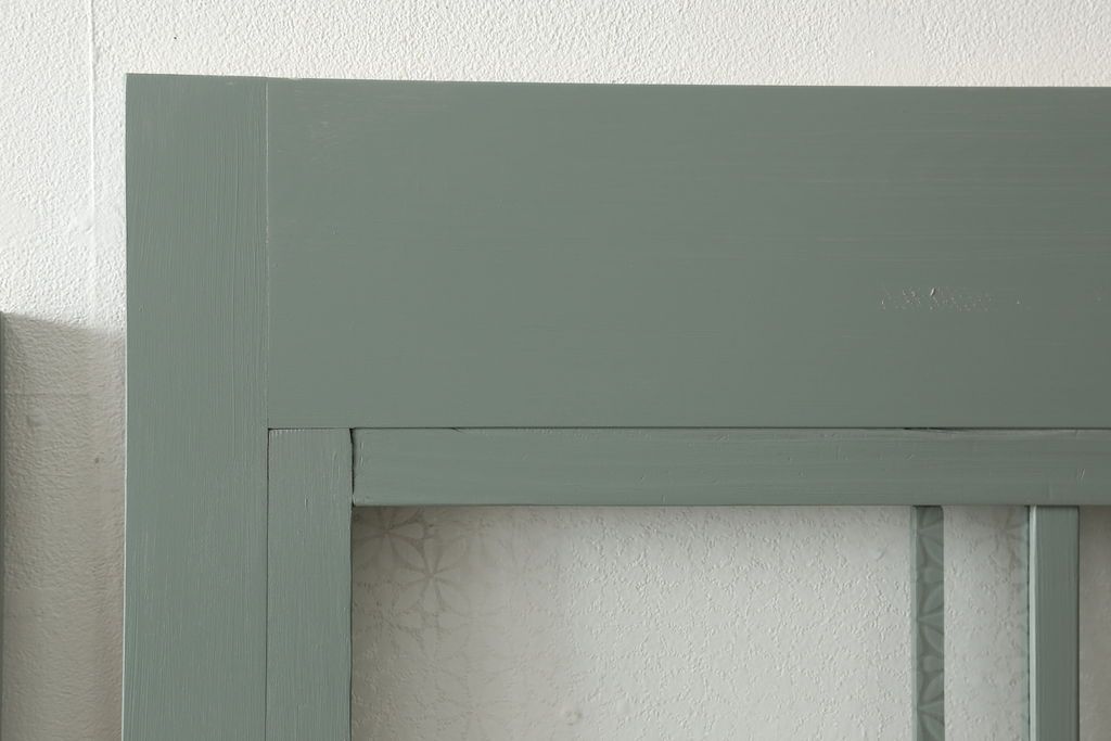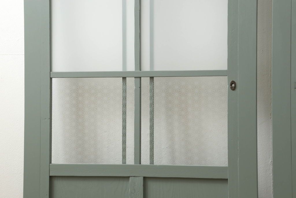 ドア・建具> ガラス戸 > 昭和初期のガラス戸2枚セットをリペア&カスタム!高さと幅をリサイズし、指定箇所を花菱模様・市松模様のガラスに差し替え。本体は青緑色にペイント仕上げ。(引き戸、建具)