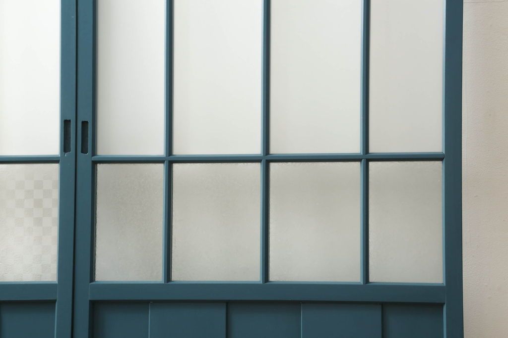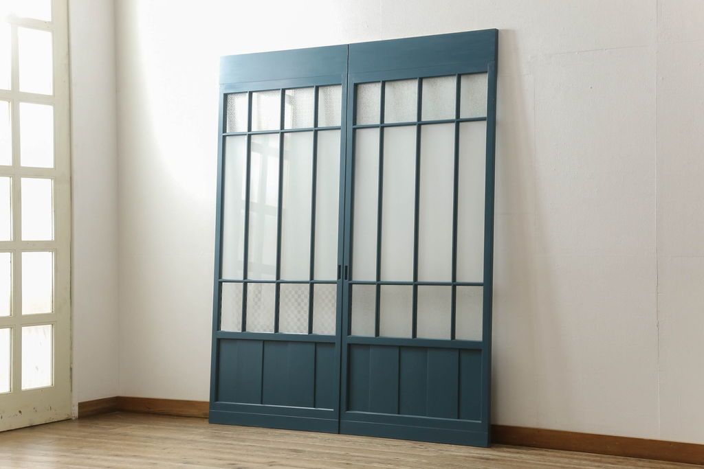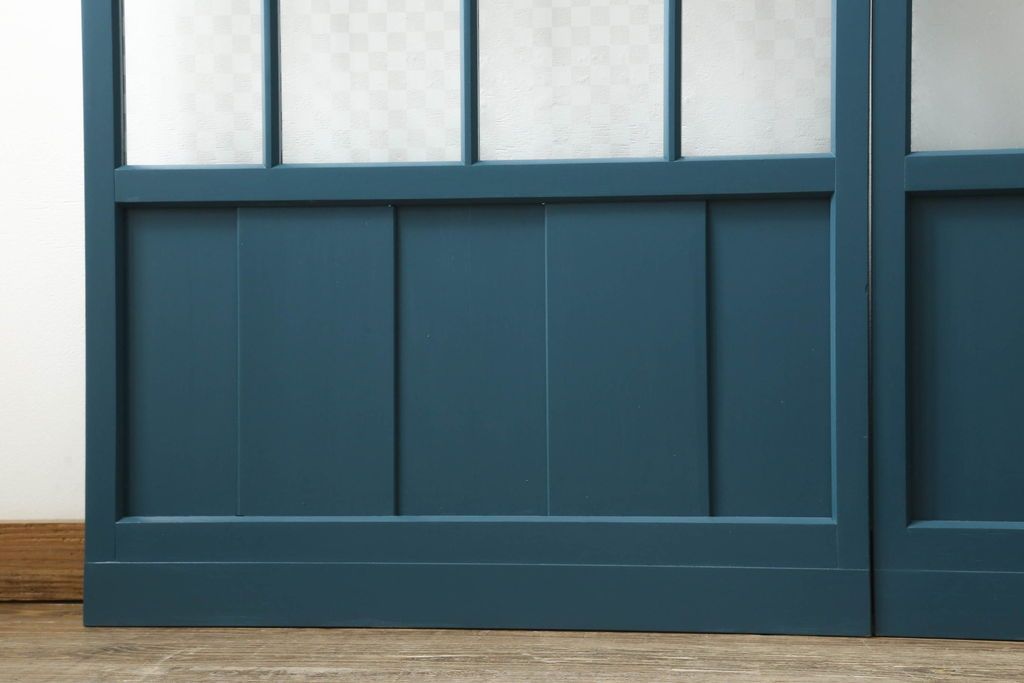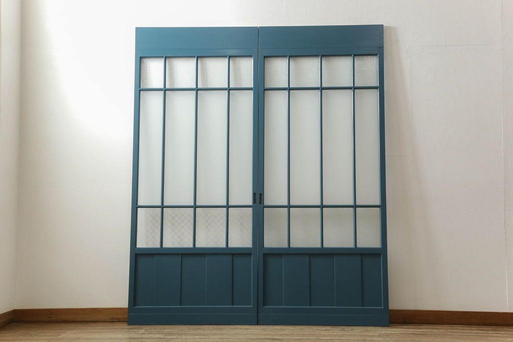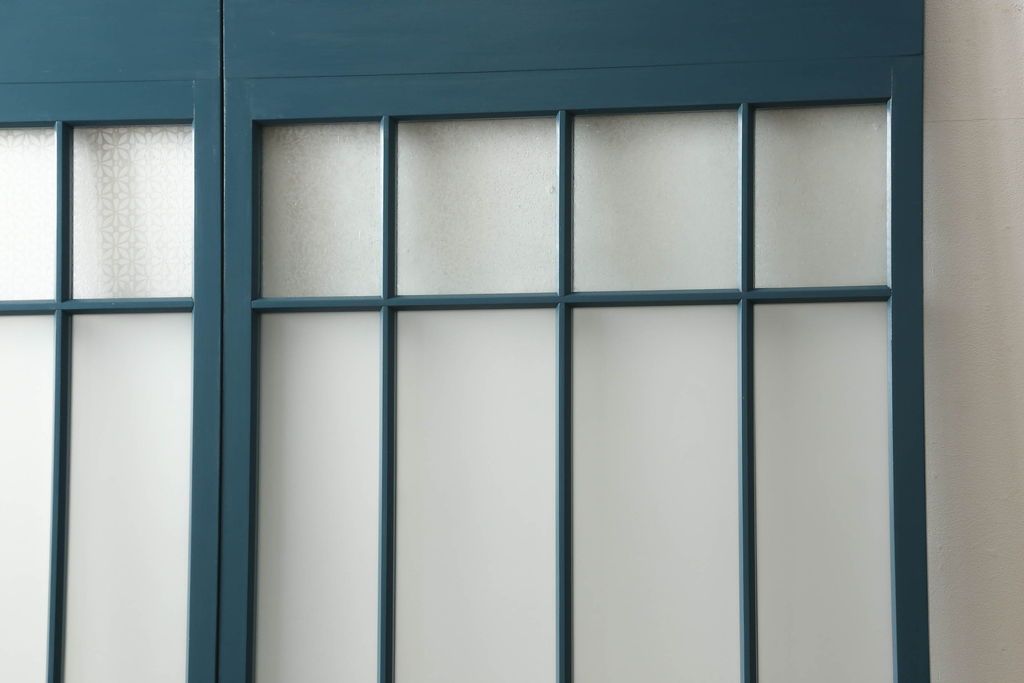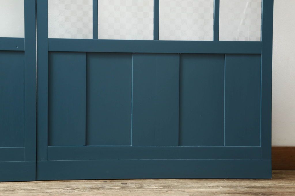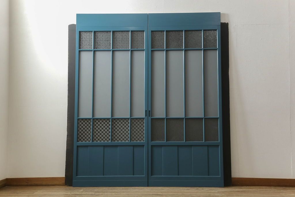 ドア・建具> 引き戸 > 昭和中期のガラス戸2枚セットをリペア&カスタム!高さと幅をリサイズし、指定箇所を花菱模様・市松模様のガラスに差し替え。本体は暗めの青色にペイント仕上げ。(引き戸、建具)