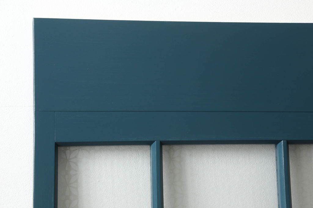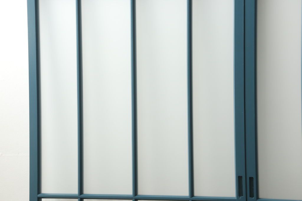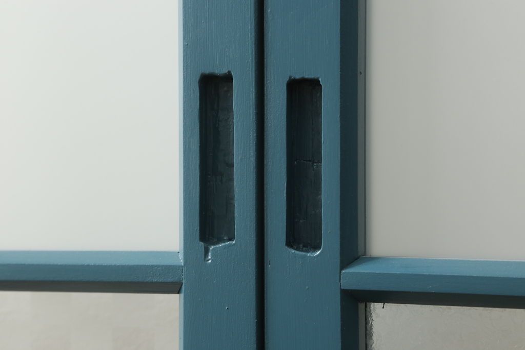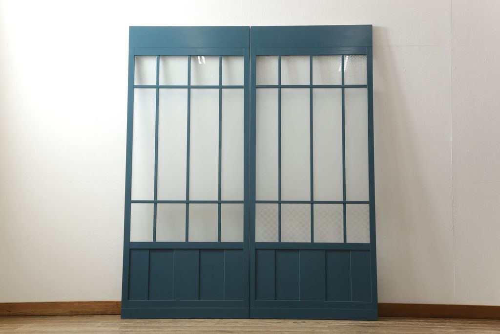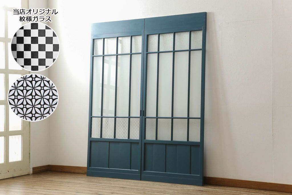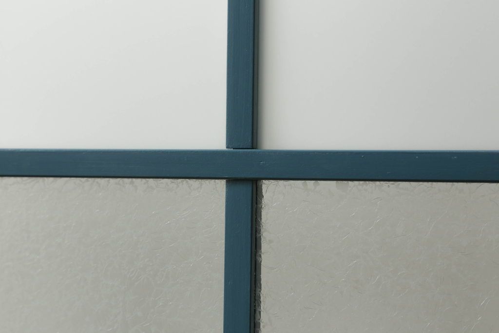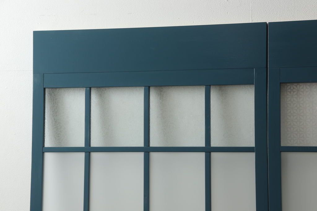 ドア・建具> 引き戸 > 昭和中期のガラス戸2枚セットをリペア&カスタム!高さと幅をリサイズし、指定箇所を花菱模様・市松模様のガラスに差し替え。本体は暗めの青色にペイント仕上げ。(引き戸、建具)