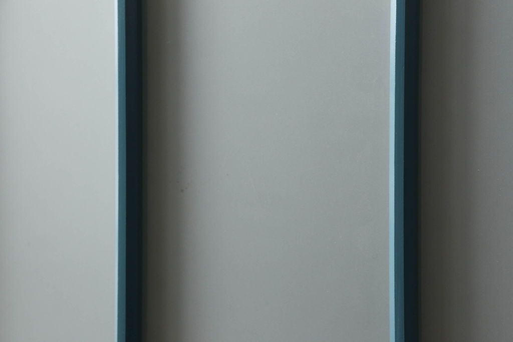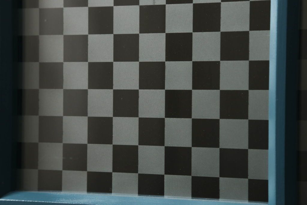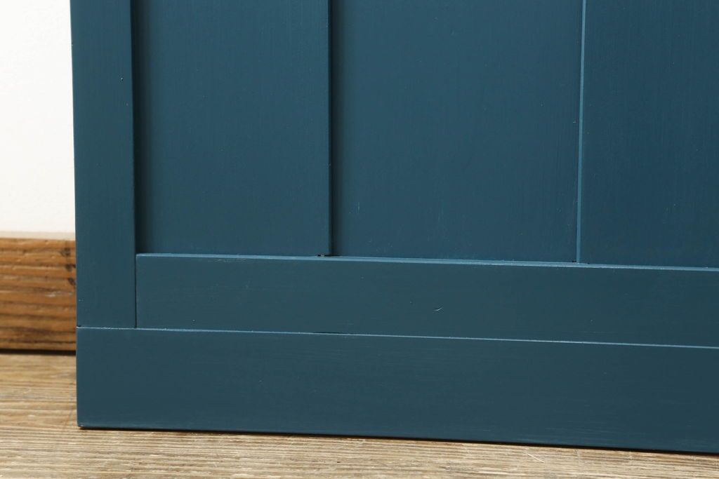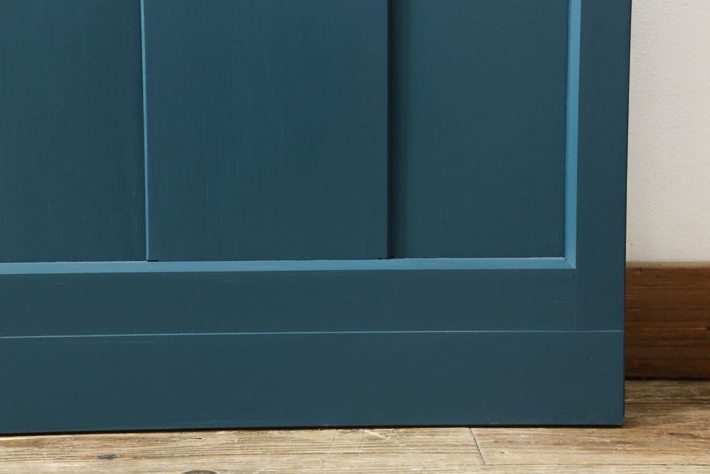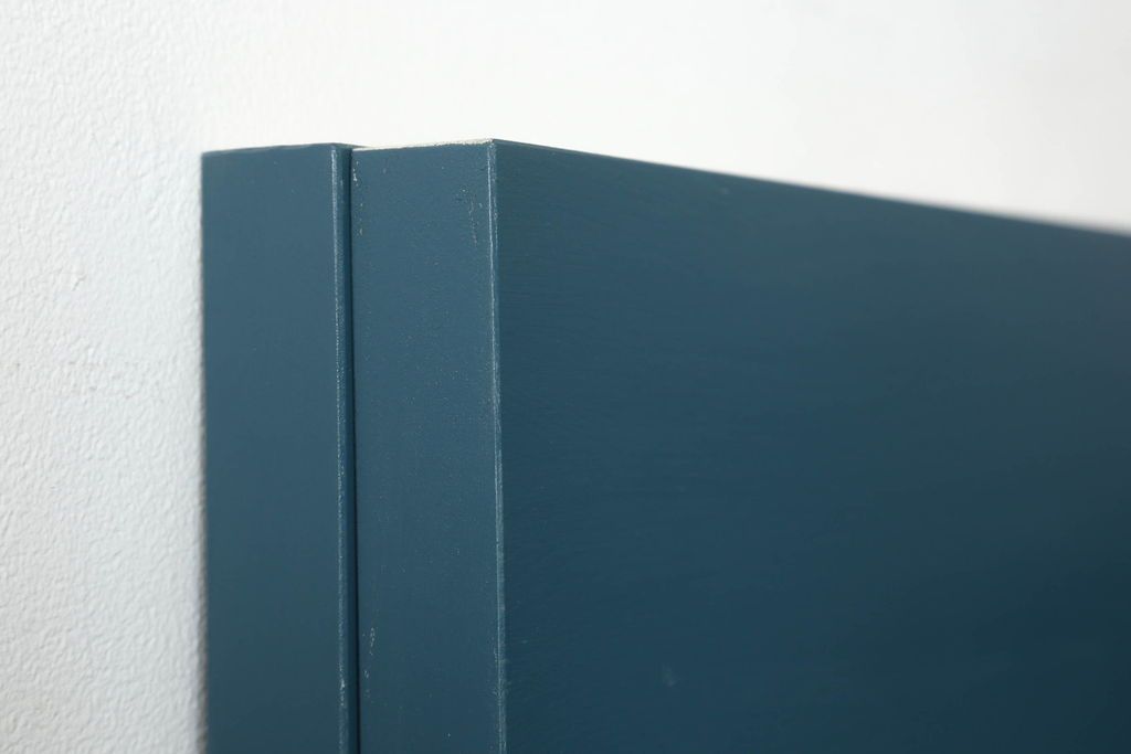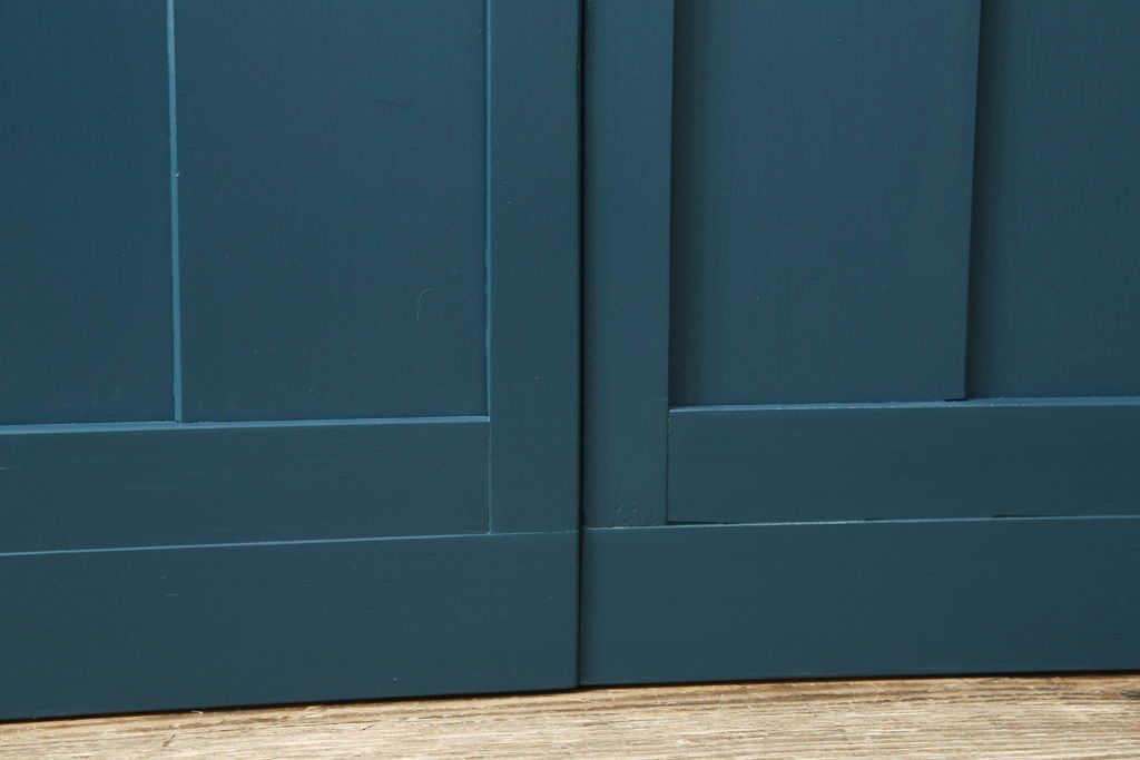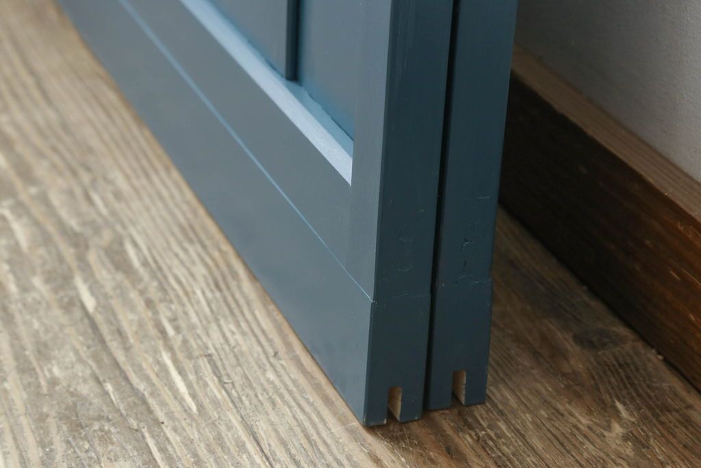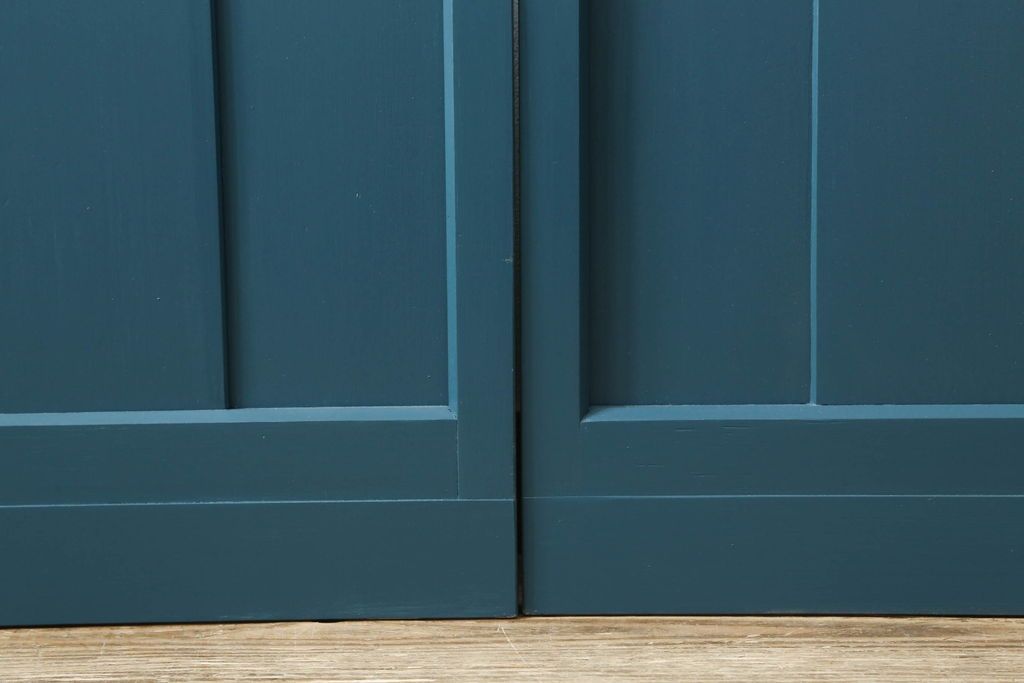 セミオーダー家具実績 > 昭和中期のガラス戸2枚セットをリペア&カスタム!高さと幅をリサイズし、指定箇所を花菱模様・市松模様のガラスに差し替え。本体は暗めの青色にペイント仕上げ。(引き戸、建具)