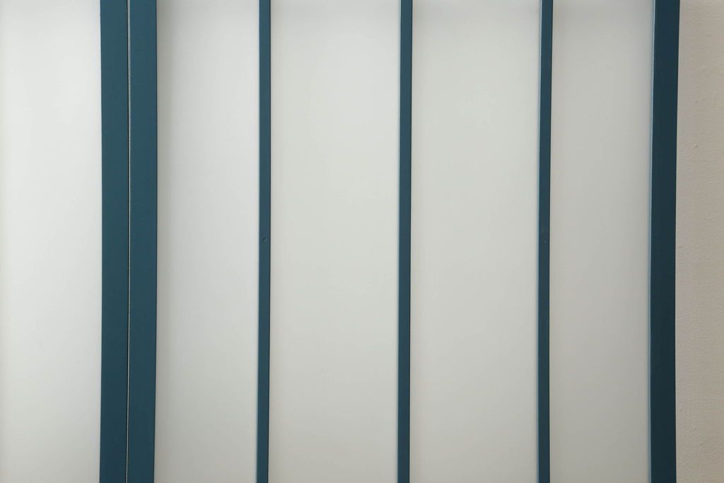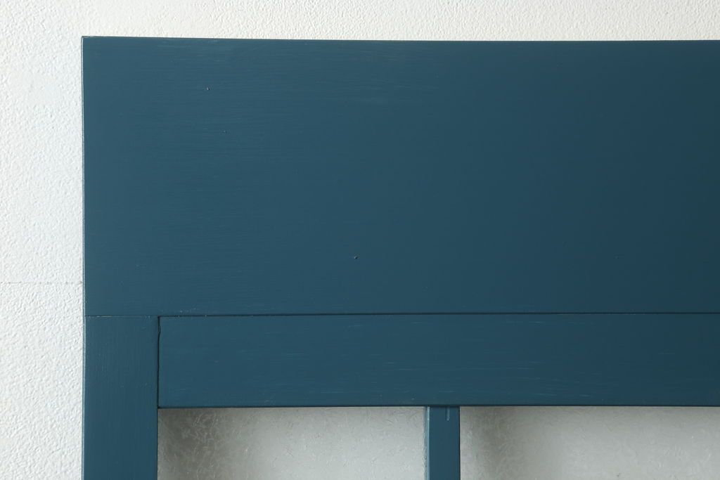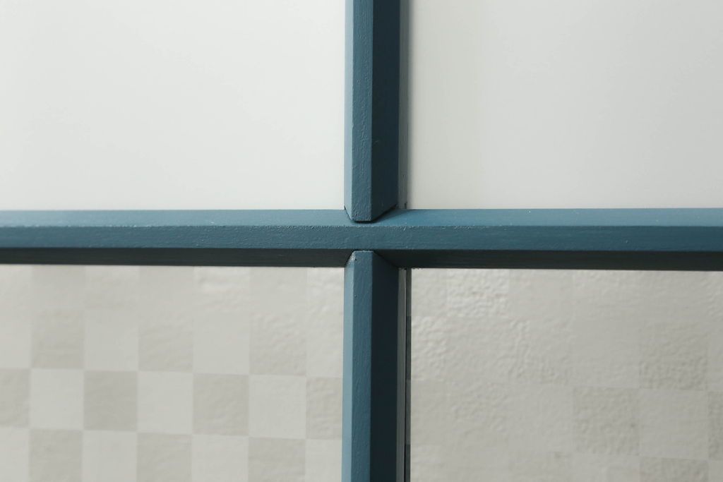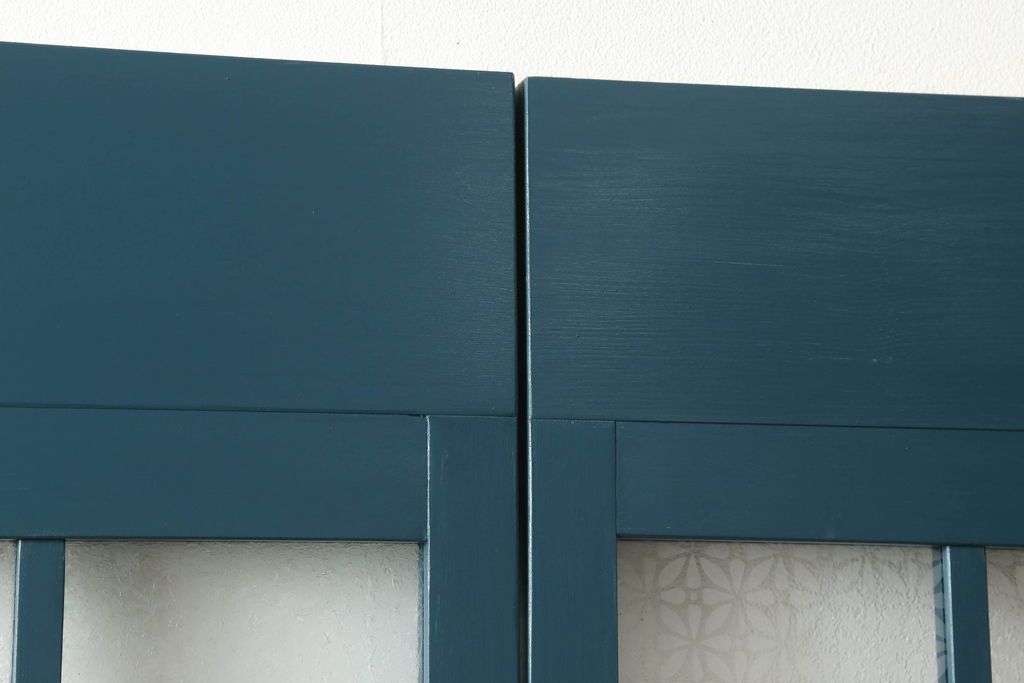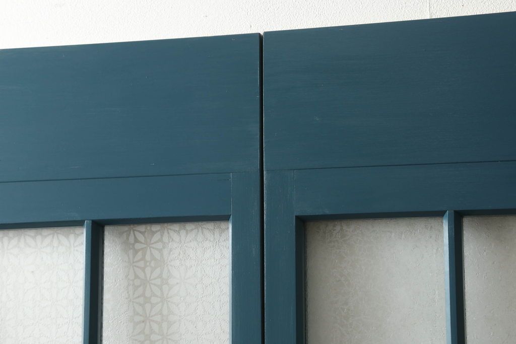 ドア・建具> ガラス戸 > 昭和中期のガラス戸2枚セットをリペア&カスタム!高さと幅をリサイズし、指定箇所を花菱模様・市松模様のガラスに差し替え。本体は暗めの青色にペイント仕上げ。(引き戸、建具)