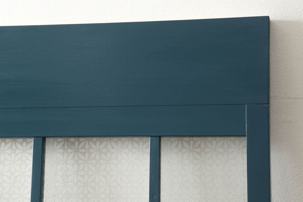 昭和中期のガラス戸2枚セットをリペア&カスタム!高さと幅をリサイズし、指定箇所を花菱模様・市松模様のガラスに差し替え。本体は暗めの青色にペイント仕上げ。(引き戸、建具)