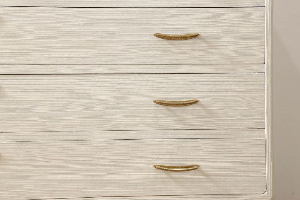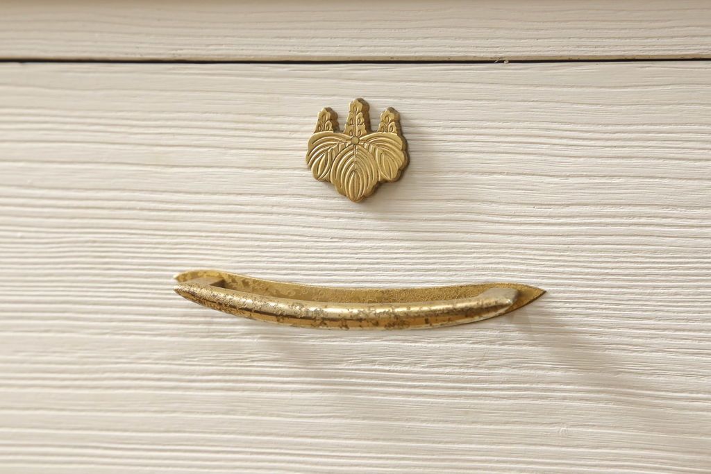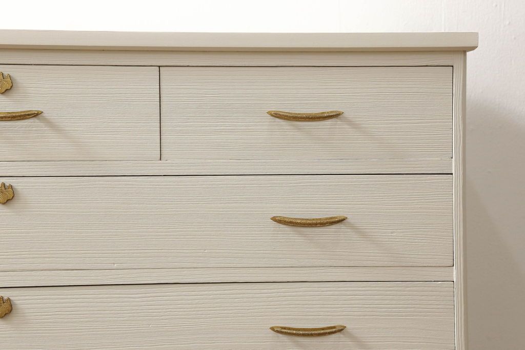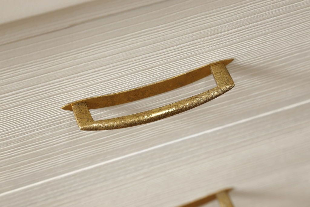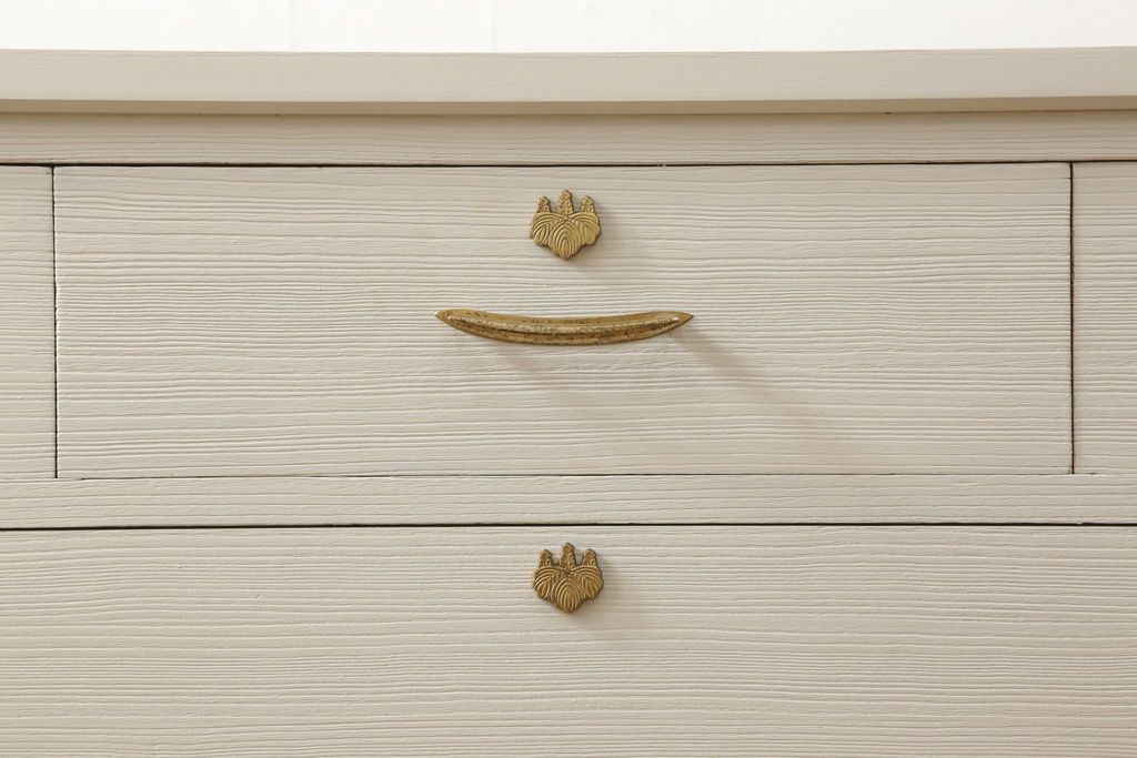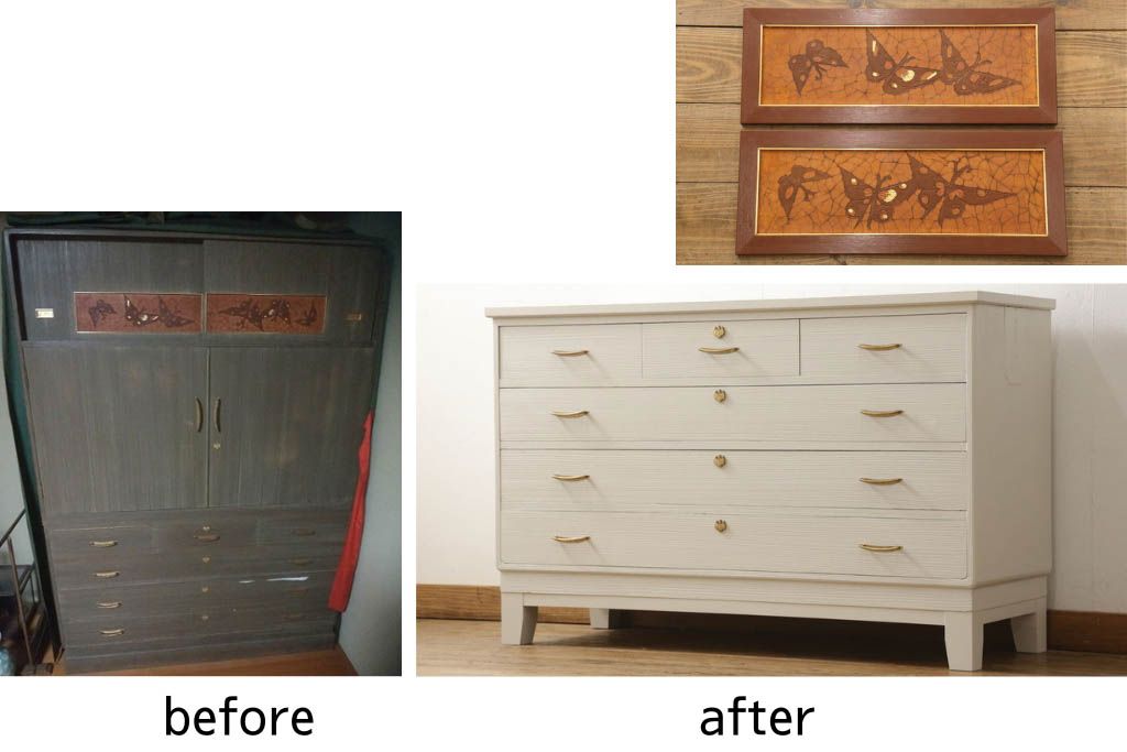 桐箪笥の下段をチェストにリメイク!ヒノキ材の天板と脚を取り付け、全体をアンティークホワイトでペイント仕上げ。上段引き戸の蝶の飾りは木枠を作製し壁掛けに。
