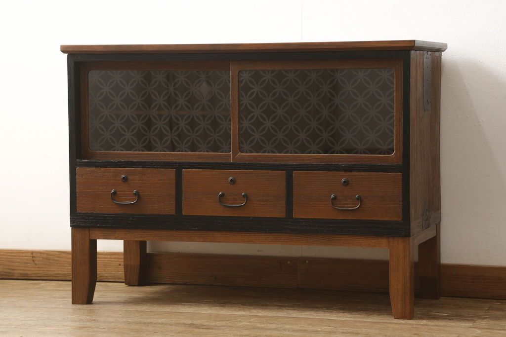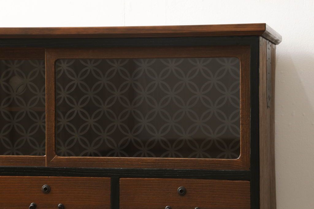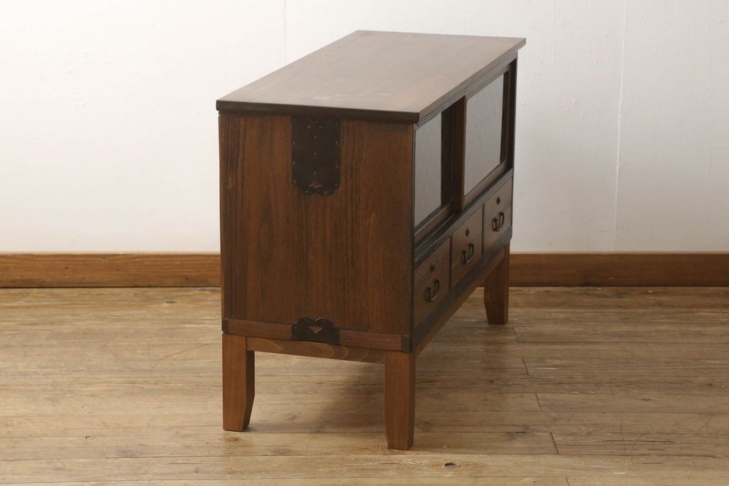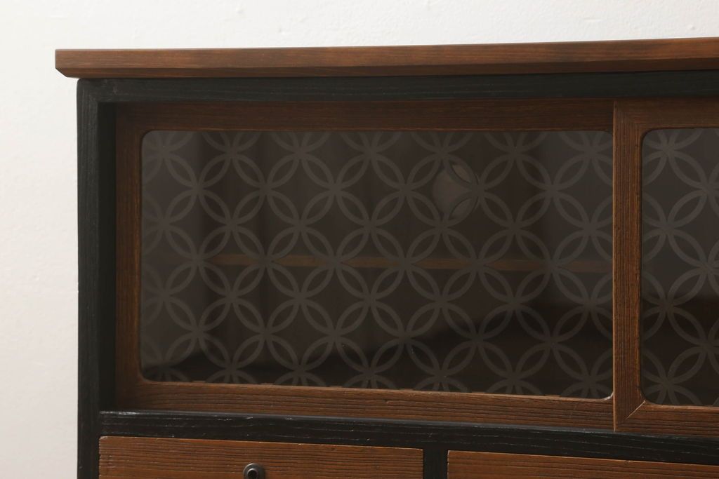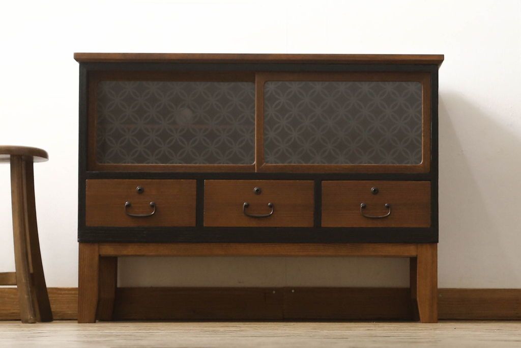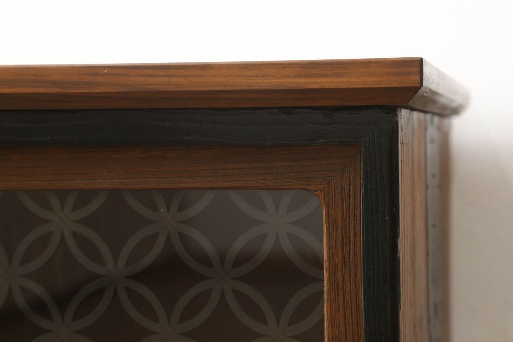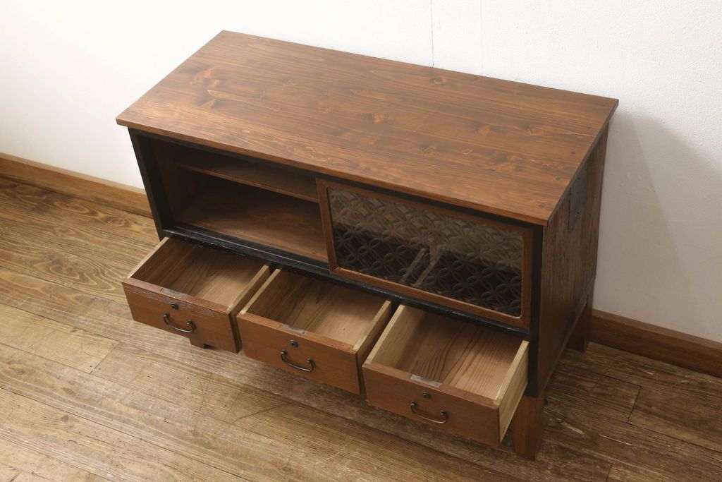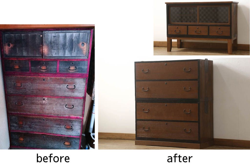 3段重ね桐箪笥をテレビボードとチェストへリメイク!上段は引き戸に組子ガラスを取り付け、天板、脚を追加。中下段は合わせてチェストに。全体を赤味のある茶系に着色し、縁部分は黒のカシュー漆で塗装。