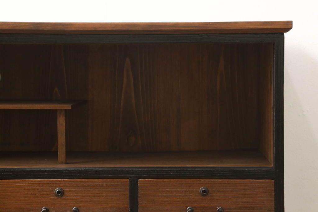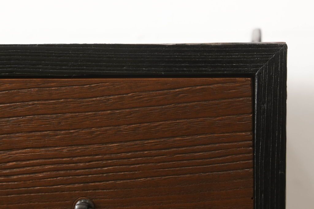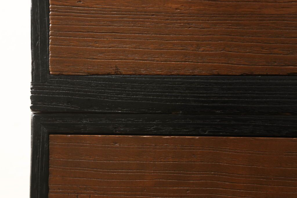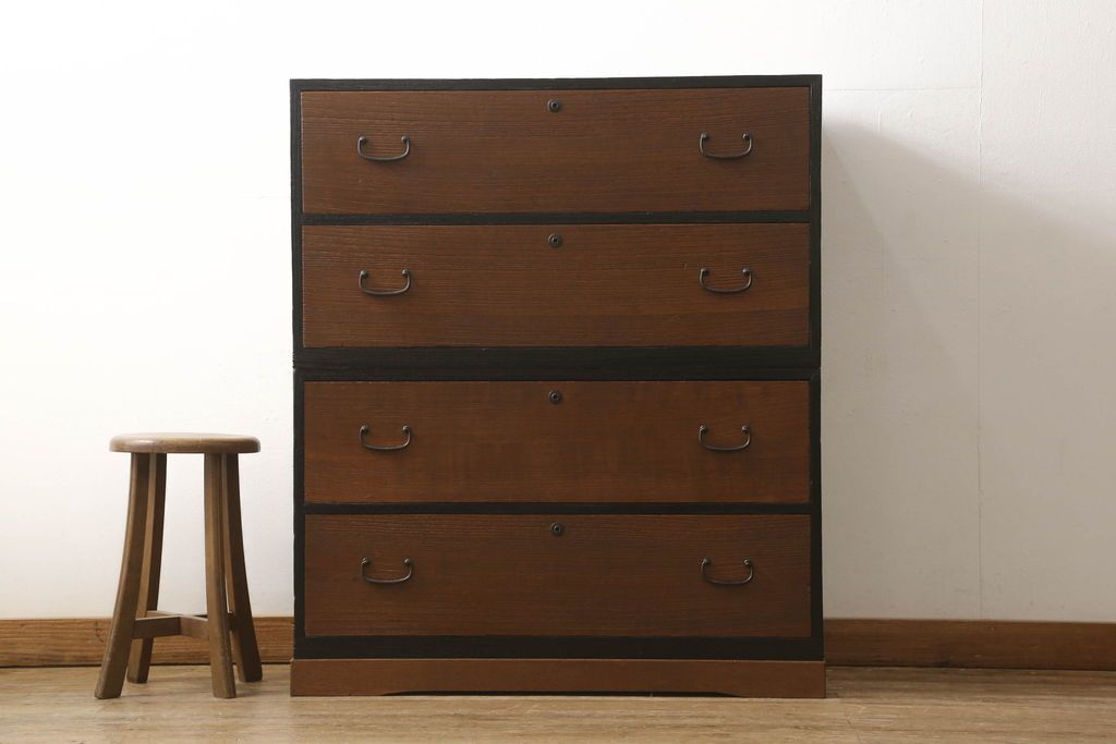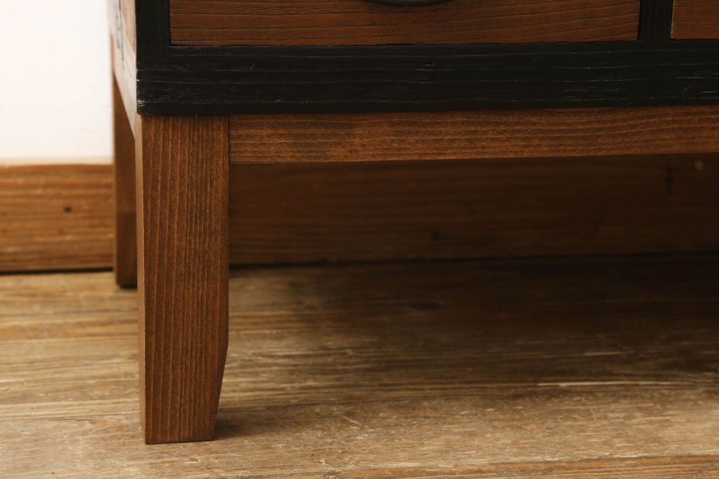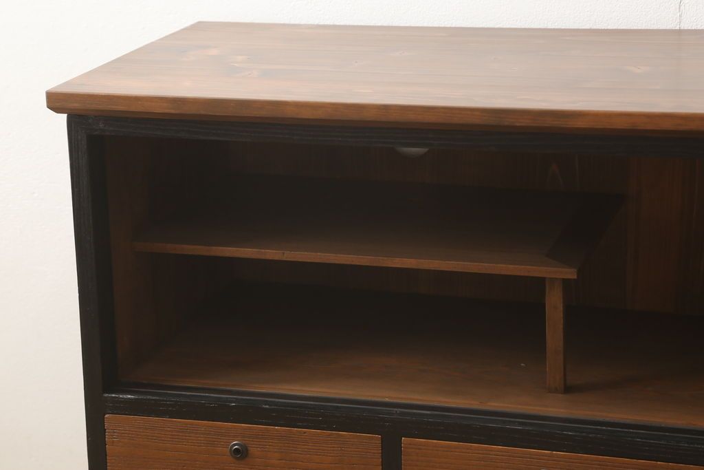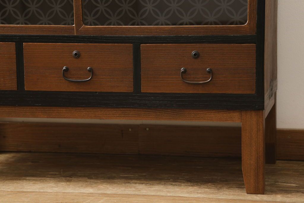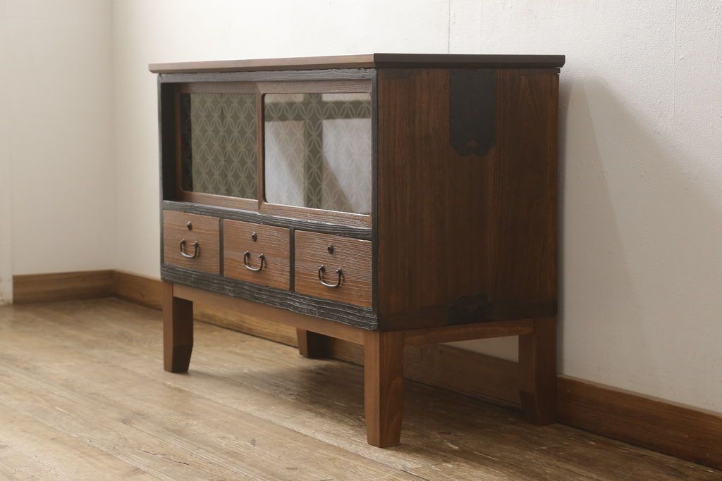 3段重ね桐箪笥をテレビボードとチェストへリメイク!上段は引き戸に組子ガラスを取り付け、天板、脚を追加。中下段は合わせてチェストに。全体を赤味のある茶系に着色し、縁部分は黒のカシュー漆で塗装。