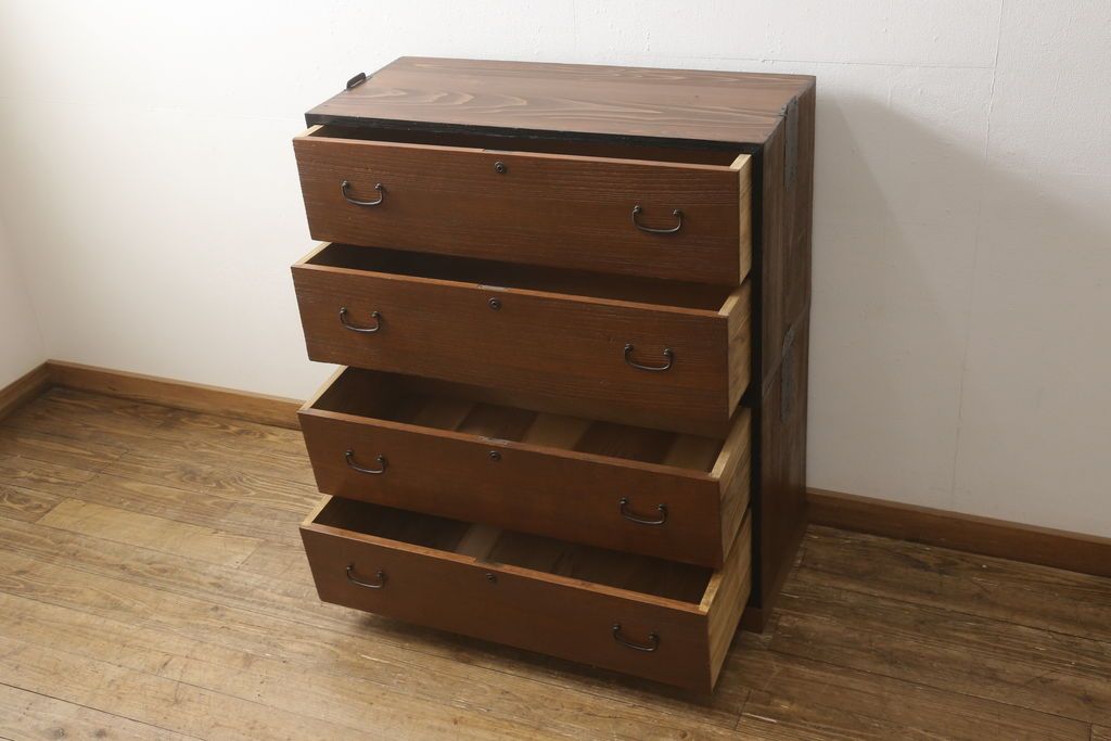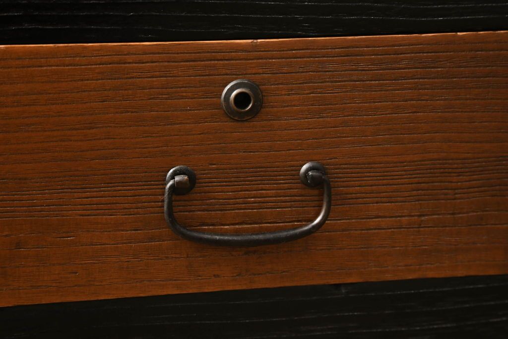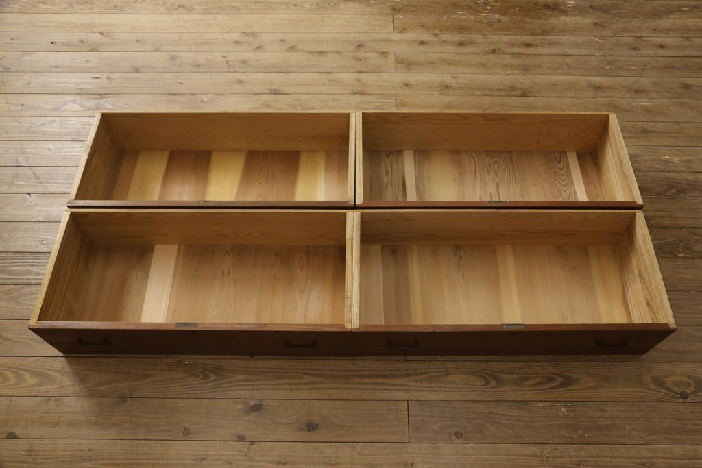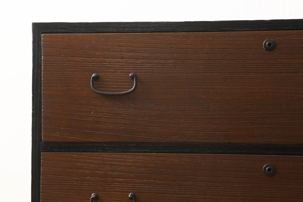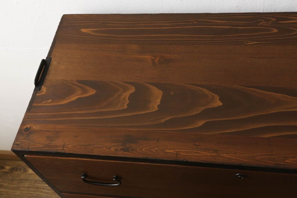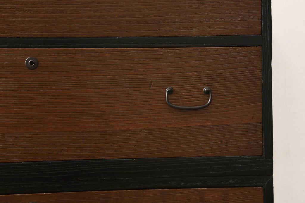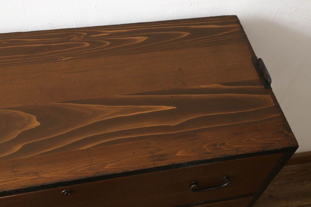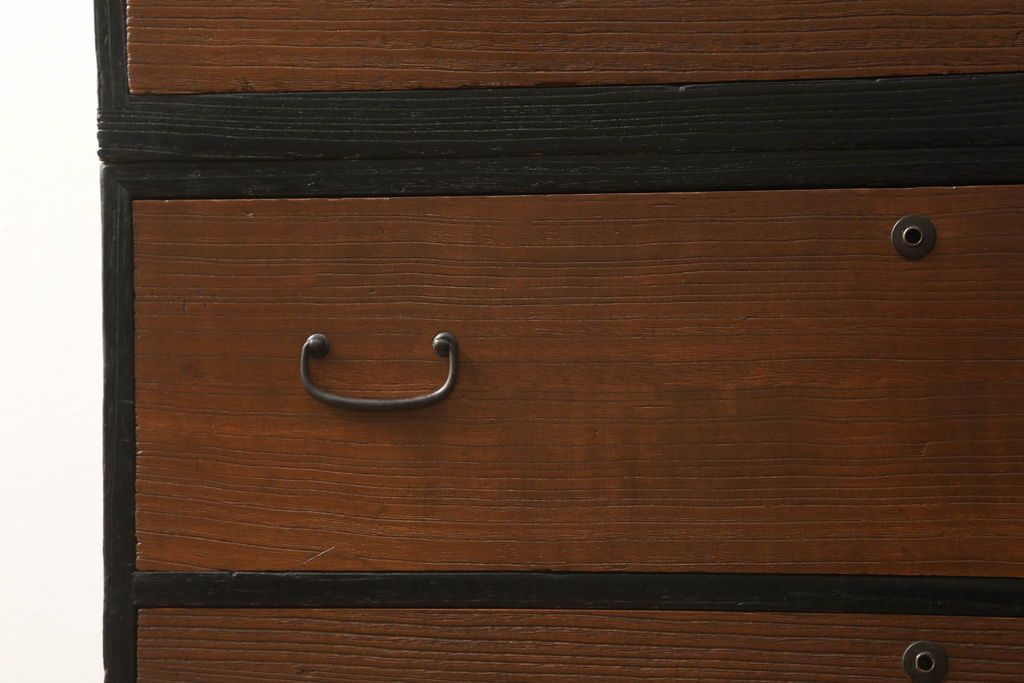 3段重ね桐箪笥をテレビボードとチェストへリメイク!上段は引き戸に組子ガラスを取り付け、天板、脚を追加。中下段は合わせてチェストに。全体を赤味のある茶系に着色し、縁部分は黒のカシュー漆で塗装。