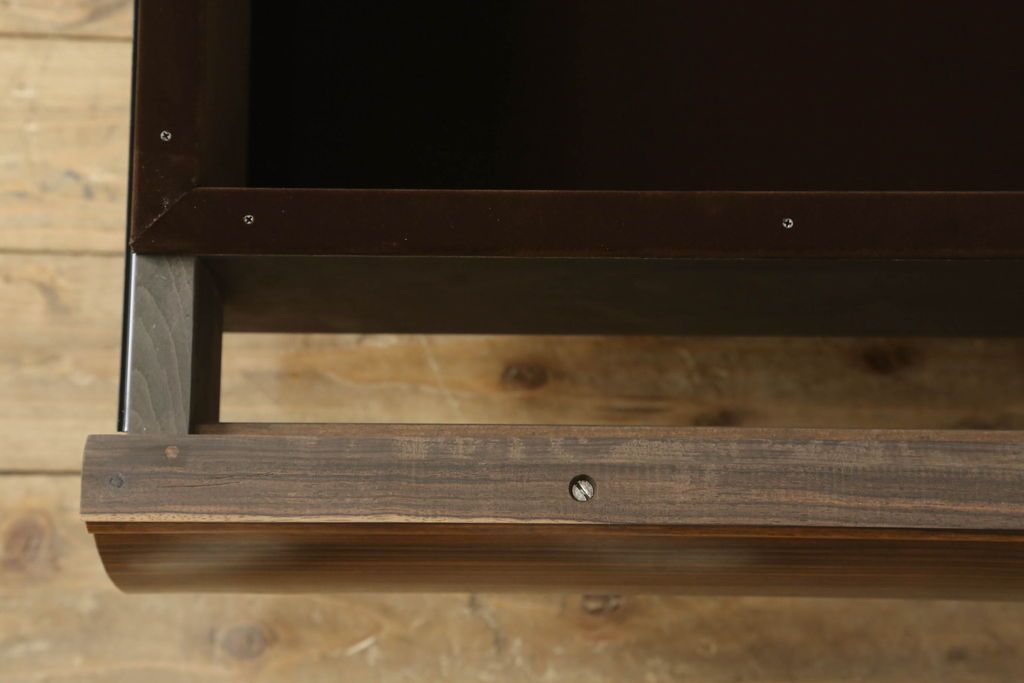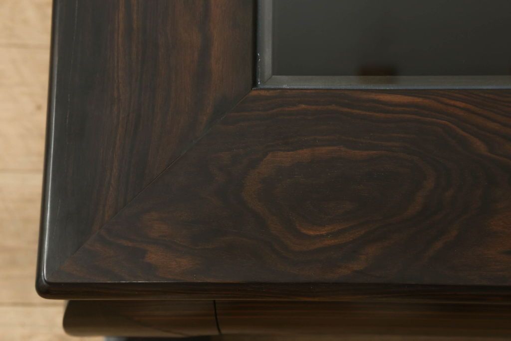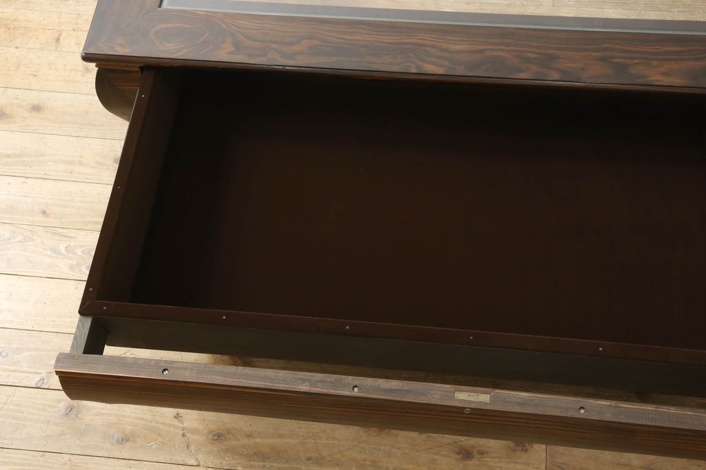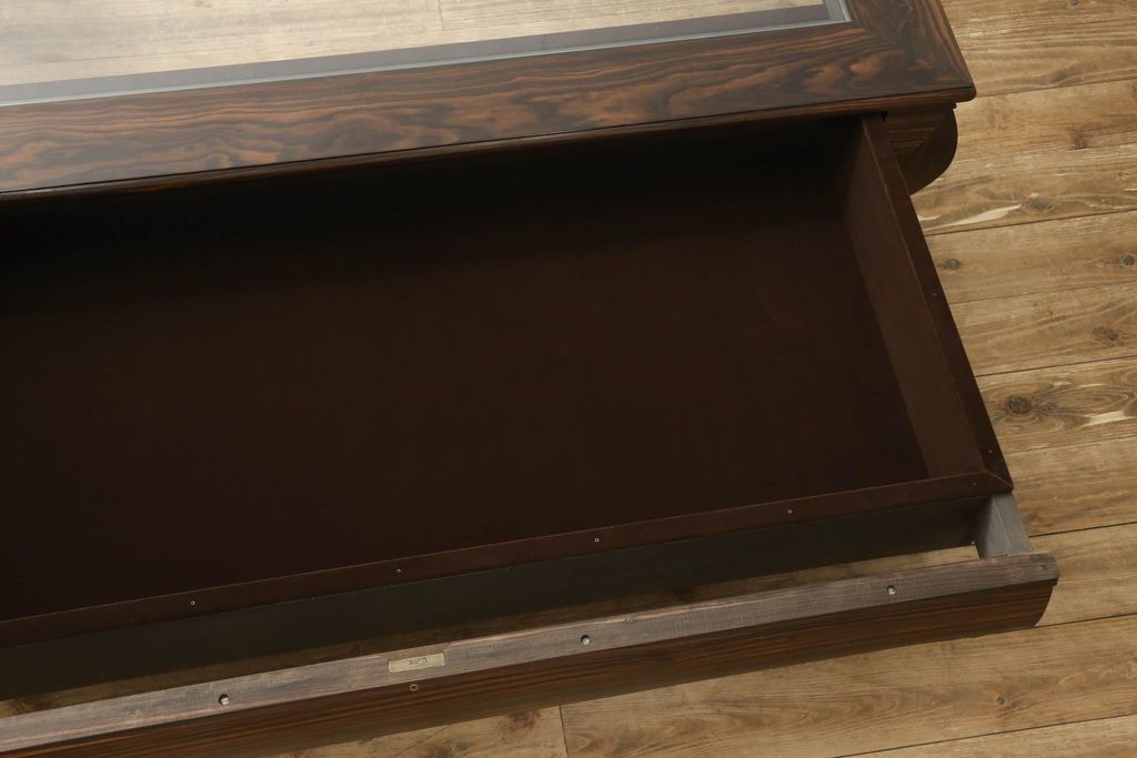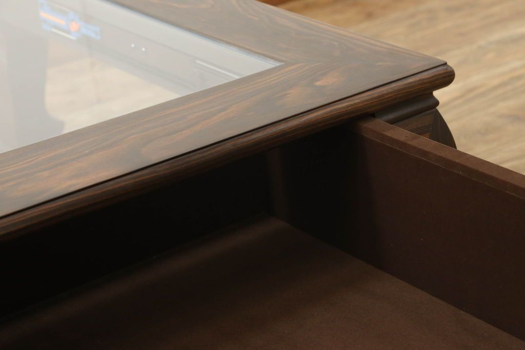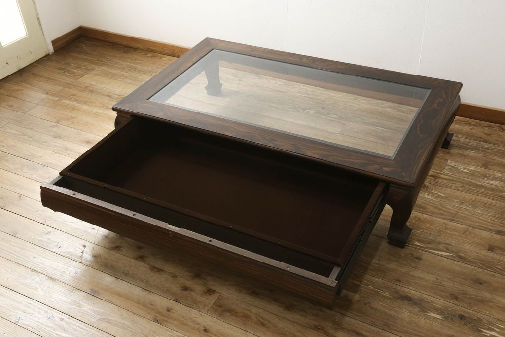 ラフジュ工房> ガラスケース・ショーケース > ビンテージの座卓をリペア&カスタム!天板をくり抜きガラス天板をはめ込み。ショーケース付き座卓にリメイク。ディスプレイスペースは鍵付きの引き出し仕様に加工。(ローテーブル、センターテーブル、ヴィンテージ)