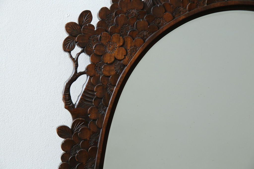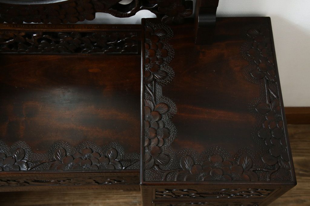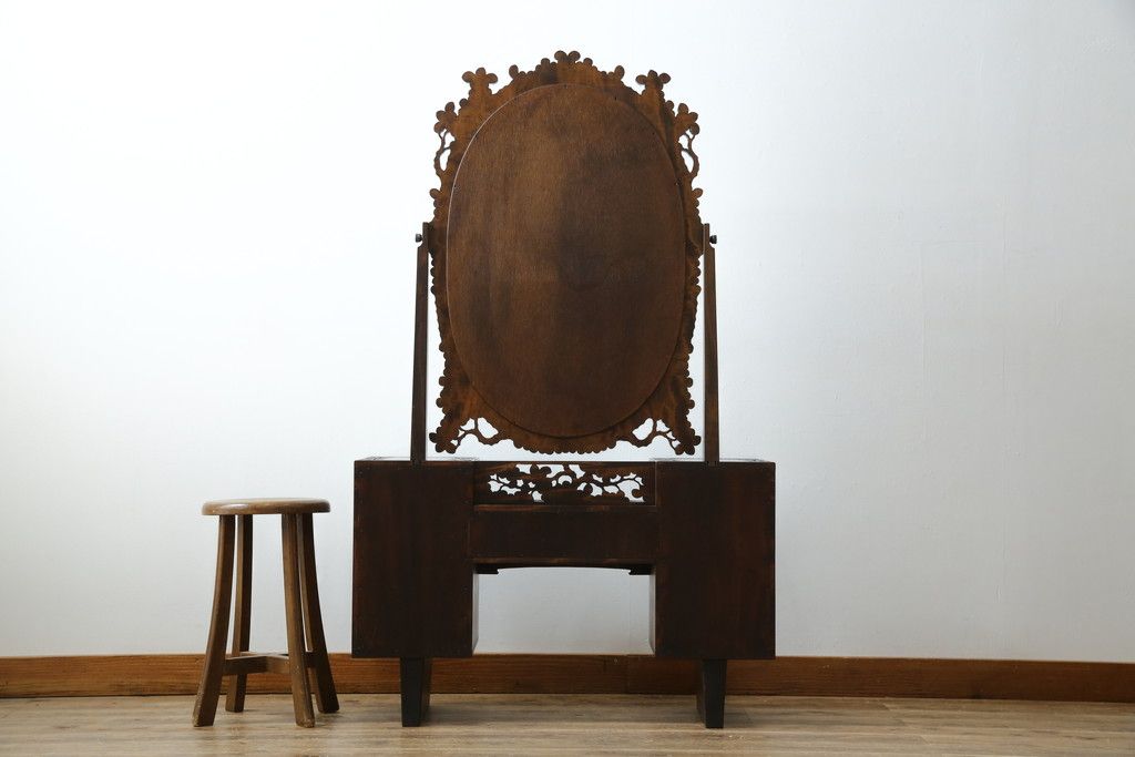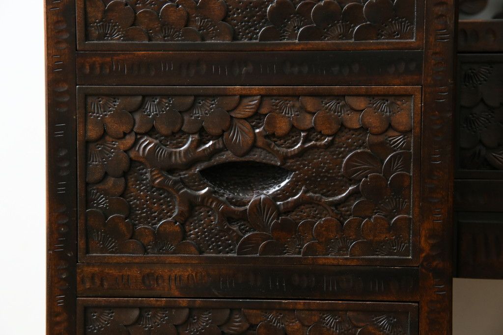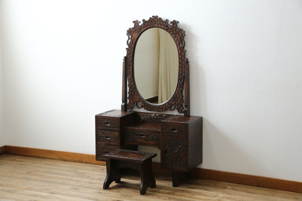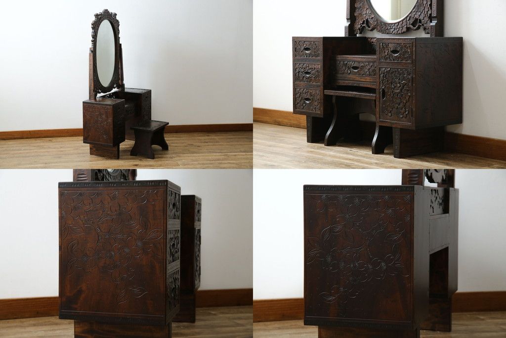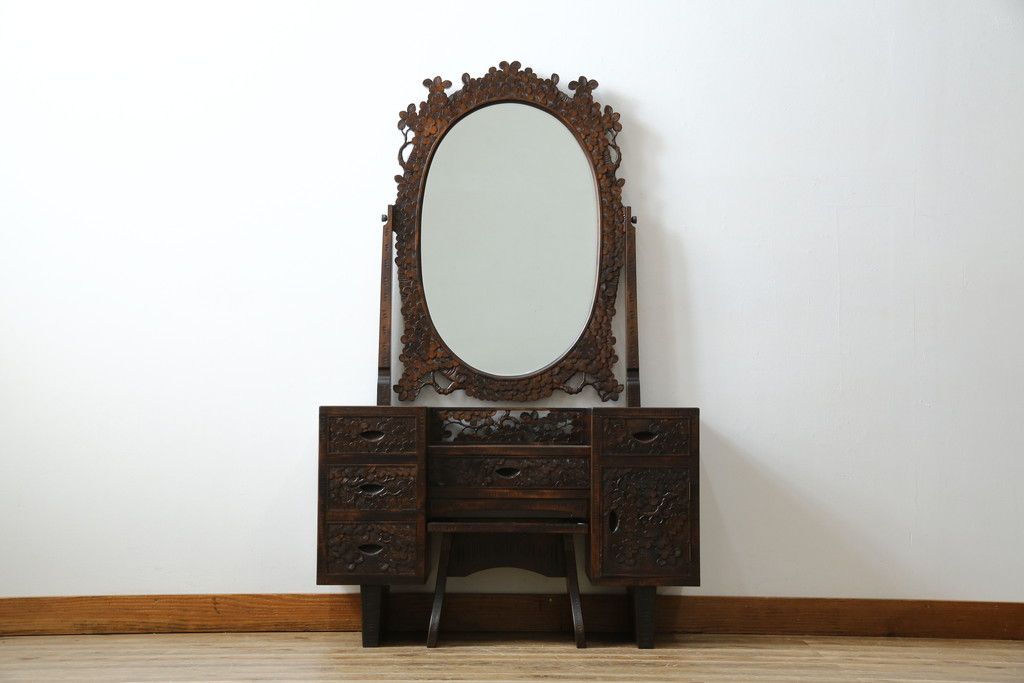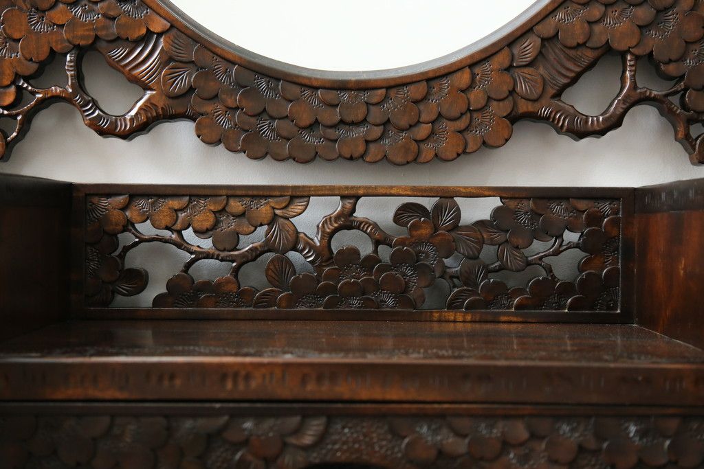 中古 軽井沢彫り 趣ある木の色合いと凝った桜の意匠が和の雰囲気を高めるドレッサーとスツールのセット(鏡台、化粧台、ミラー)(R-062577)です。