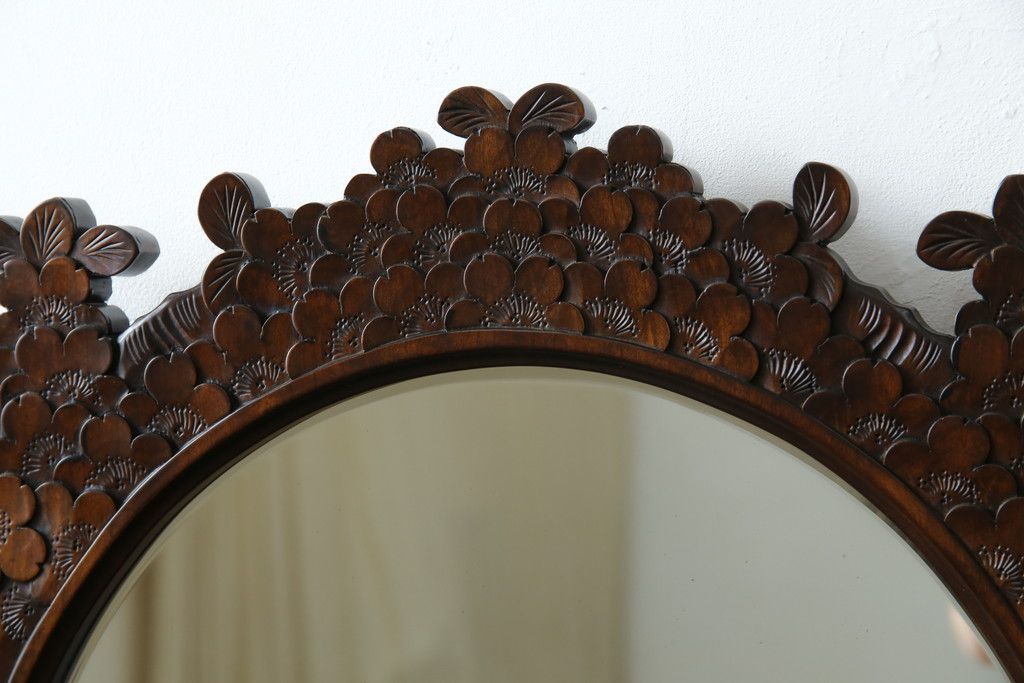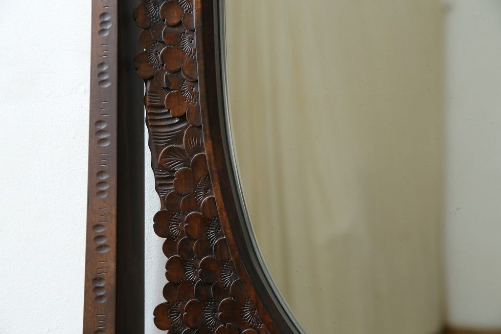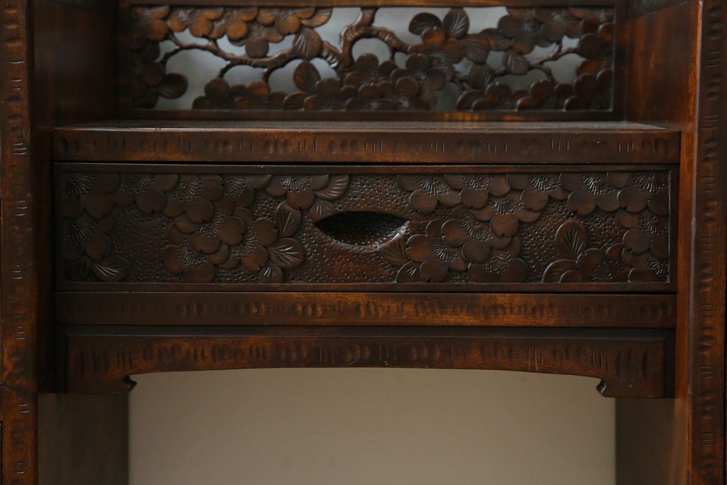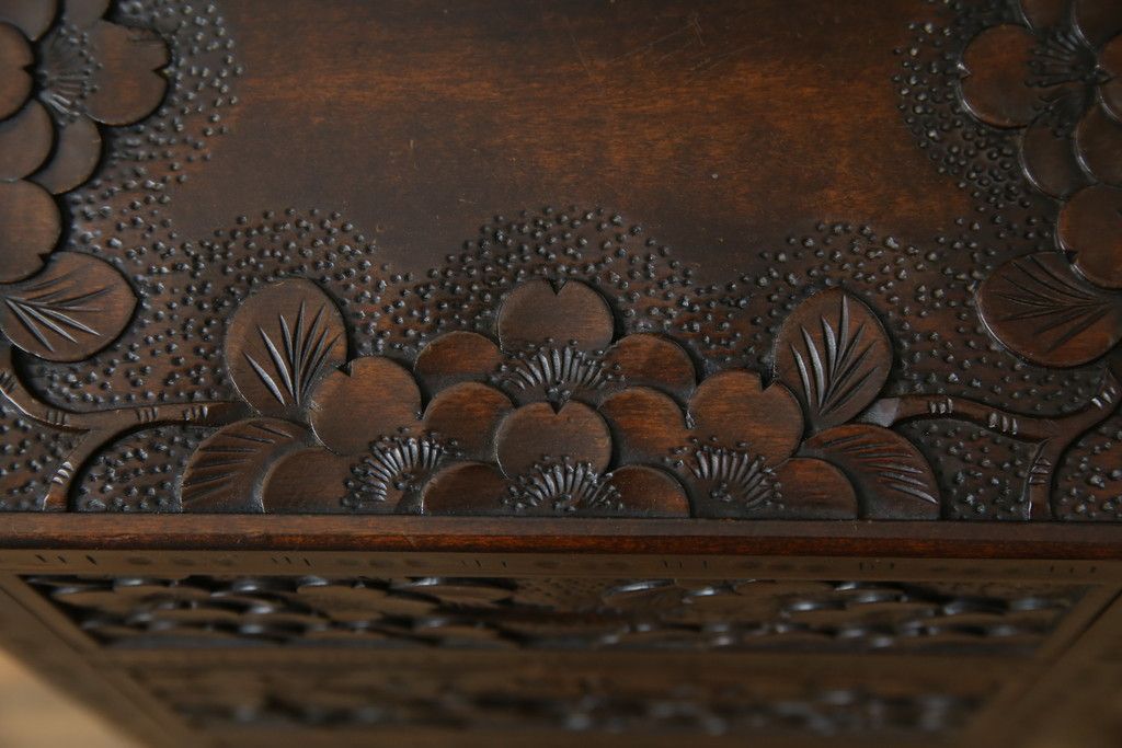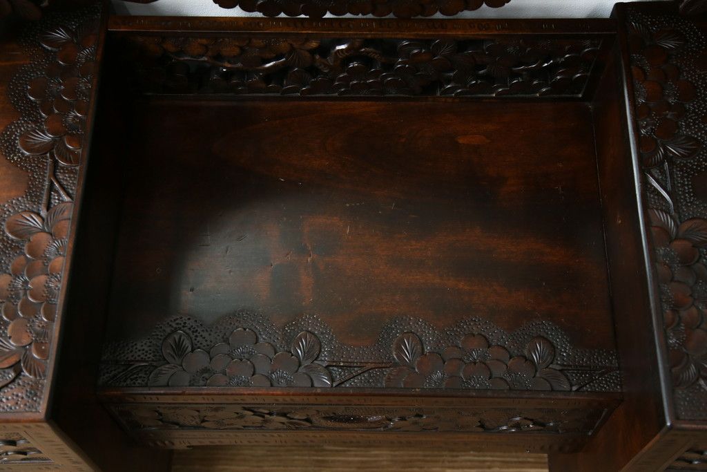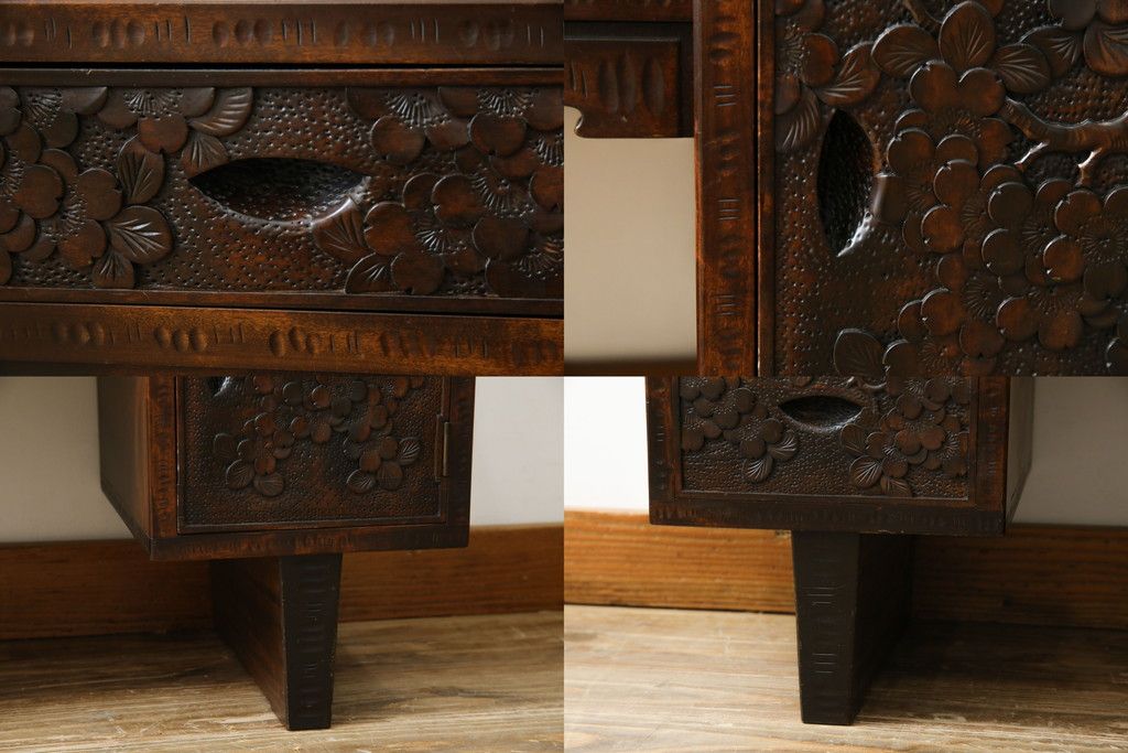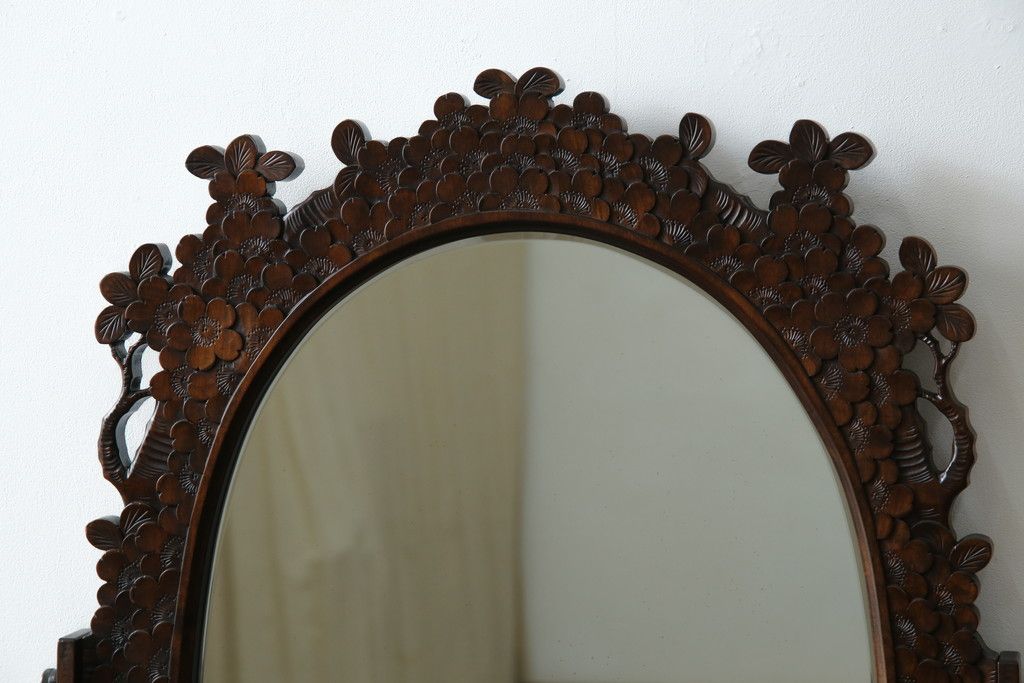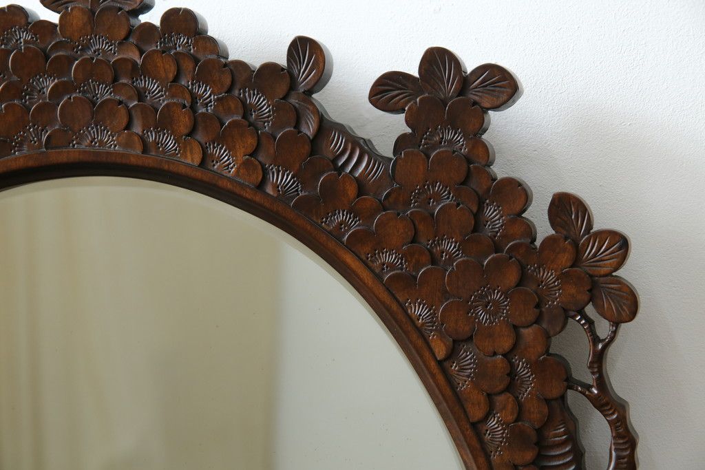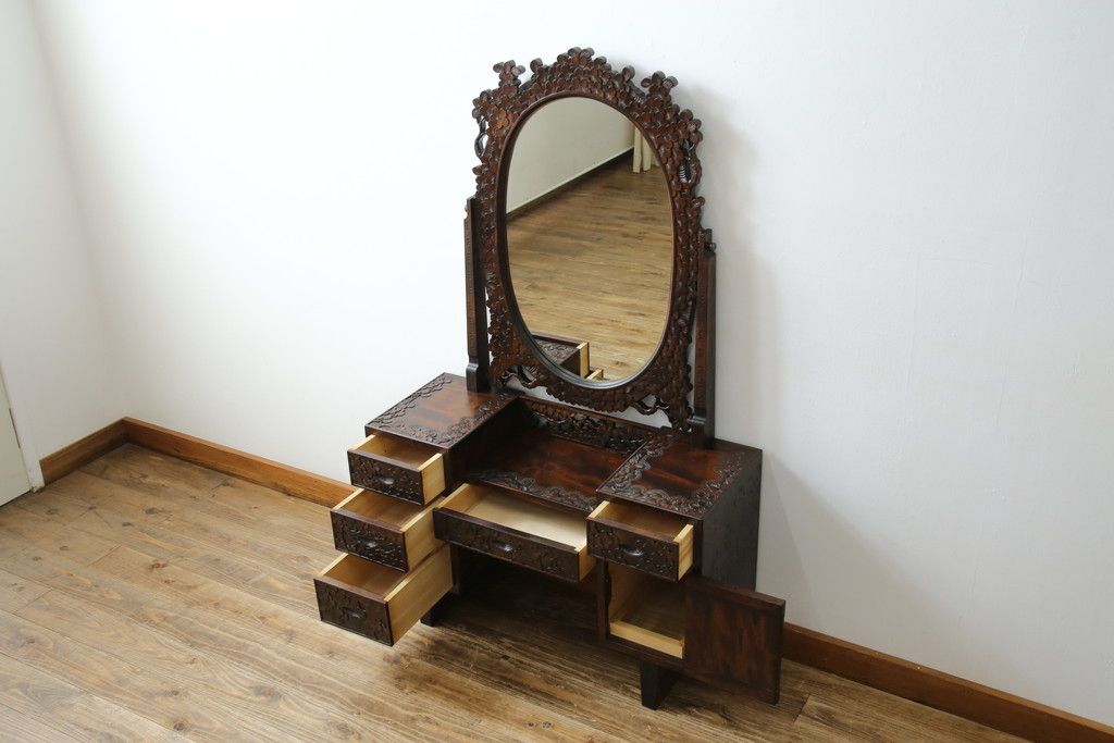 中古 軽井沢彫り 趣ある木の色合いと凝った桜の意匠が和の雰囲気を高めるドレッサーとスツールのセット(鏡台、化粧台、ミラー)(R-062577)です。