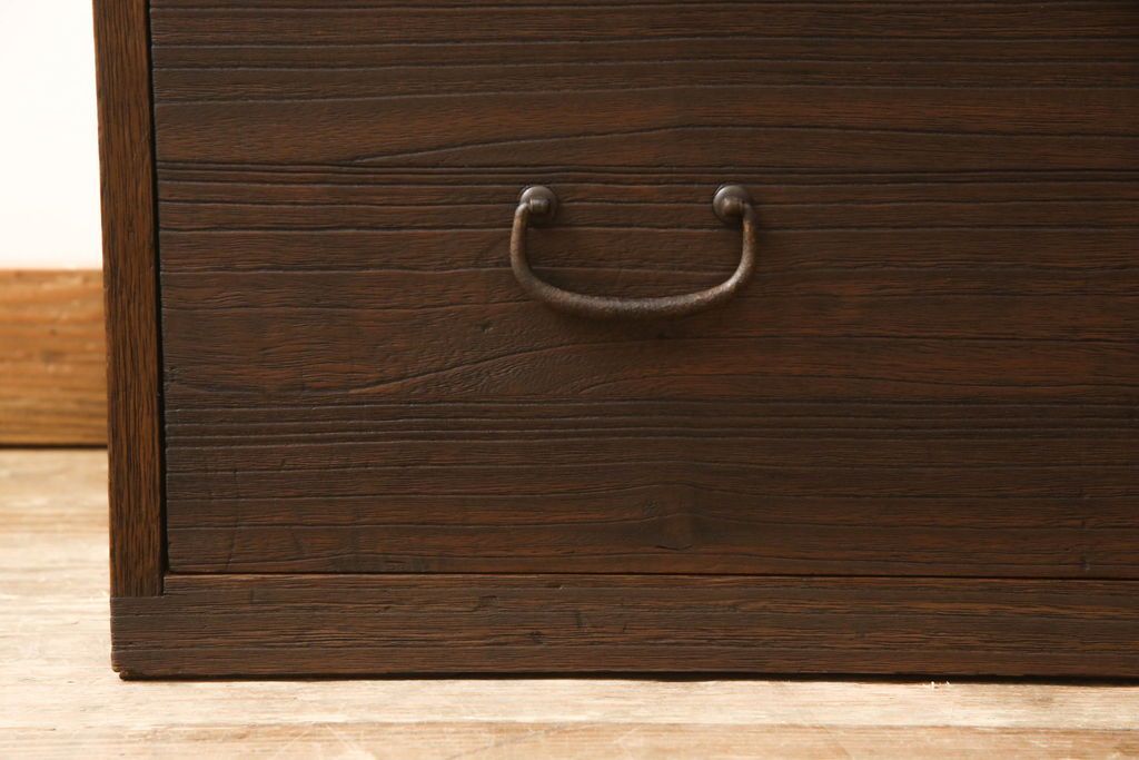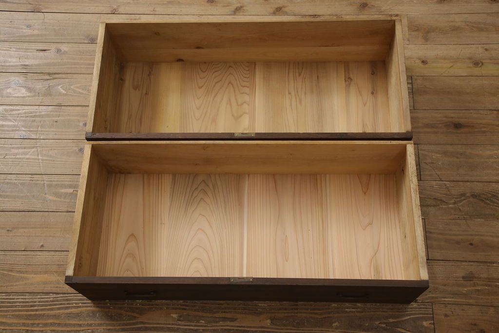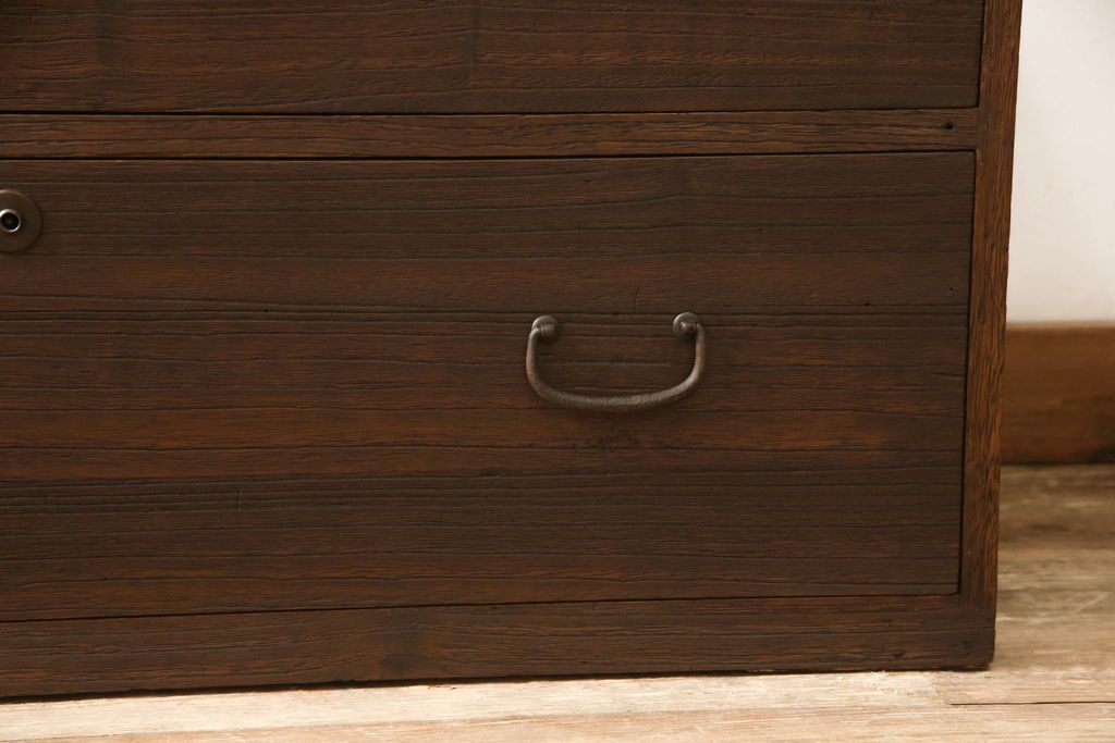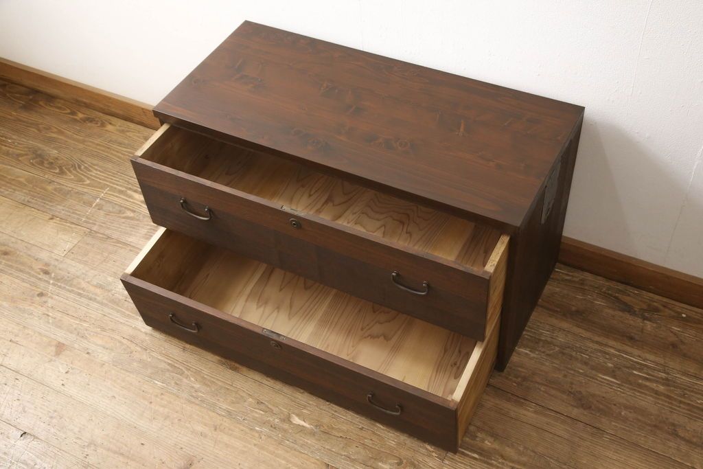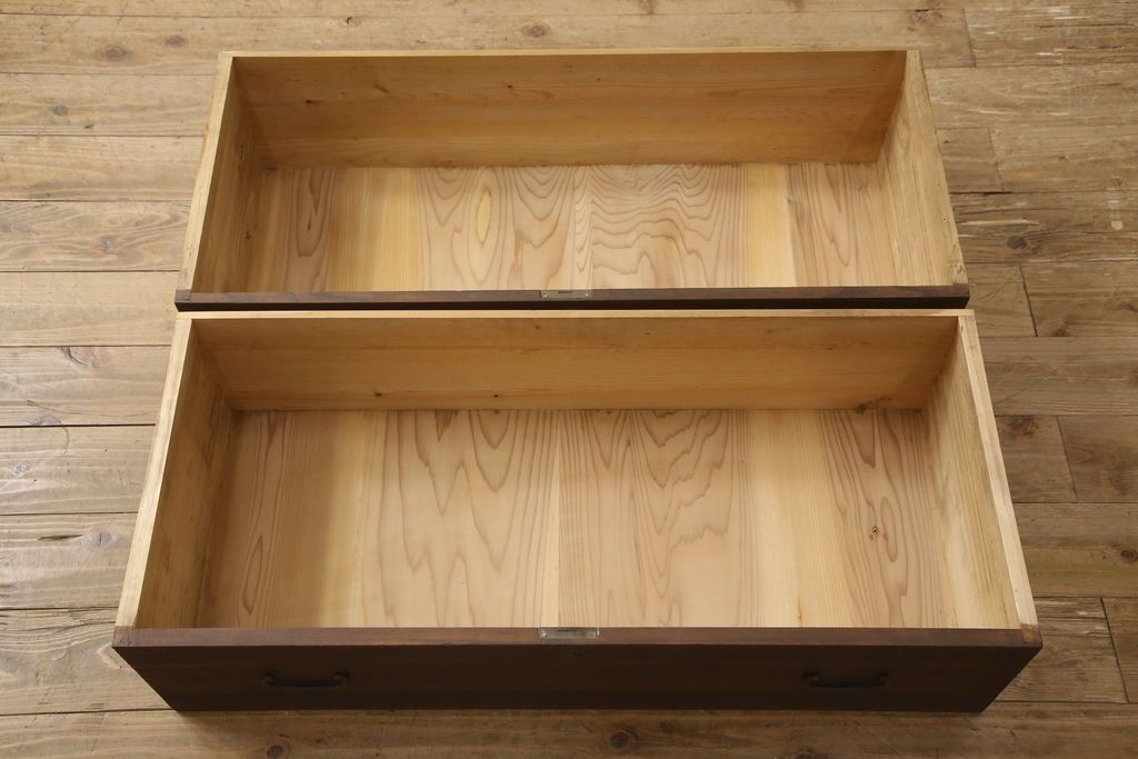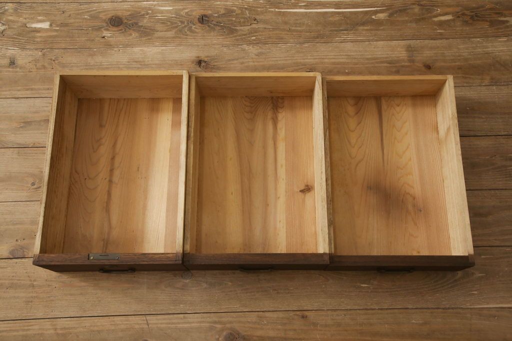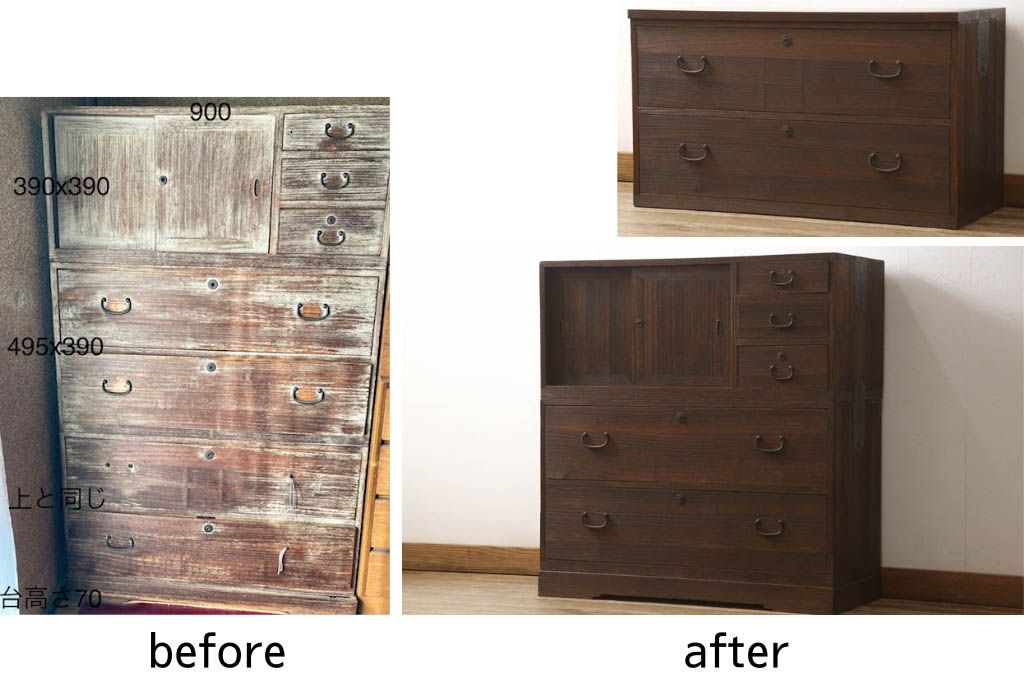 3段重ね桐箪笥をチェストとテレビボードにリメイク!上段・中段・台輪を重ねてチェストに変更。下段は取っ手の取り付け。いずれもヒノキ無垢材の天板を追加。オーク系で着色仕上げ。