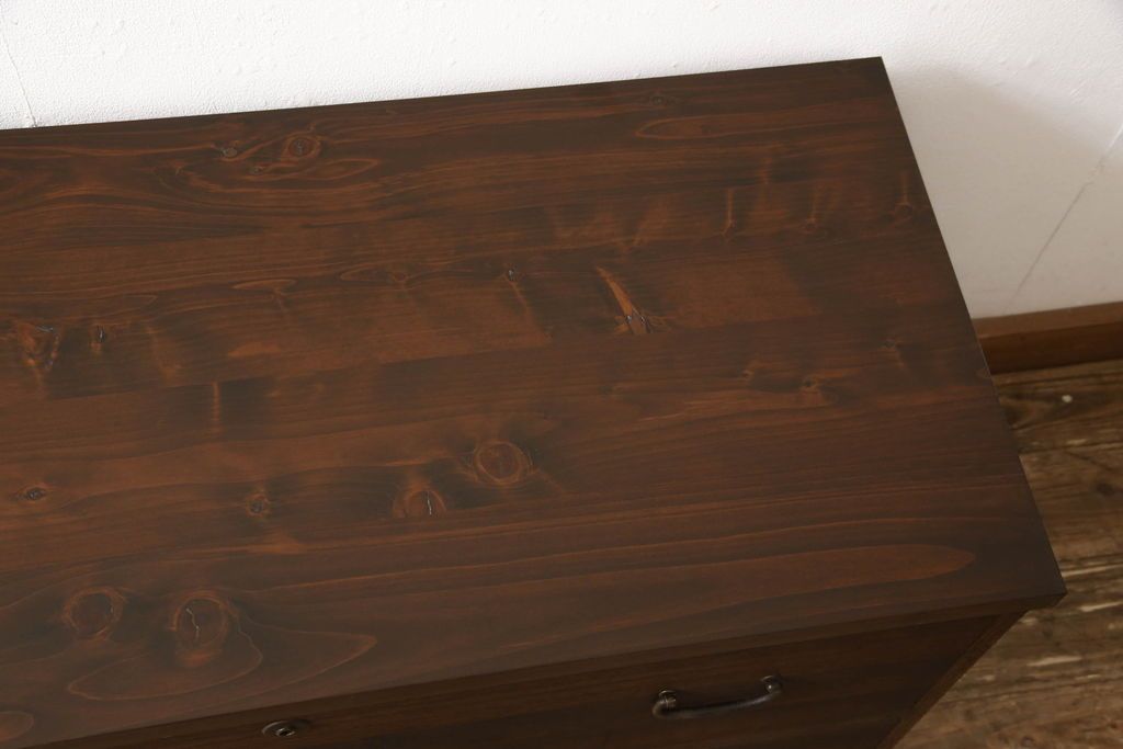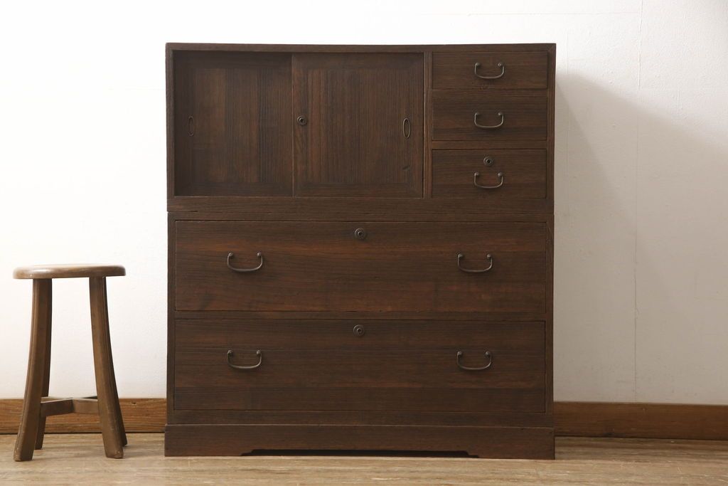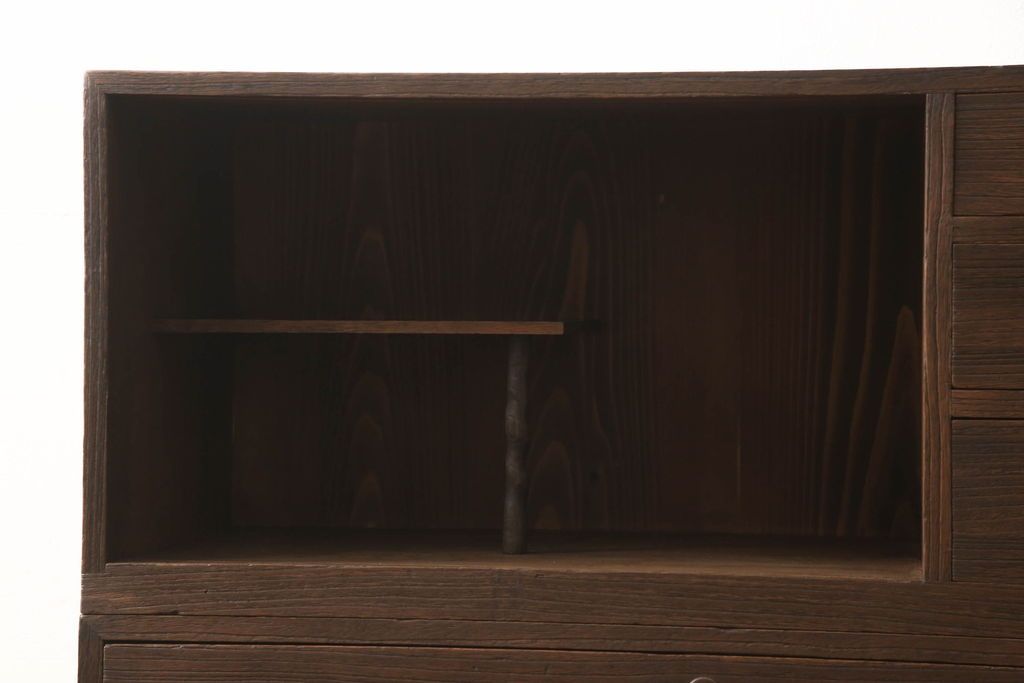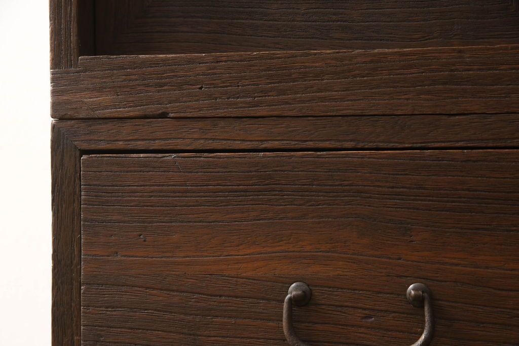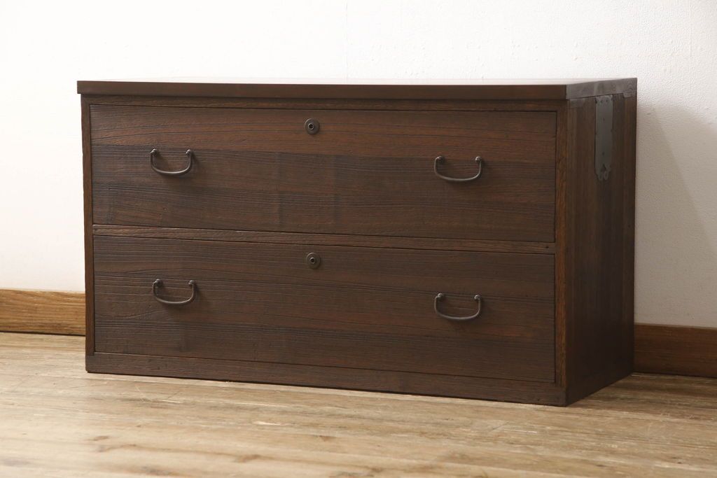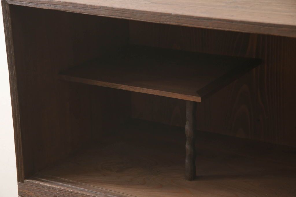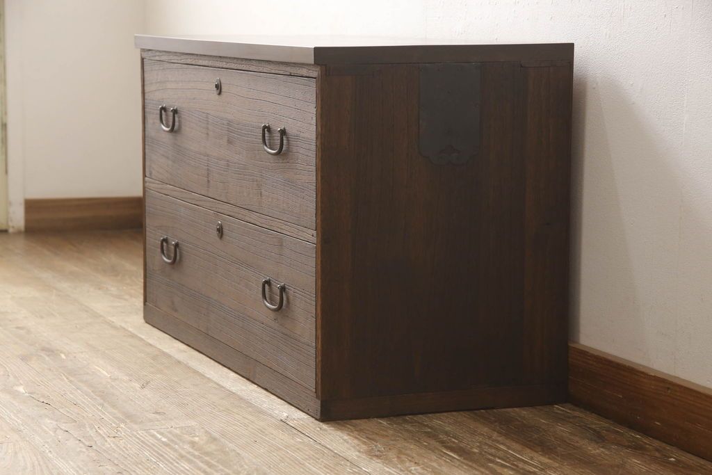 3段重ね桐箪笥をチェストとテレビボードにリメイク!上段・中段・台輪を重ねてチェストに変更。下段は取っ手の取り付け。いずれもヒノキ無垢材の天板を追加。オーク系で着色仕上げ。