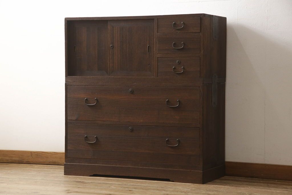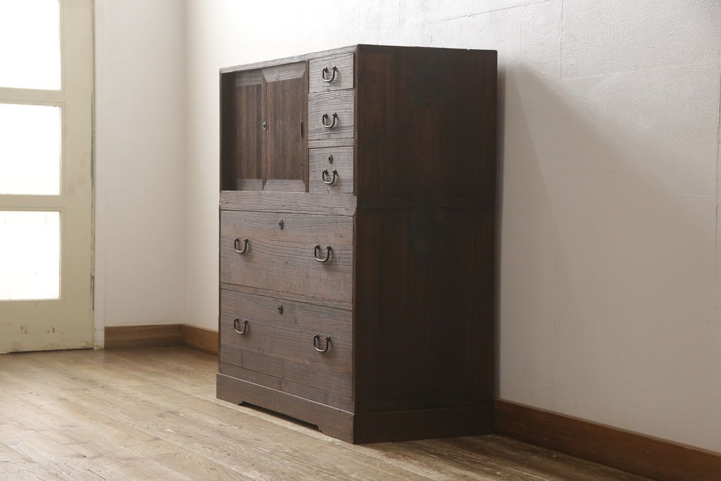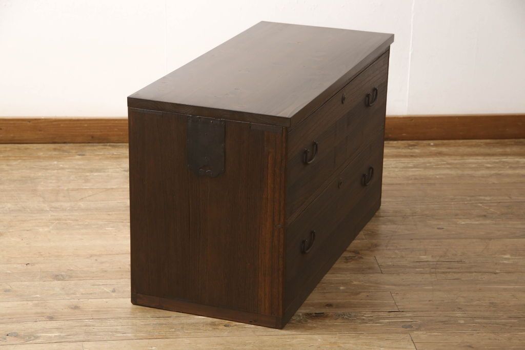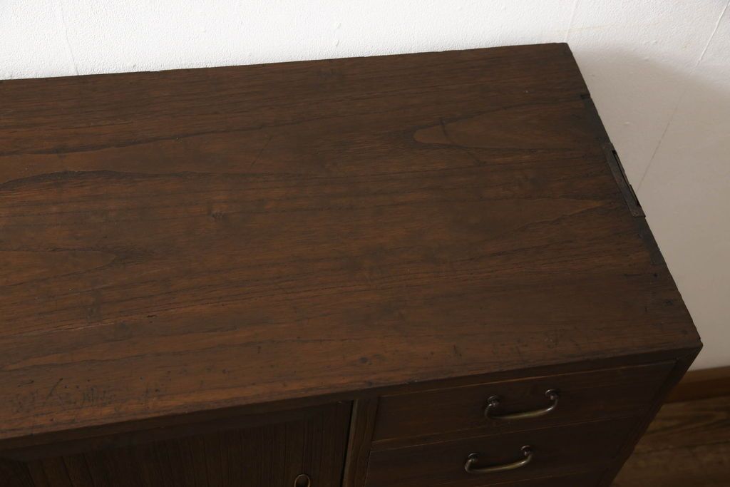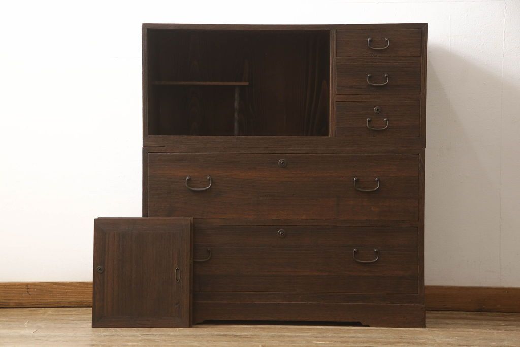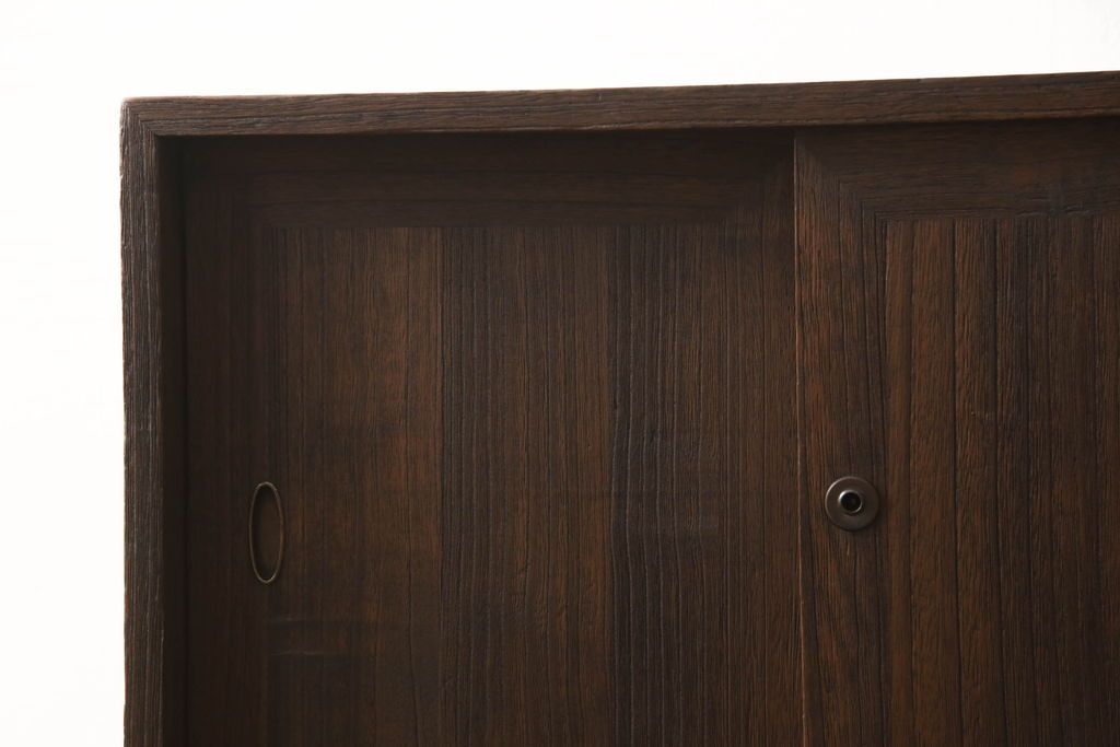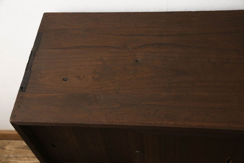 3段重ね桐箪笥をチェストとテレビボードにリメイク!上段・中段・台輪を重ねてチェストに変更。下段は取っ手の取り付け。いずれもヒノキ無垢材の天板を追加。オーク系で着色仕上げ。