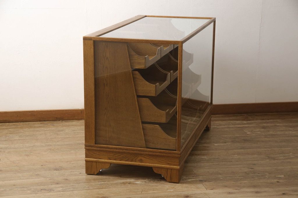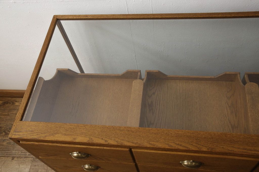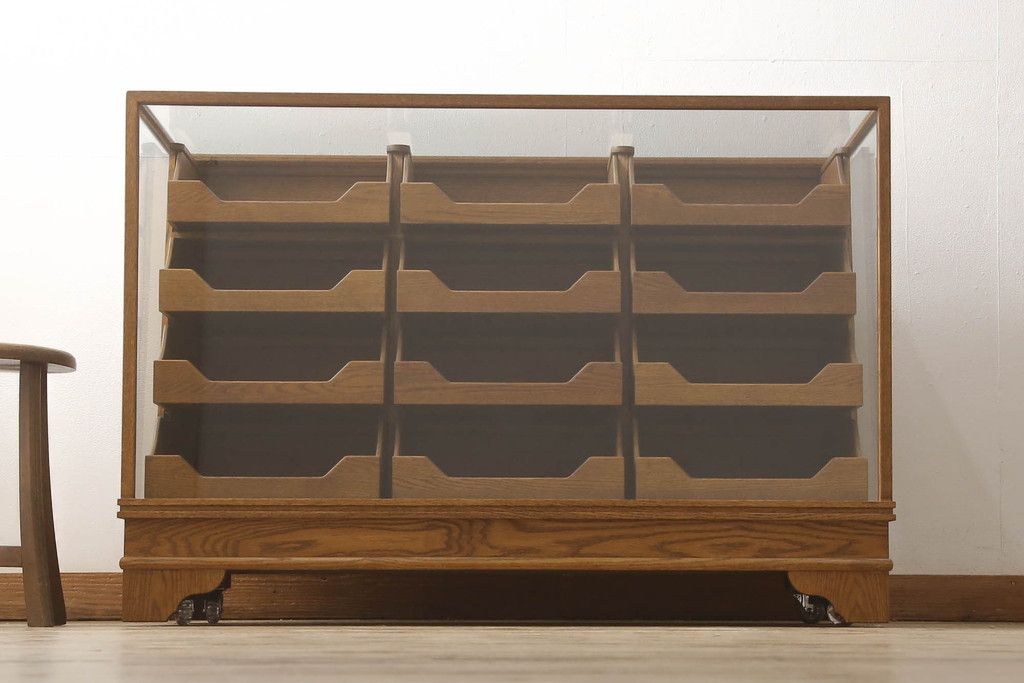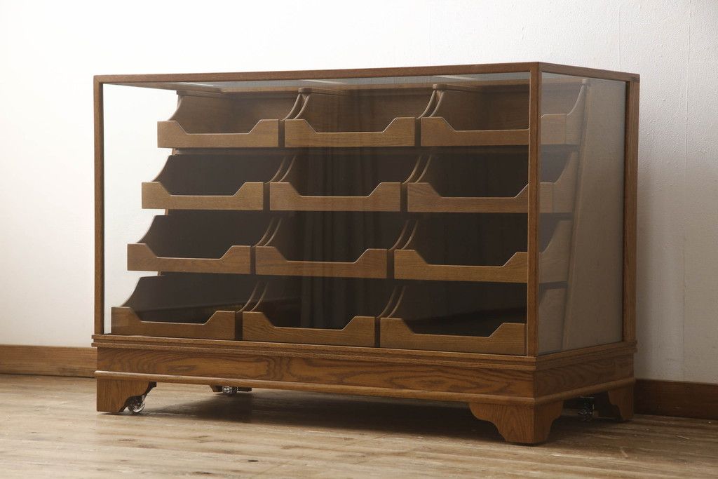 ガラスケース・ショーケース> カウンターショーケース > シャツケースを新規製作!オーク材使用。移動しやすいようキャスターの取り付け。明るめの茶色に着色し、アンティーク調に仕上げ。(ガラスケース、ショーケース、店舗什器)