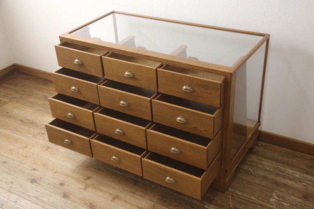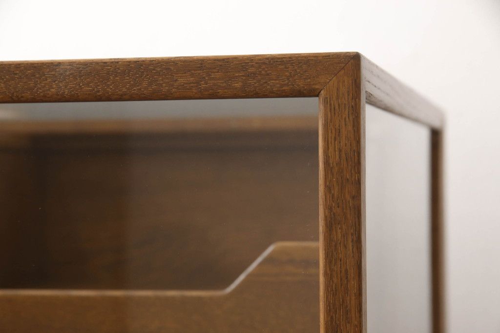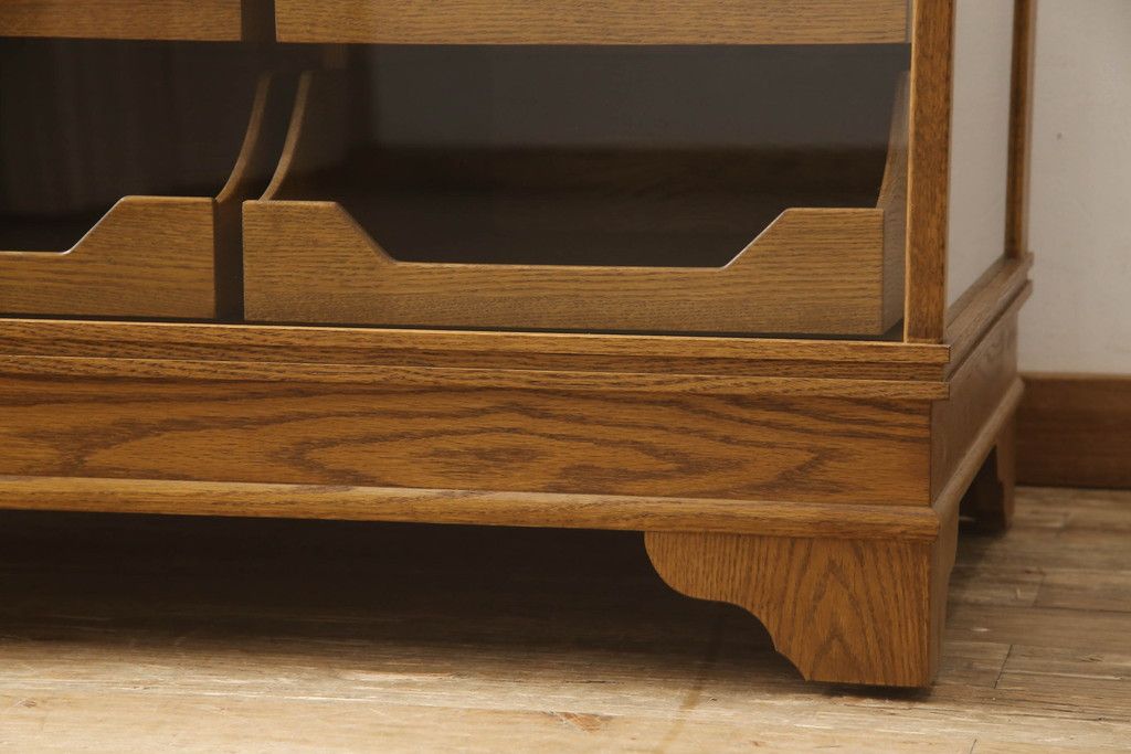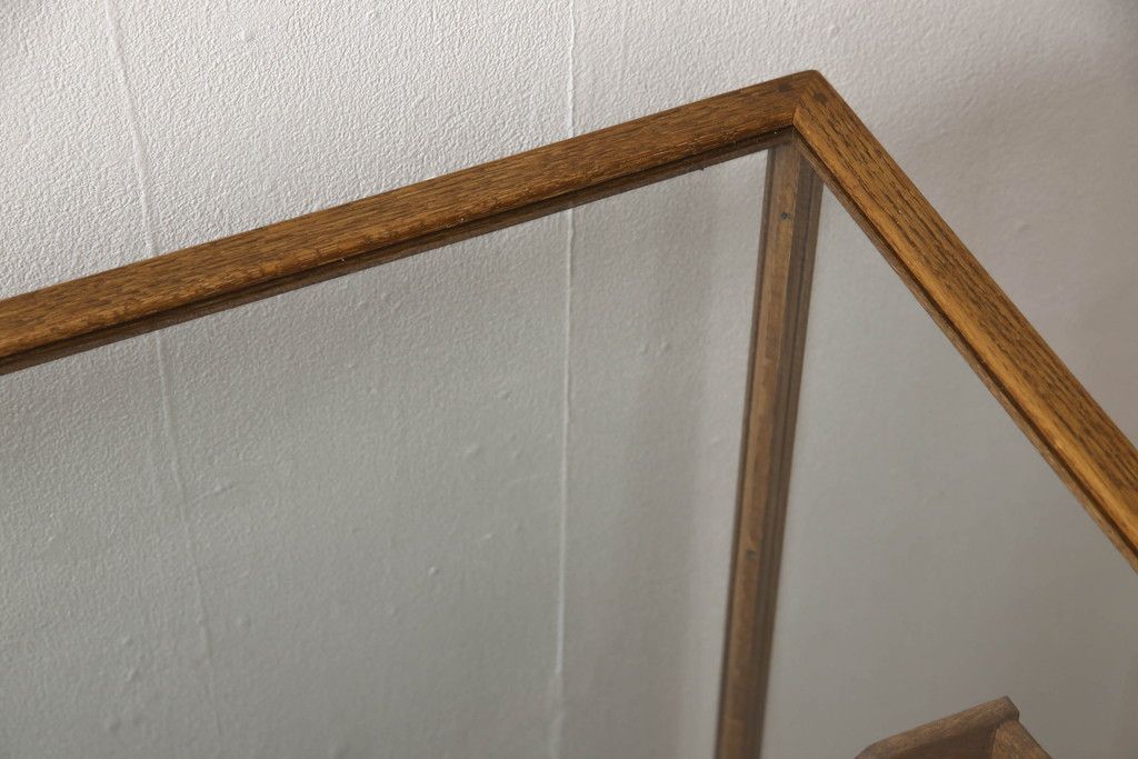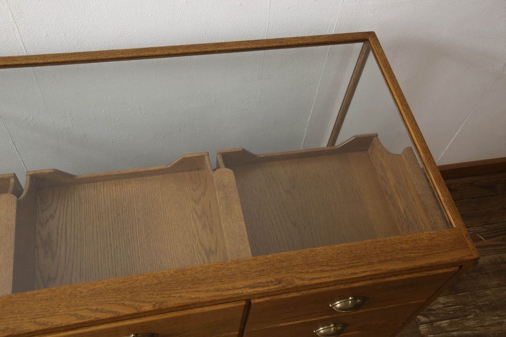 ガラスケース・ショーケース> カウンターショーケース > シャツケースを新規製作!オーク材使用。移動しやすいようキャスターの取り付け。明るめの茶色に着色し、アンティーク調に仕上げ。(ガラスケース、ショーケース、店舗什器)