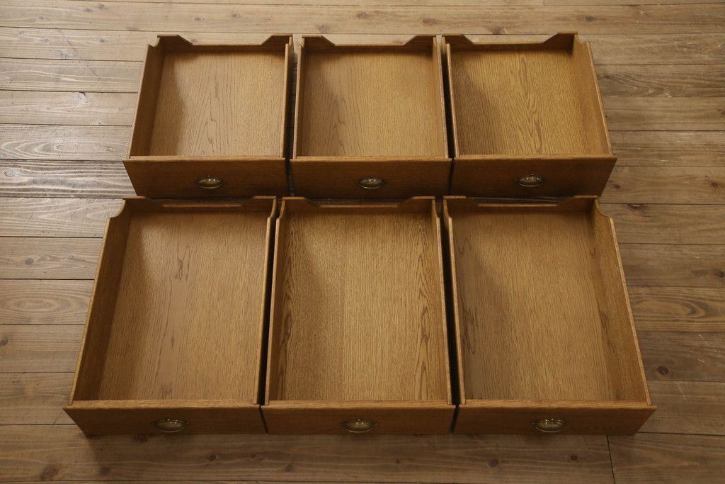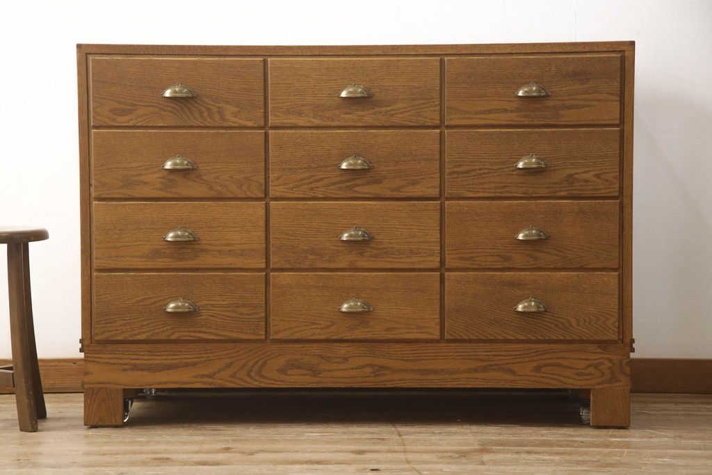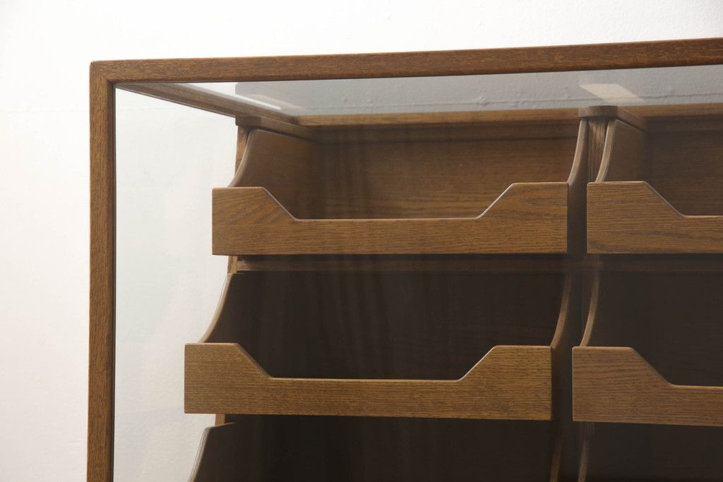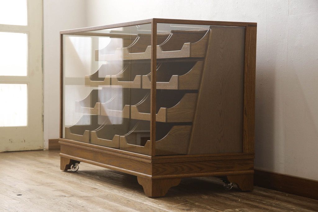 シャツケースを新規製作!オーク材使用。移動しやすいようキャスターの取り付け。明るめの茶色に着色し、アンティーク調に仕上げ。(ガラスケース、ショーケース、店舗什器)