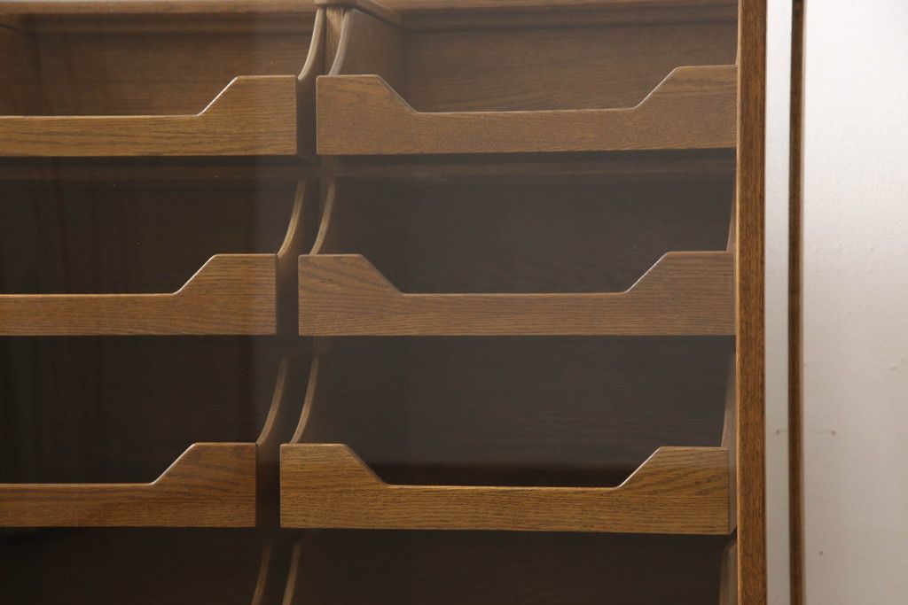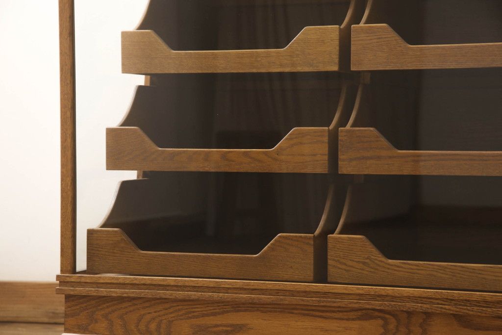 ガラスケース・ショーケース > シャツケースを新規製作!オーク材使用。移動しやすいようキャスターの取り付け。明るめの茶色に着色し、アンティーク調に仕上げ。(ガラスケース、ショーケース、店舗什器)
