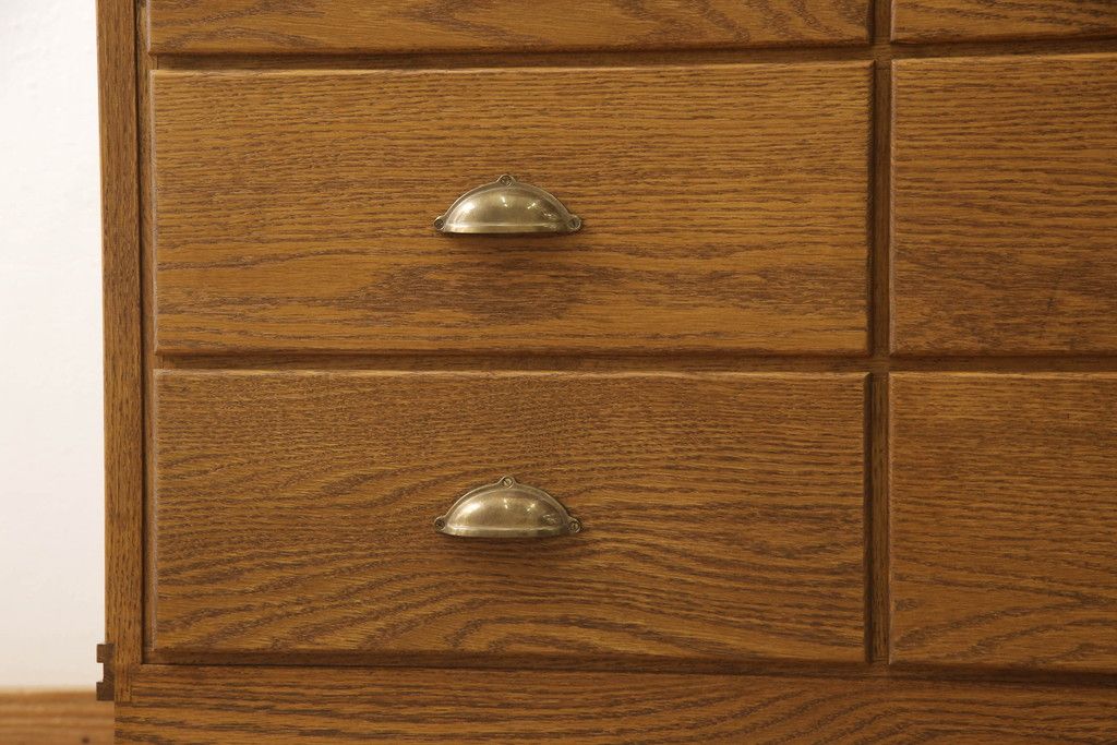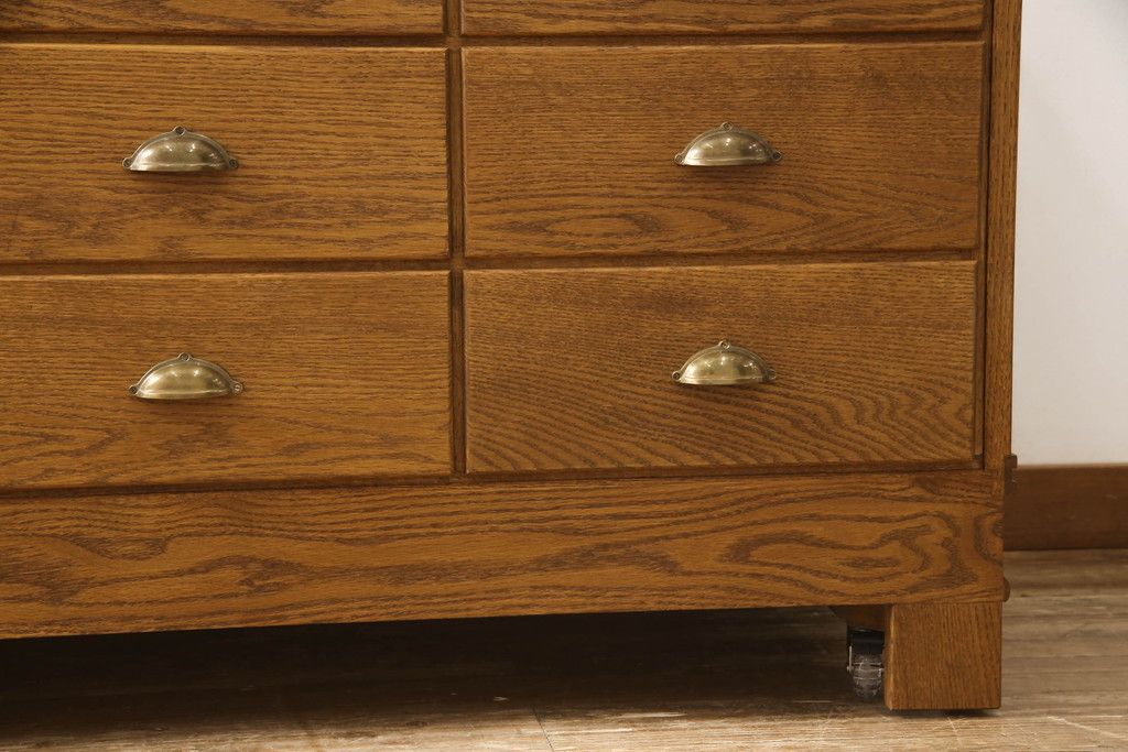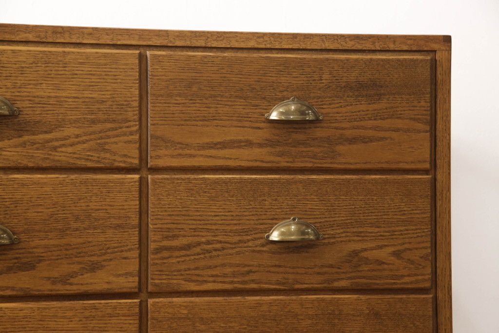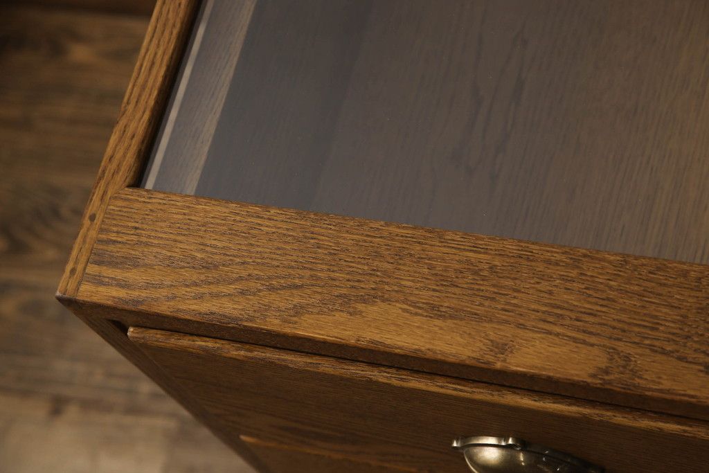 フルオーダー家具実績 > シャツケースを新規製作!オーク材使用。移動しやすいようキャスターの取り付け。明るめの茶色に着色し、アンティーク調に仕上げ。(ガラスケース、ショーケース、店舗什器)