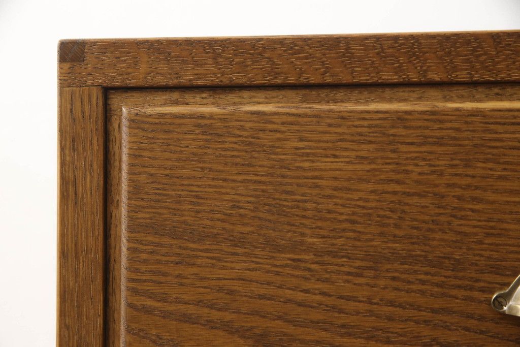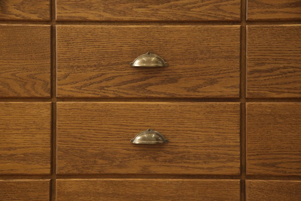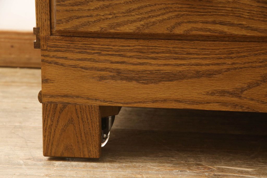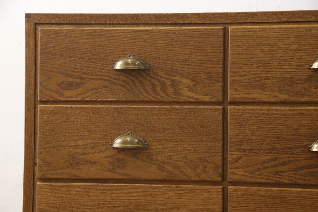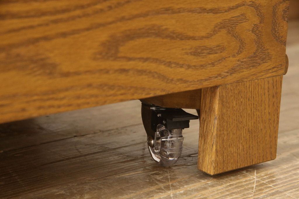 フルオーダー家具実績 > シャツケースを新規製作!オーク材使用。移動しやすいようキャスターの取り付け。明るめの茶色に着色し、アンティーク調に仕上げ。(ガラスケース、ショーケース、店舗什器)