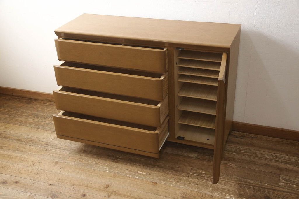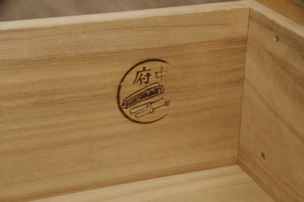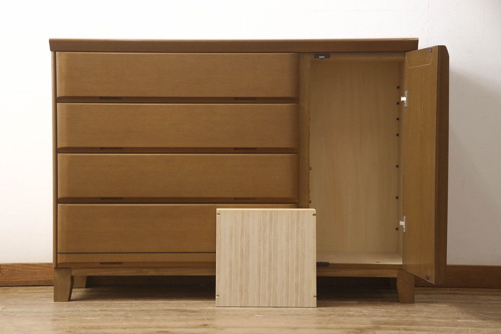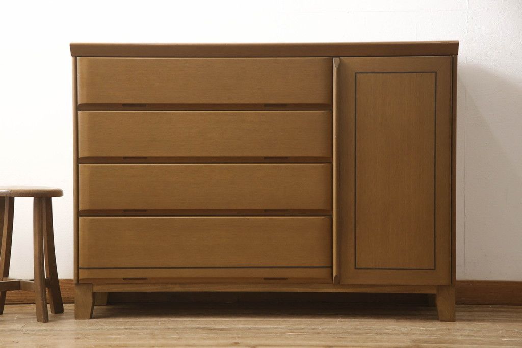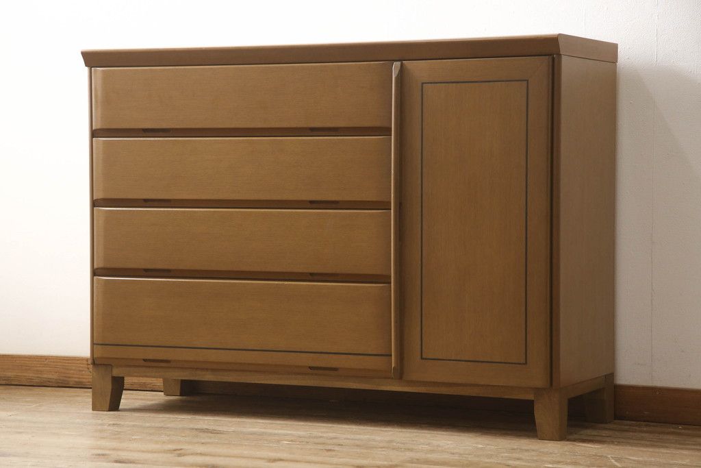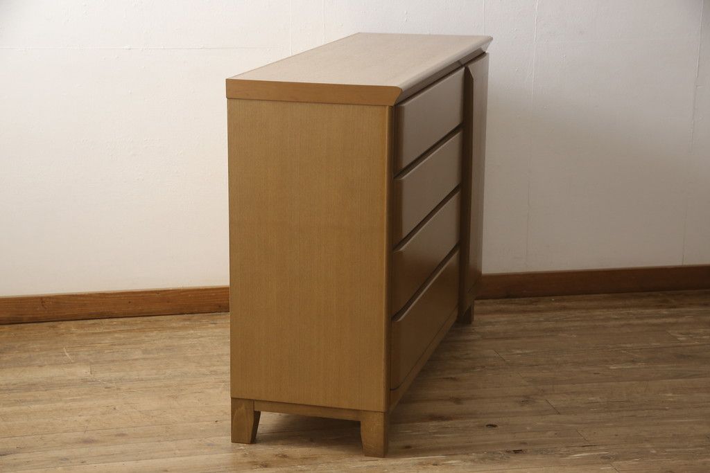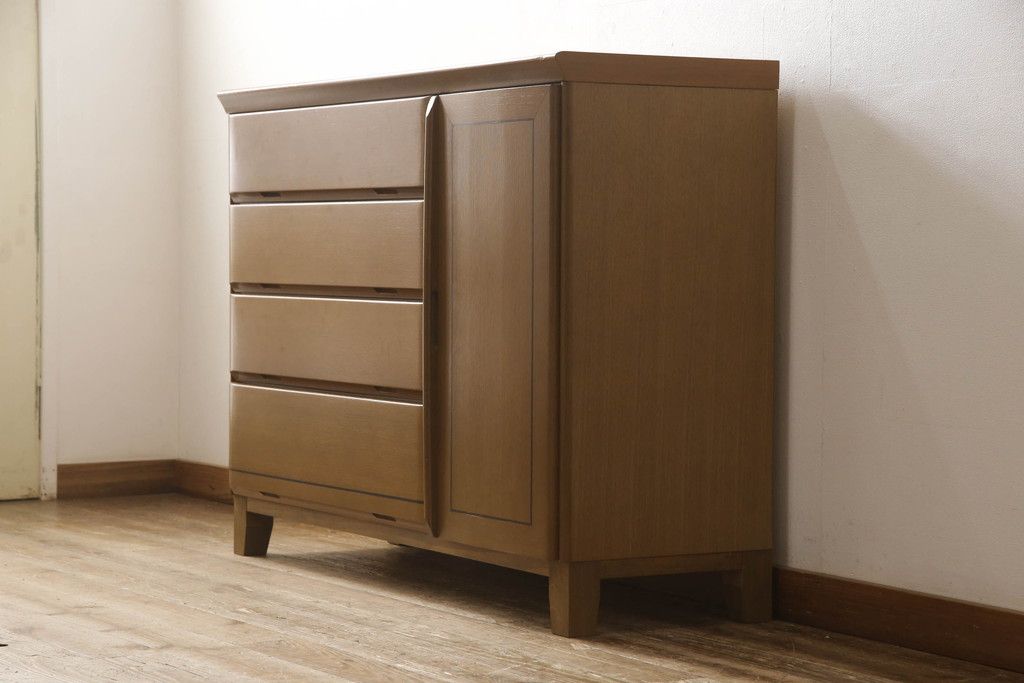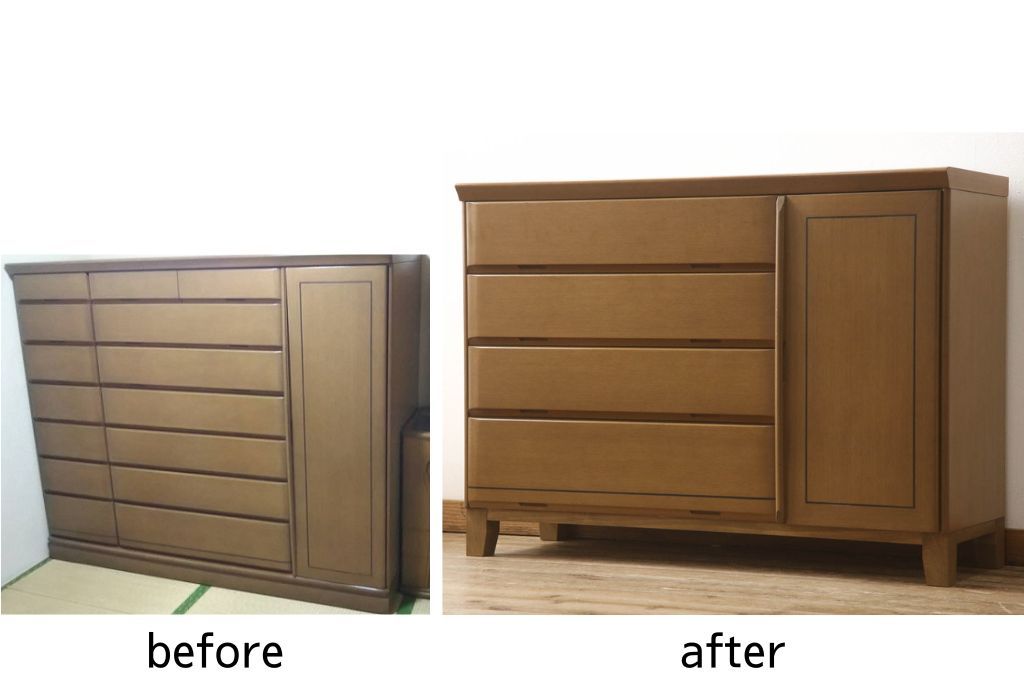 婚礼箪笥をチェストにリメイク!左側の引き出しをカットし、中央引き出し4段と扉収納部分を利用。奥行きも小さくリサイズし、台輪は取り外して木製脚を取り付け。