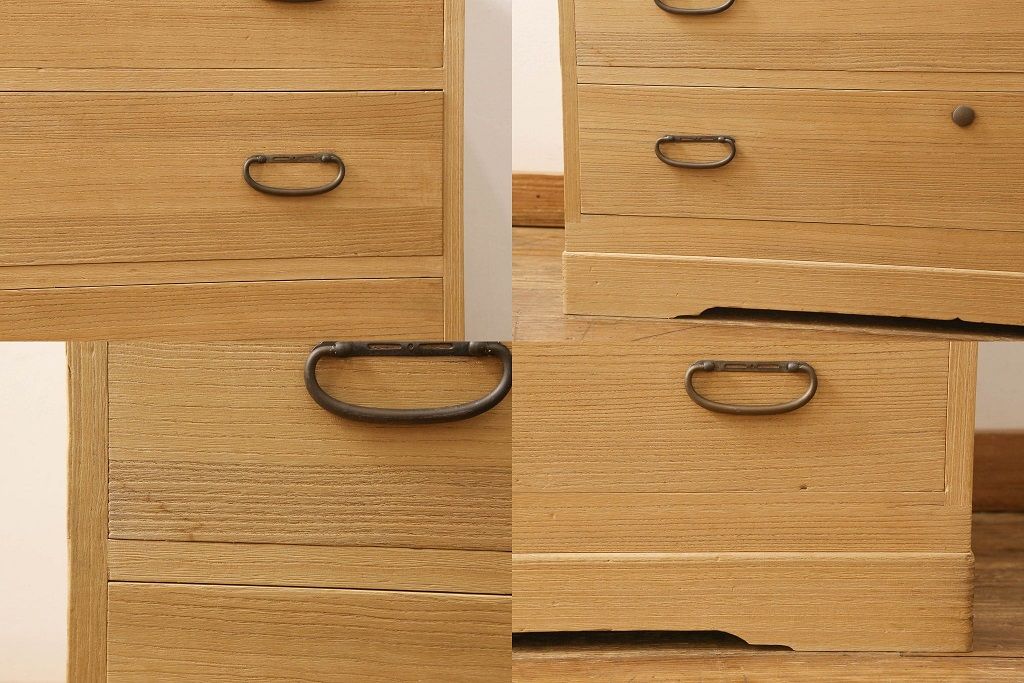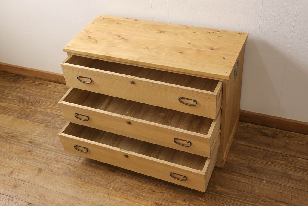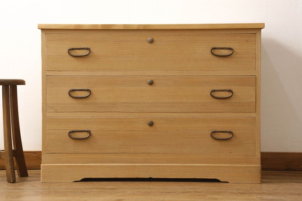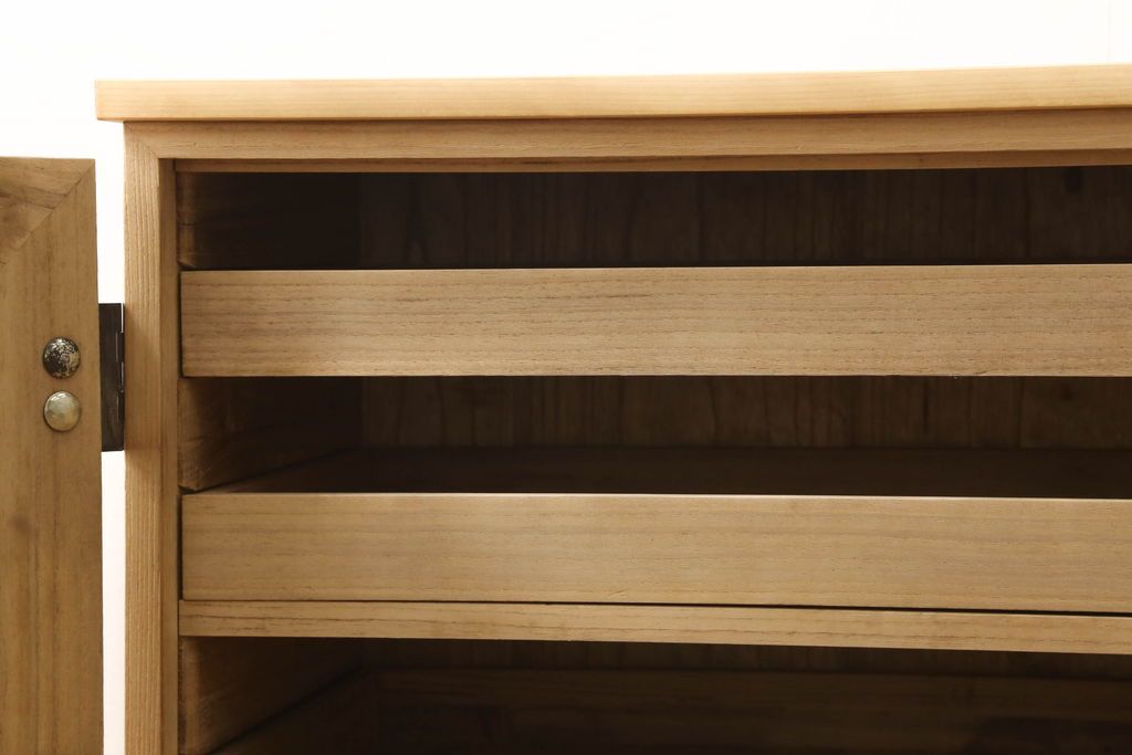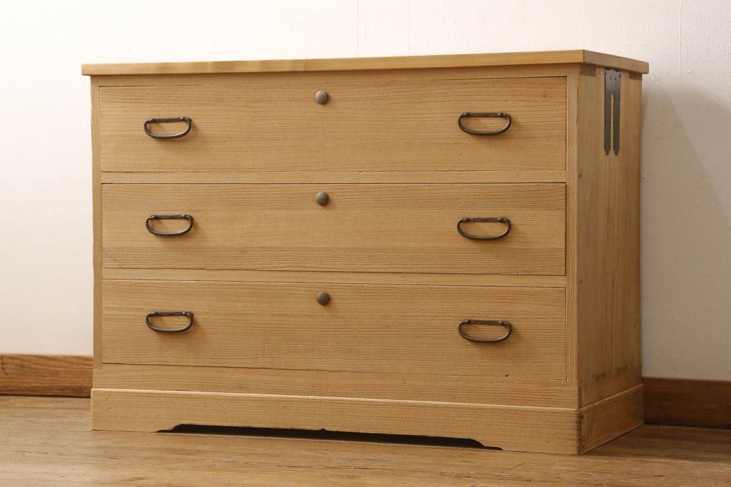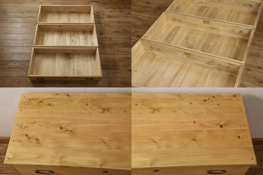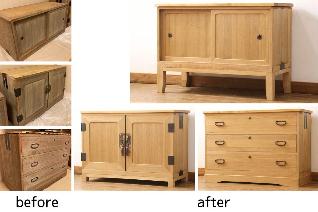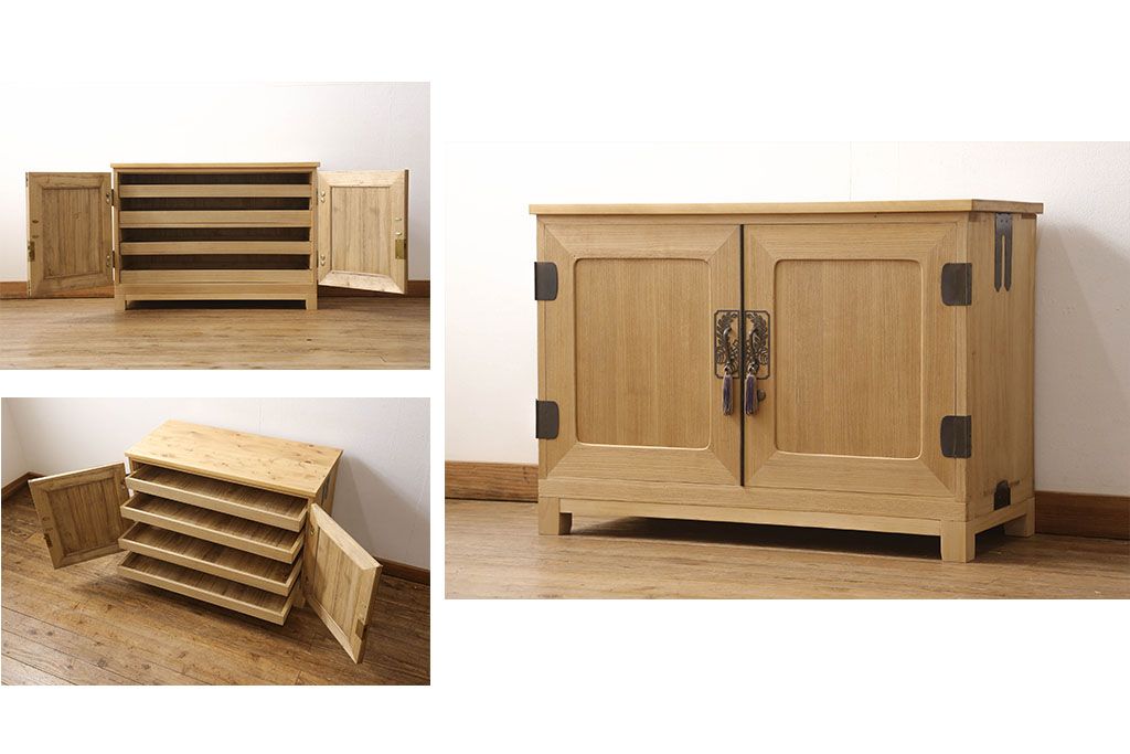 3段重ね桐箪笥をローボード2台とローチェストにリメイク!上段・中段はローボードに加工し、脚の取り付け。それぞれにヒノキ無垢材の天板を追加。自然な木地色仕上げに。