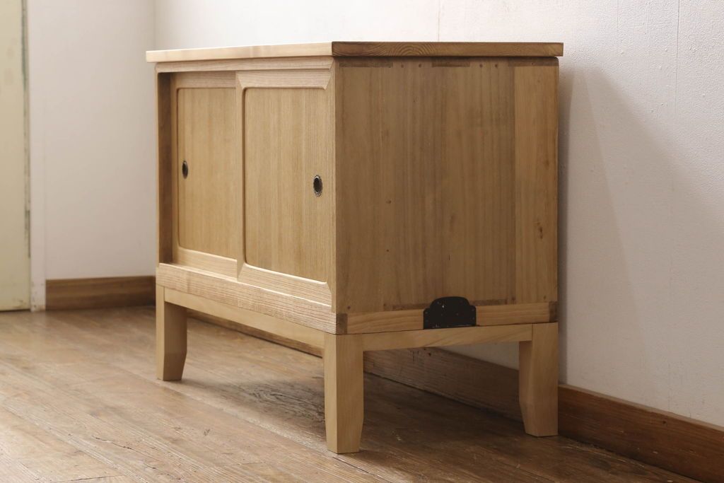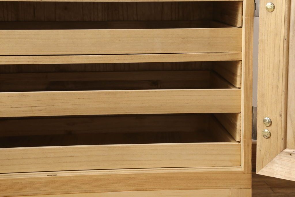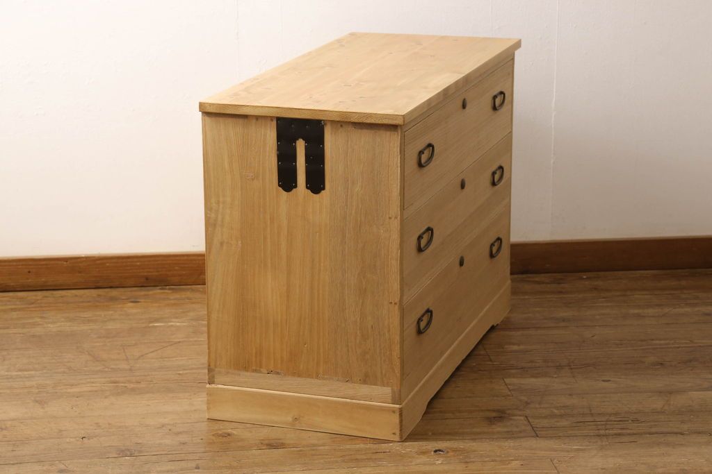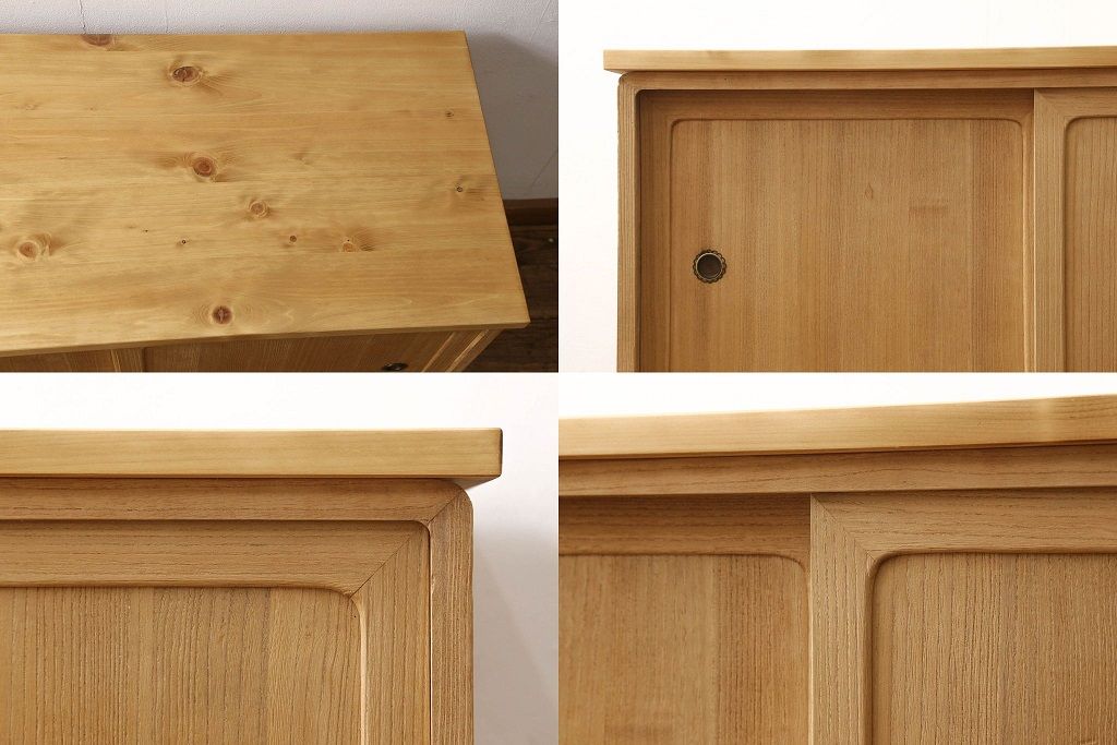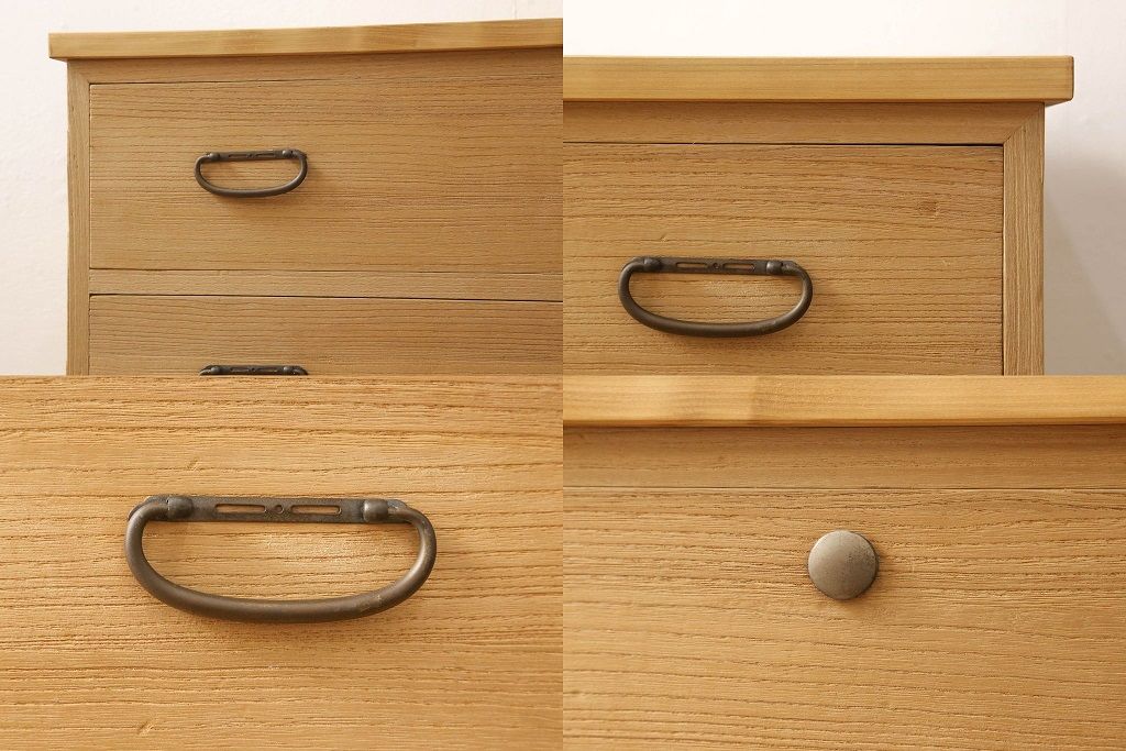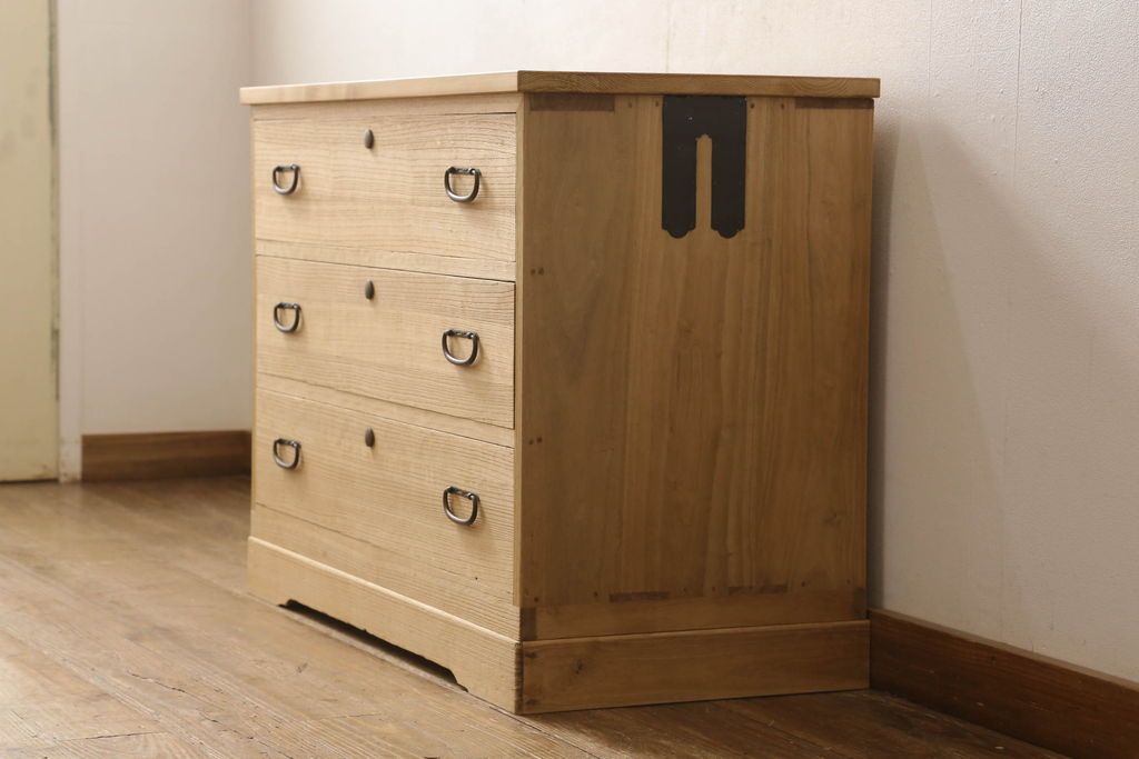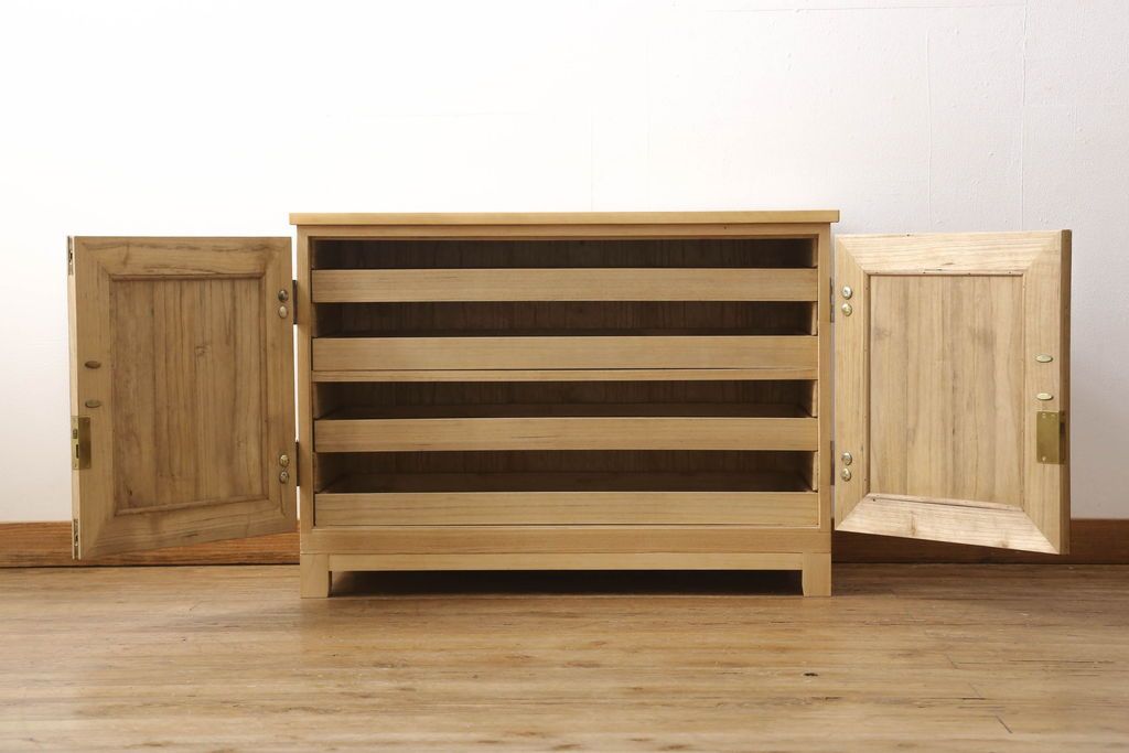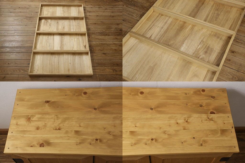 3段重ね桐箪笥をローボード2台とローチェストにリメイク!上段・中段はローボードに加工し、脚の取り付け。それぞれにヒノキ無垢材の天板を追加。自然な木地色仕上げに。