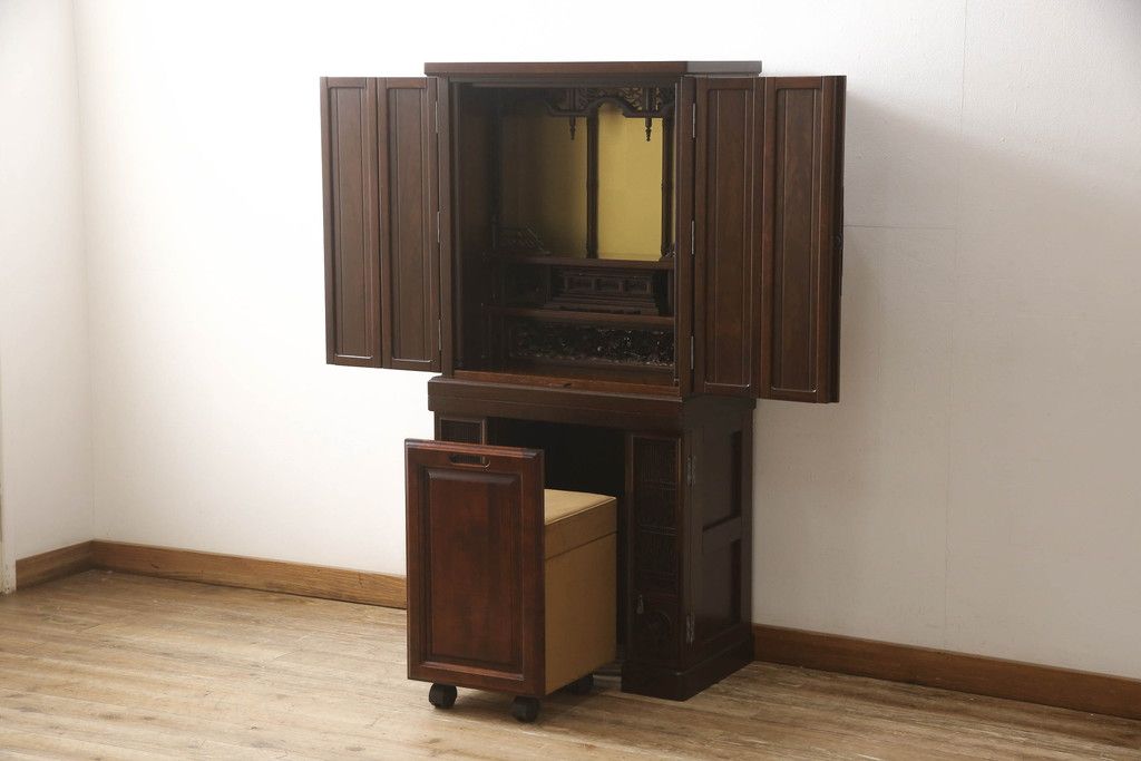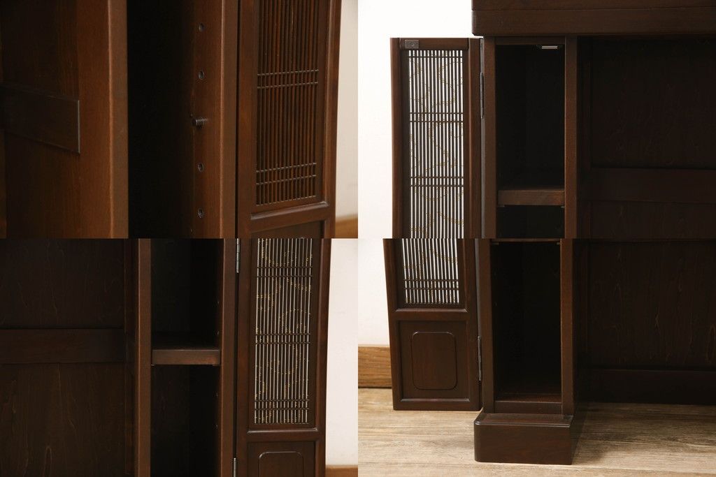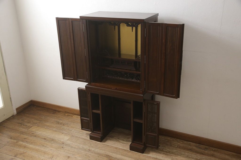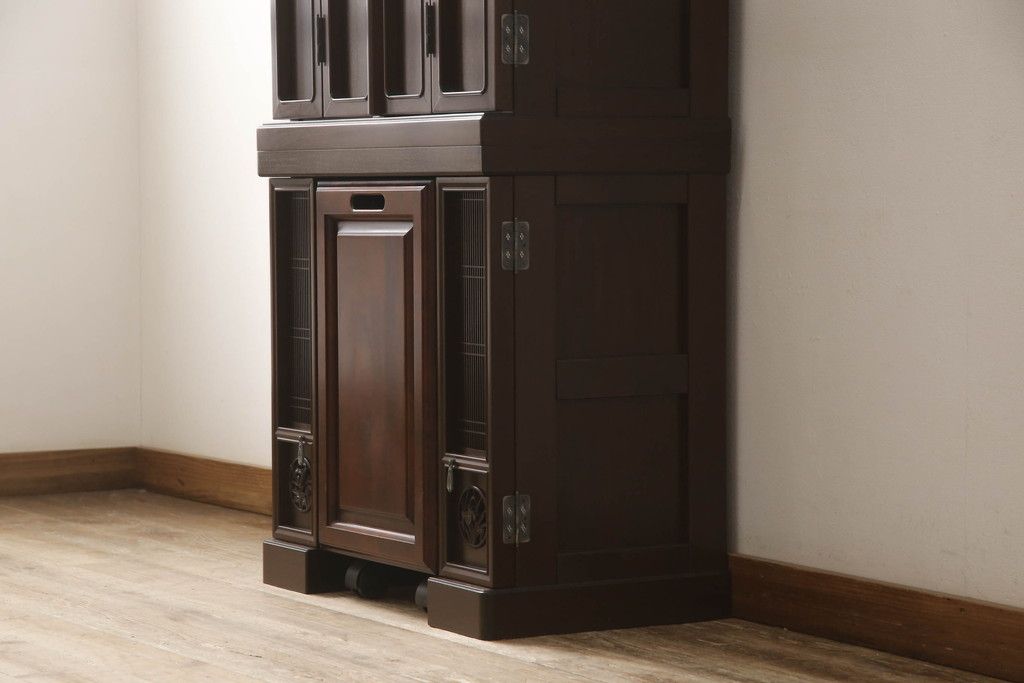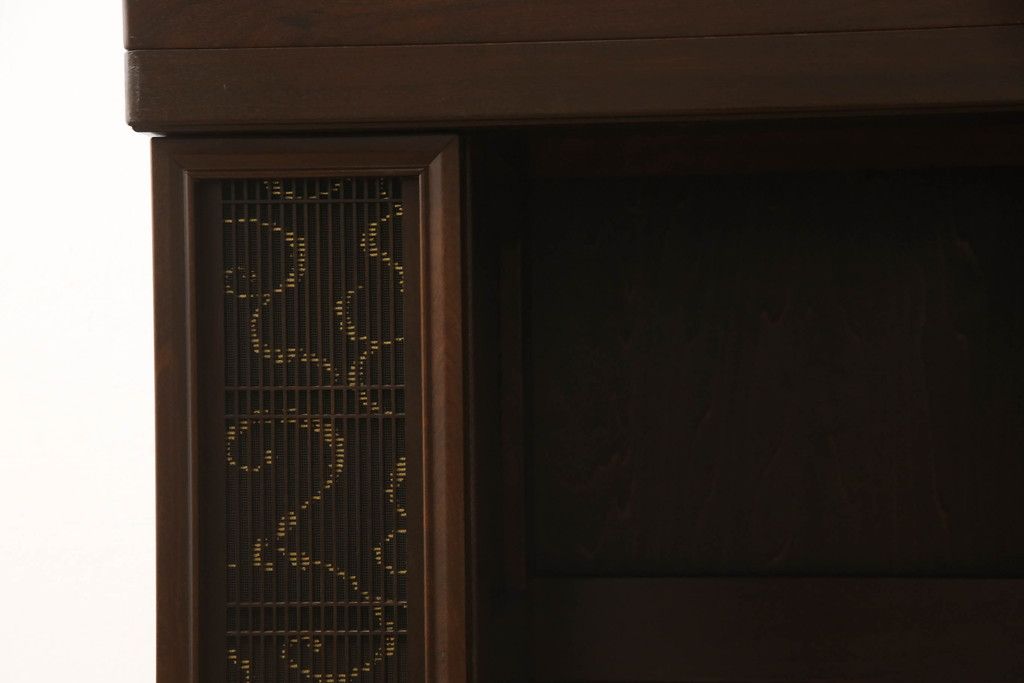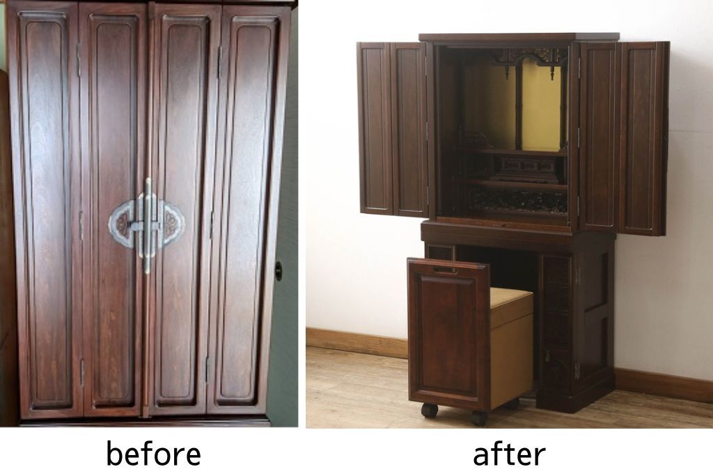 お仏壇をコンパクトにリメイク!上段は指定サイズにリサイズ。下段はお手持ちの椅子を格納できる仕様で新規製作。左右の扉には上段の建具を活用。全体を元の色味に合わせて仕上げ。