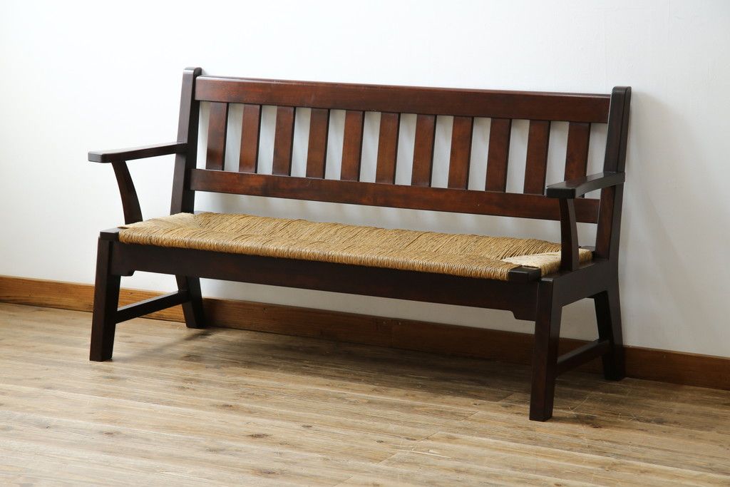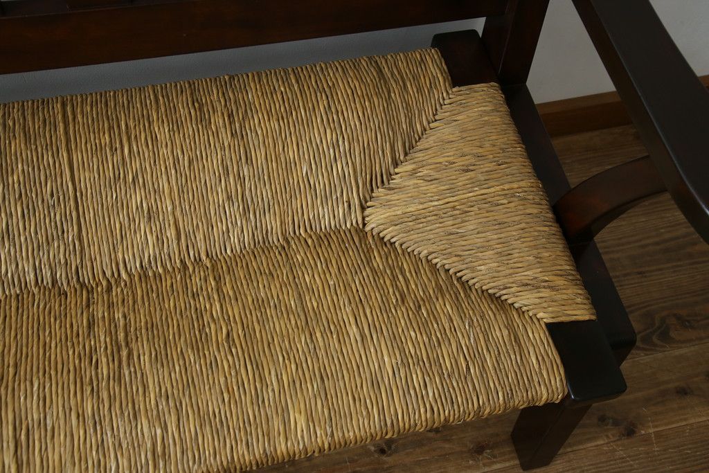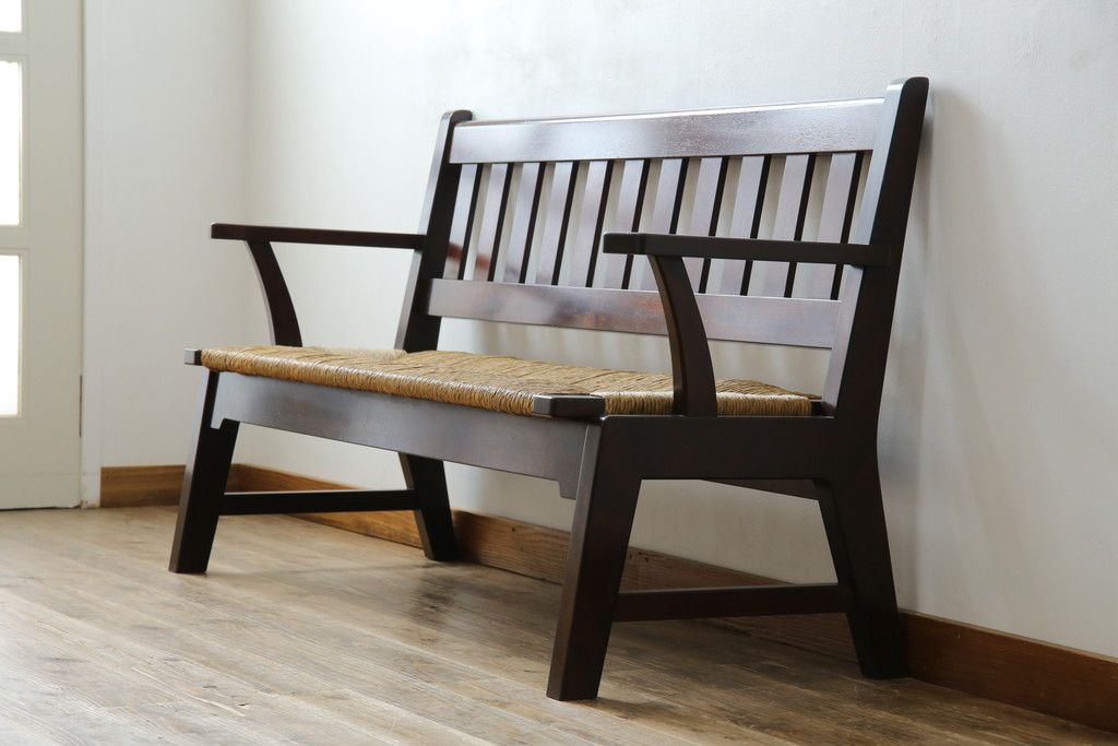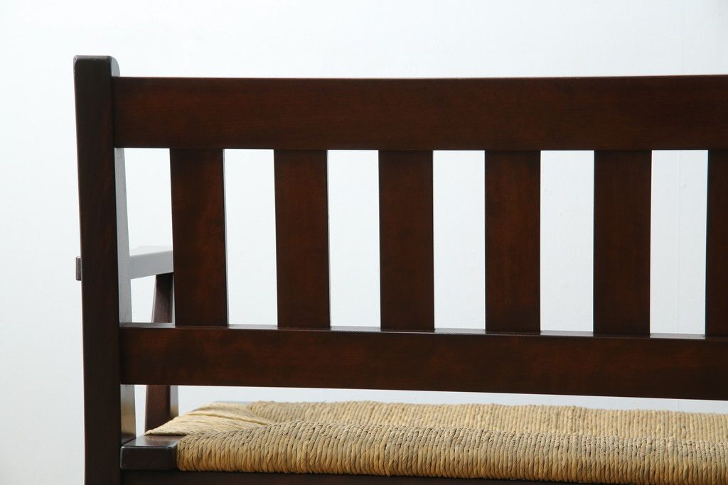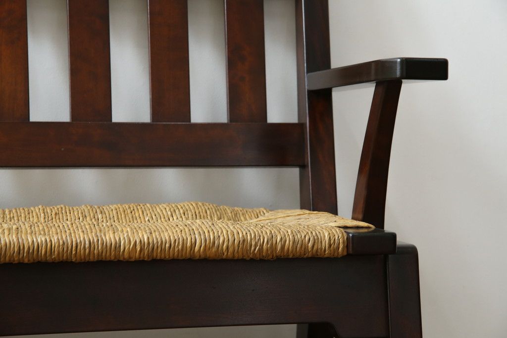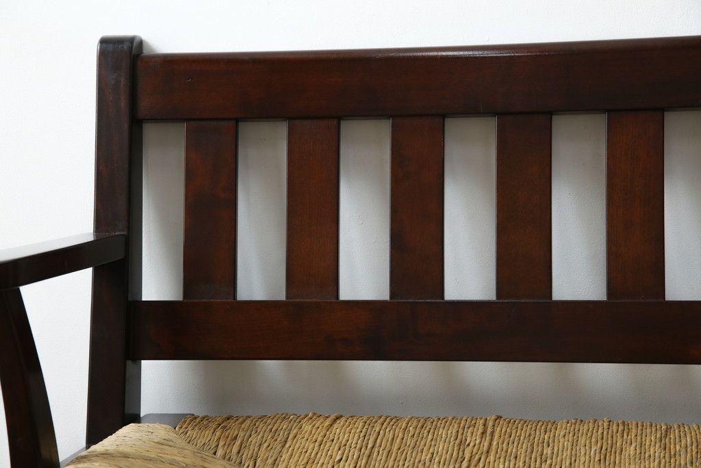 民芸家具 > 中古 稀少 特注品 松本民芸家具 縦桟背もたれのすっきりしたデザインが目を引くラッシベンチ(2人掛け、2.5人掛け、3人掛け、長イス、長椅子、アームチェア、ダイニングチェア)(R-067241)