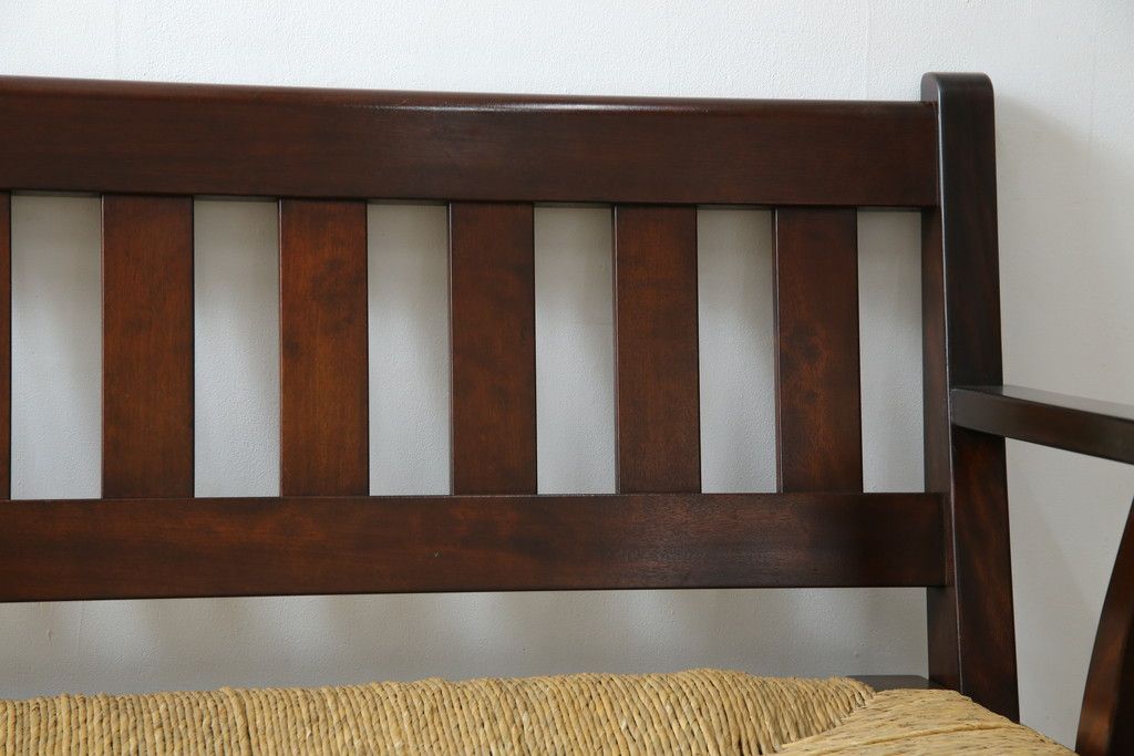 椅子・ベンチ> アームチェア > 中古 稀少 特注品 松本民芸家具 縦桟背もたれのすっきりしたデザインが目を引くラッシベンチ(2人掛け、2.5人掛け、3人掛け、長イス、長椅子、アームチェア、ダイニングチェア)(R-067241)