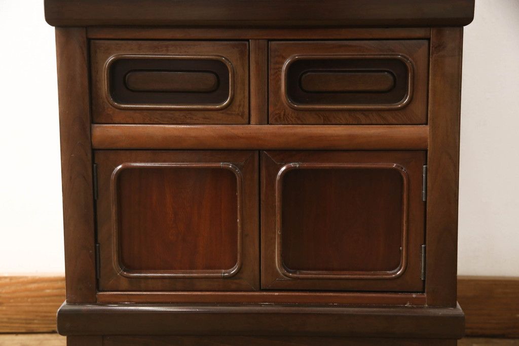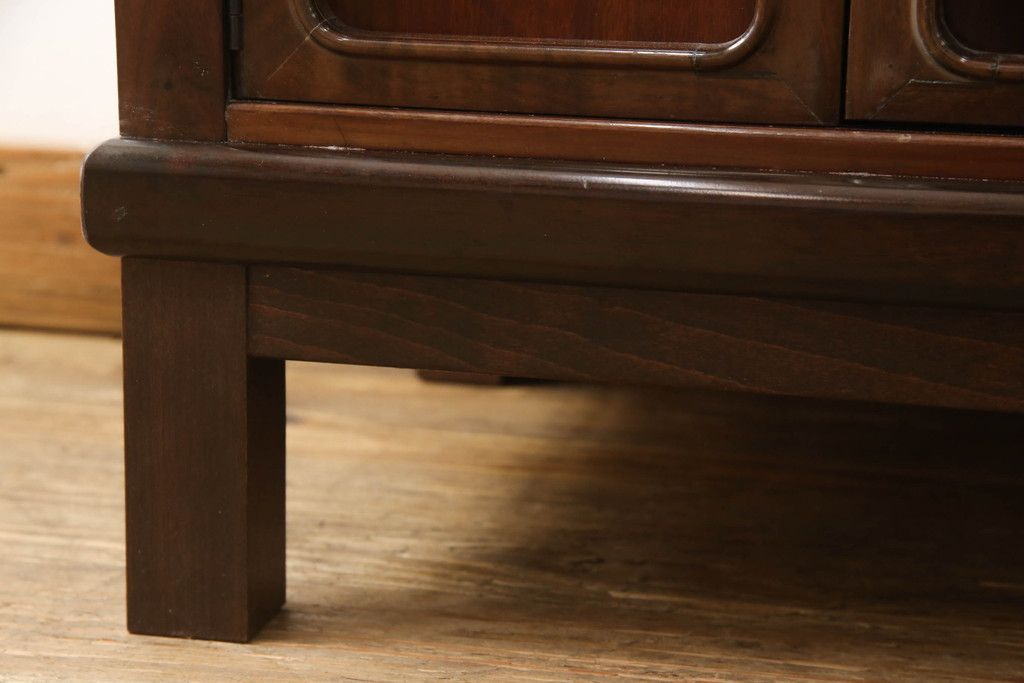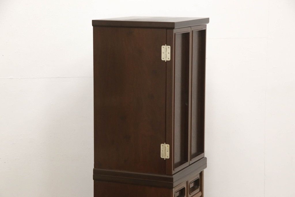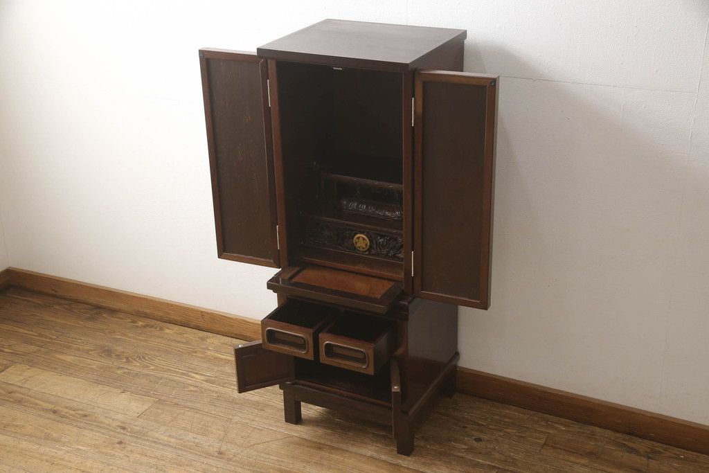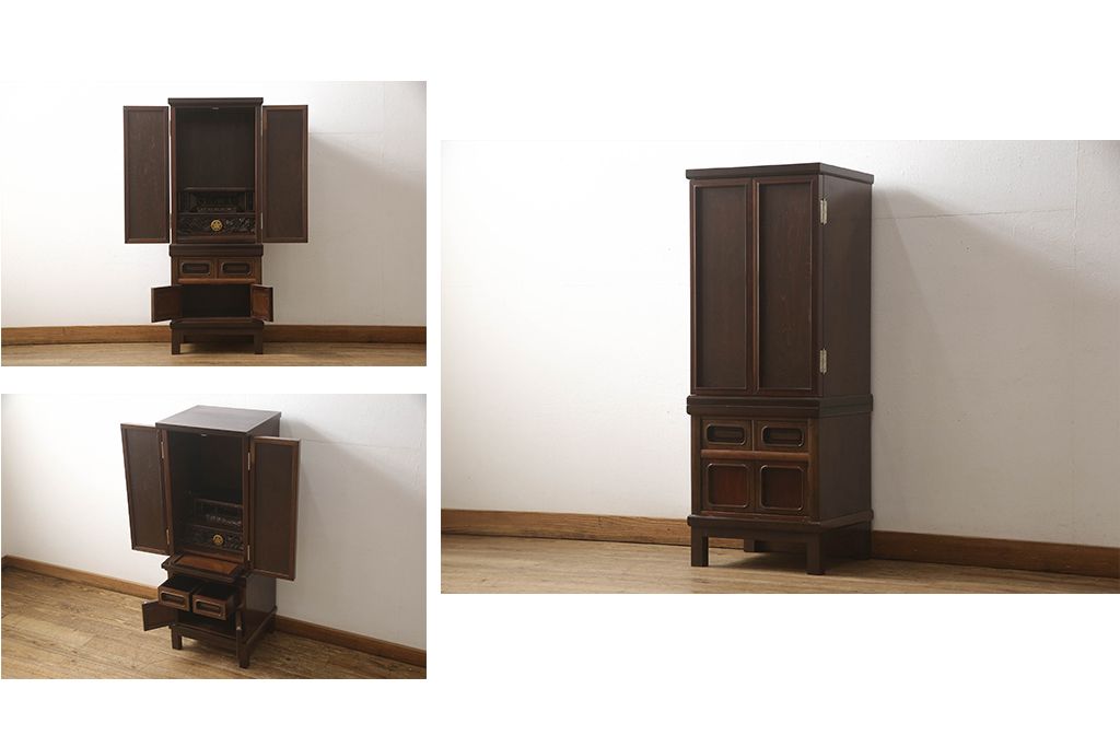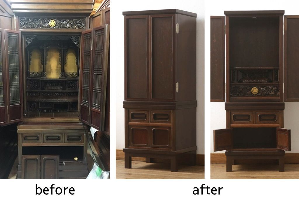 お仏壇をコンパクトにリメイク!上段は4枚組だった建具を2枚組に加工。上部にあった家紋も移設。下段は引き戸→観音開き仕様に変更。脚を取り付け。背板も新たに取り付け、元の色を活かし全体を着色して仕上げ。