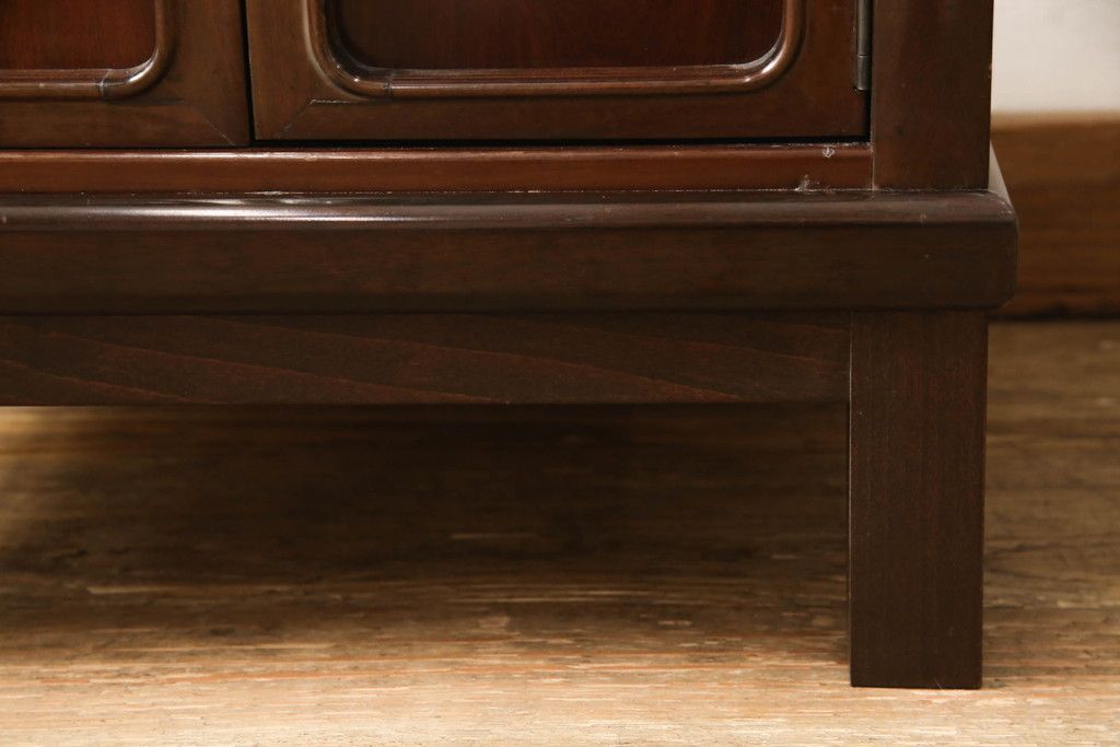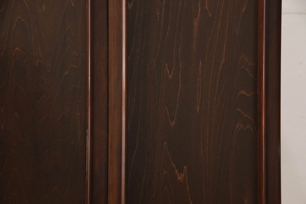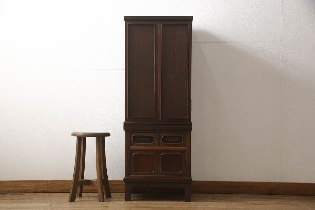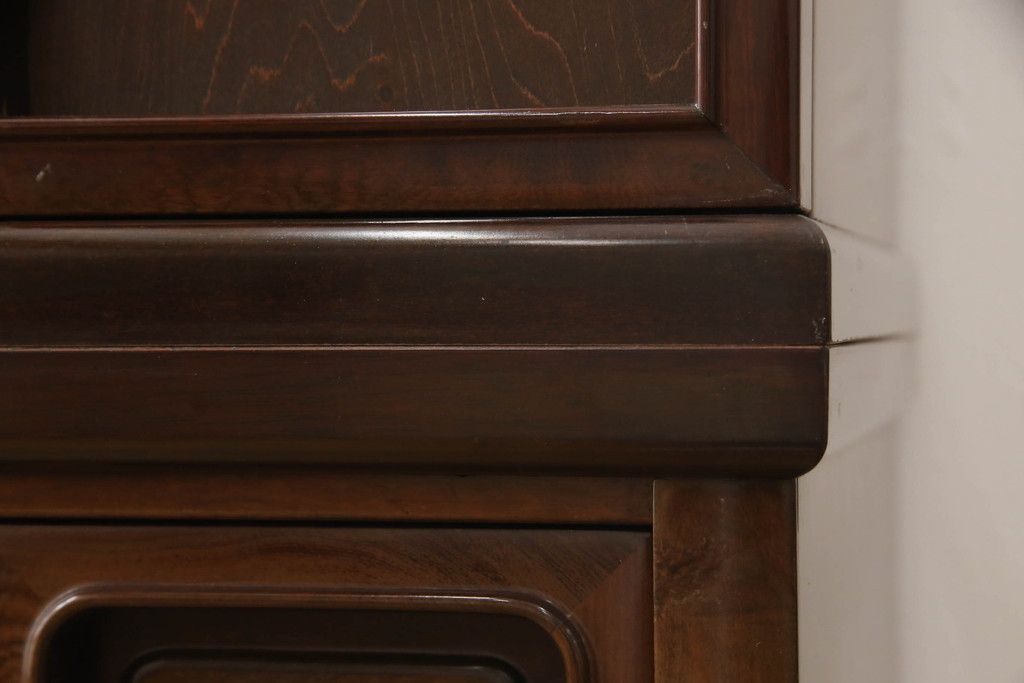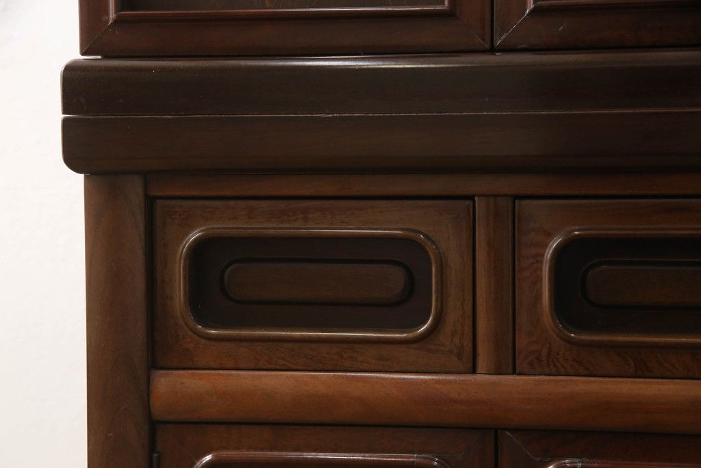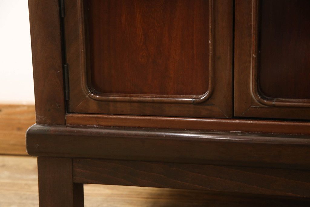 お仏壇をコンパクトにリメイク!上段は4枚組だった建具を2枚組に加工。上部にあった家紋も移設。下段は引き戸→観音開き仕様に変更。脚を取り付け。背板も新たに取り付け、元の色を活かし全体を着色して仕上げ。