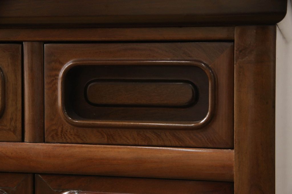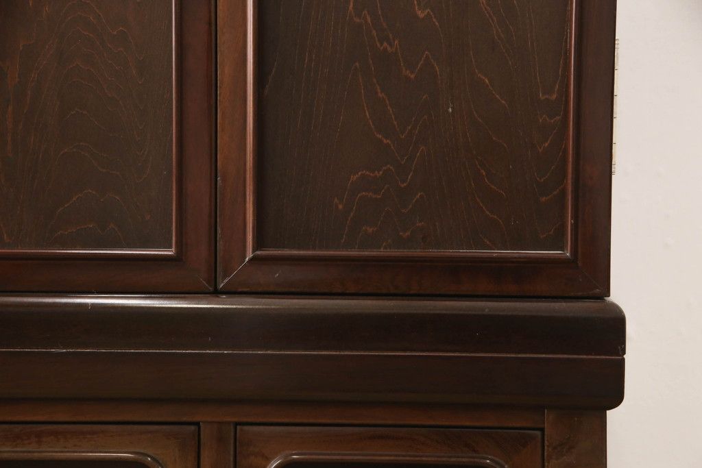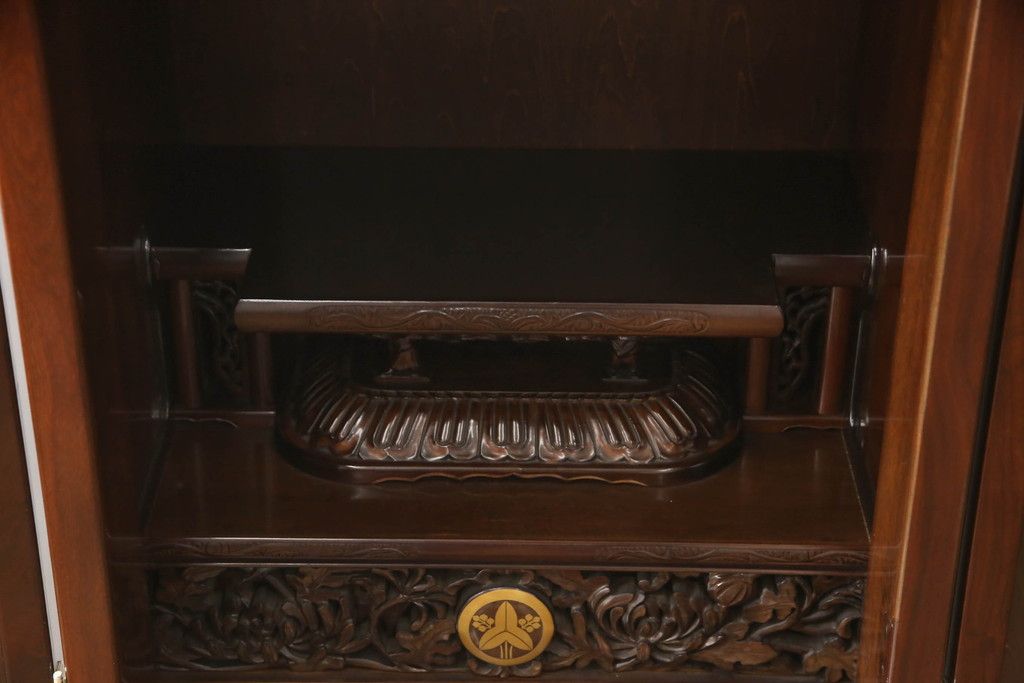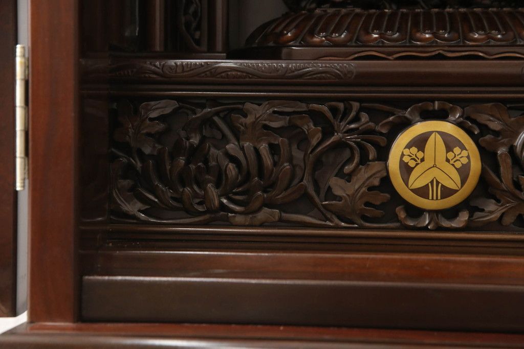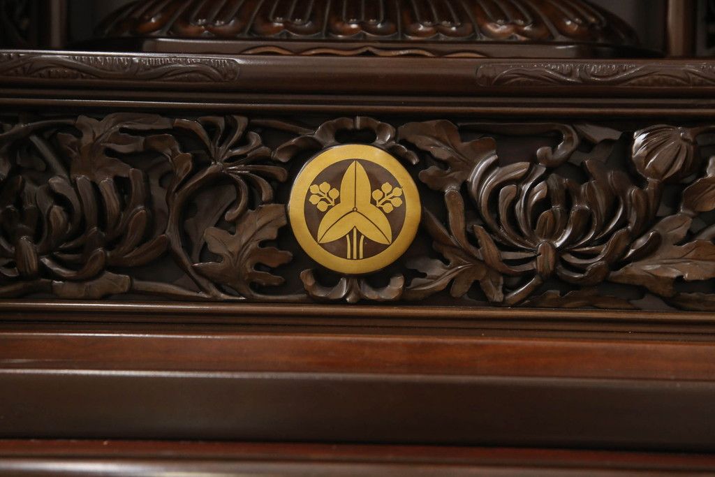 ラフジュ工房> お手持ちの家具・建具リメイク実績> 仏壇リメイク実績 > お仏壇をコンパクトにリメイク!上段は4枚組だった建具を2枚組に加工。上部にあった家紋も移設。下段は引き戸→観音開き仕様に変更。脚を取り付け。背板も新たに取り付け、元の色を活かし全体を着色して仕上げ。