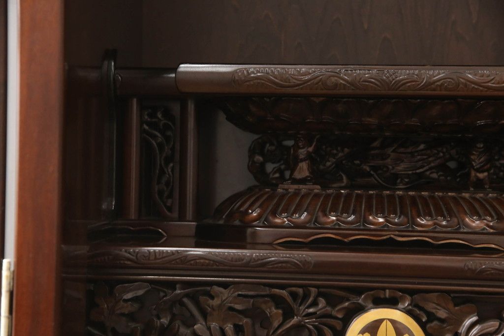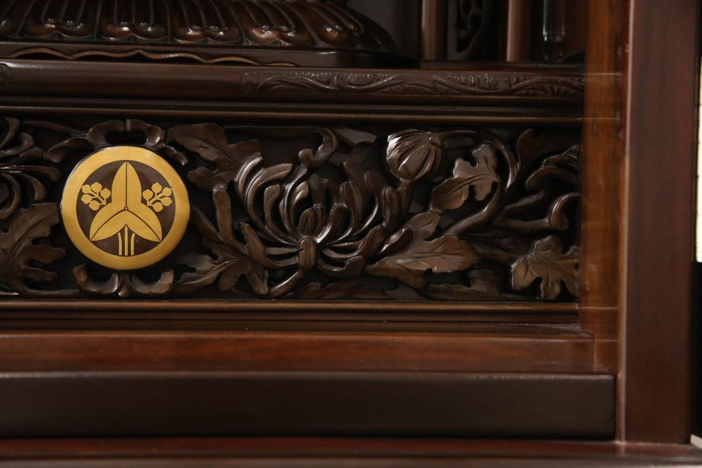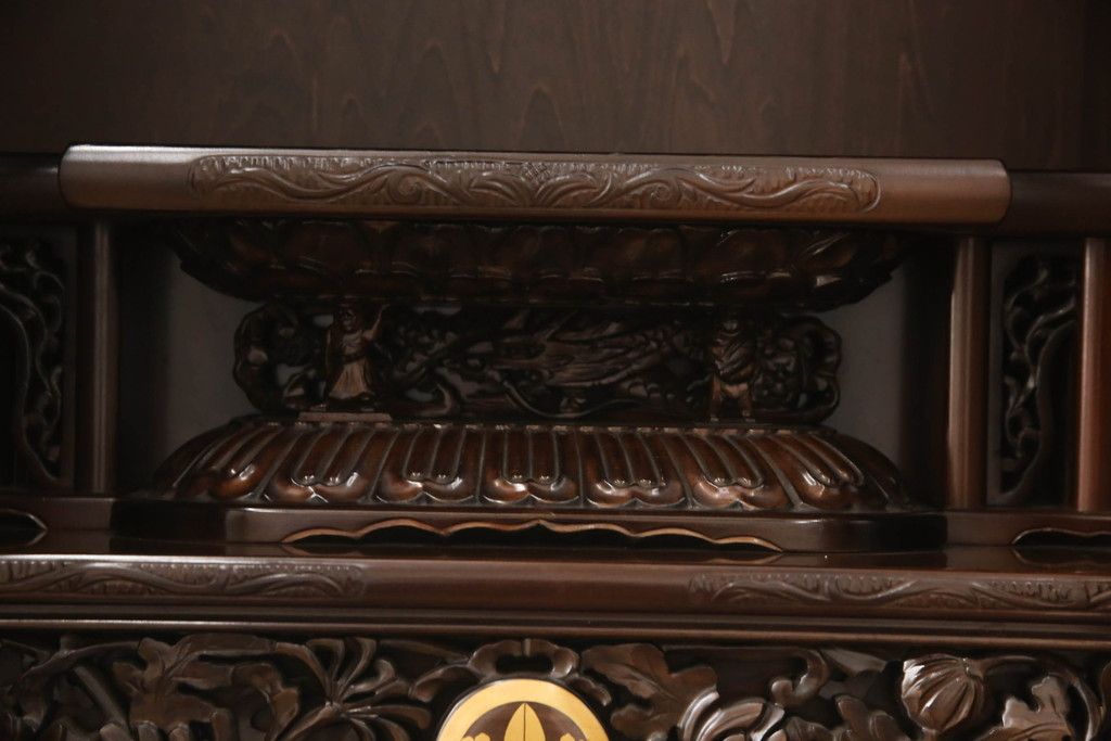 ラフジュ工房> 仏壇 > お仏壇をコンパクトにリメイク!上段は4枚組だった建具を2枚組に加工。上部にあった家紋も移設。下段は引き戸→観音開き仕様に変更。脚を取り付け。背板も新たに取り付け、元の色を活かし全体を着色して仕上げ。