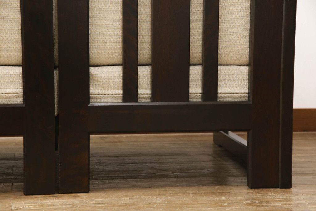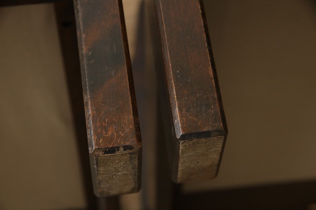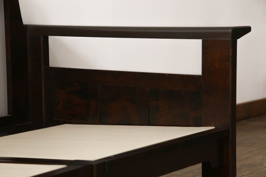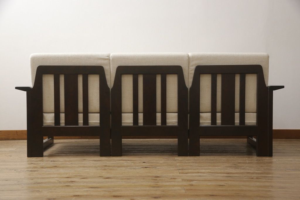 【セミオーダー家具実例】北海道民芸家具の3人掛けソファに高品質リペアを施しました。木部は元の雰囲気を残して使用上問題がある部分をリペア、座面やクッションは内部のウレタンを交換し、お客様ご希望の生地で張り替えました。背もたれのクッションは元の形状を再現し、座り心地にもこだわりました。(3人掛けソファ、3P)