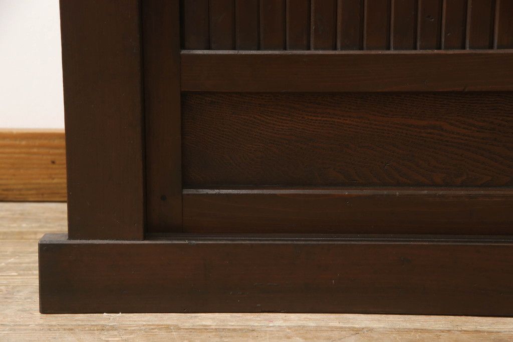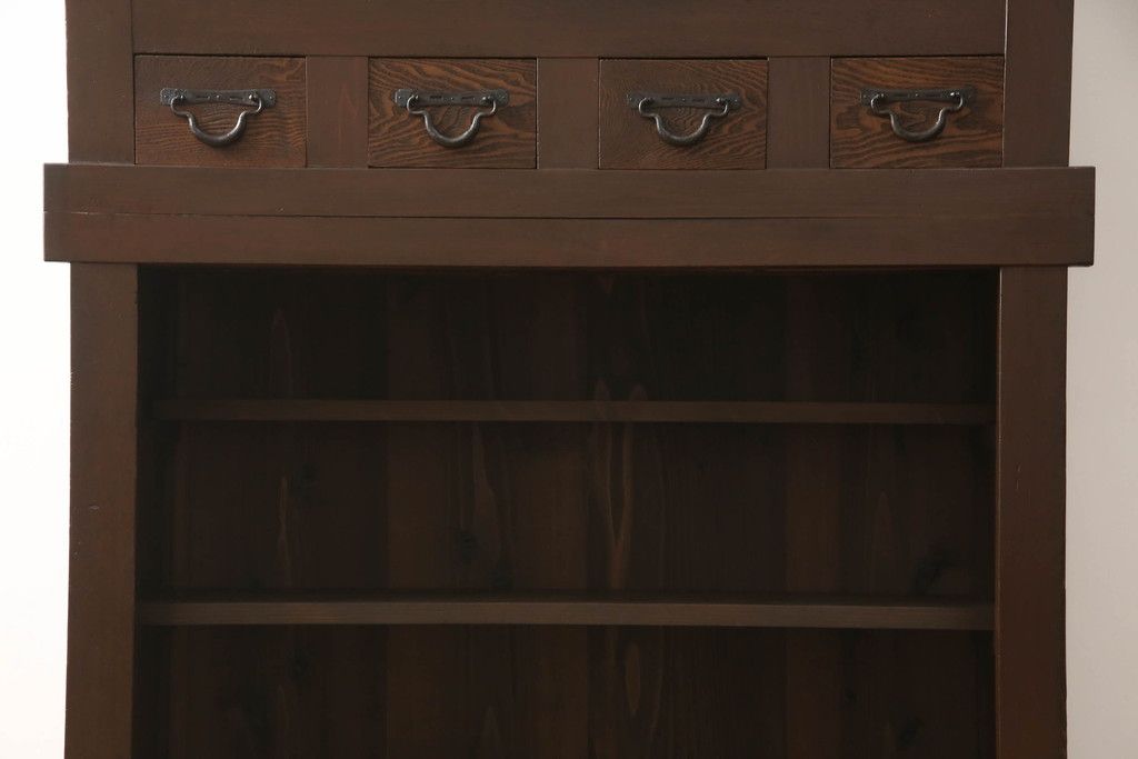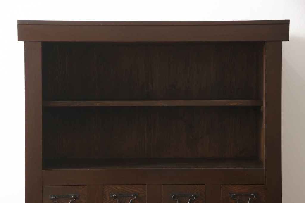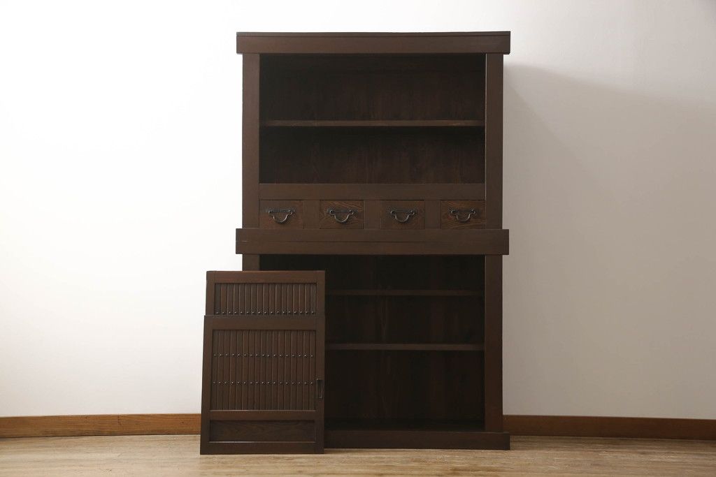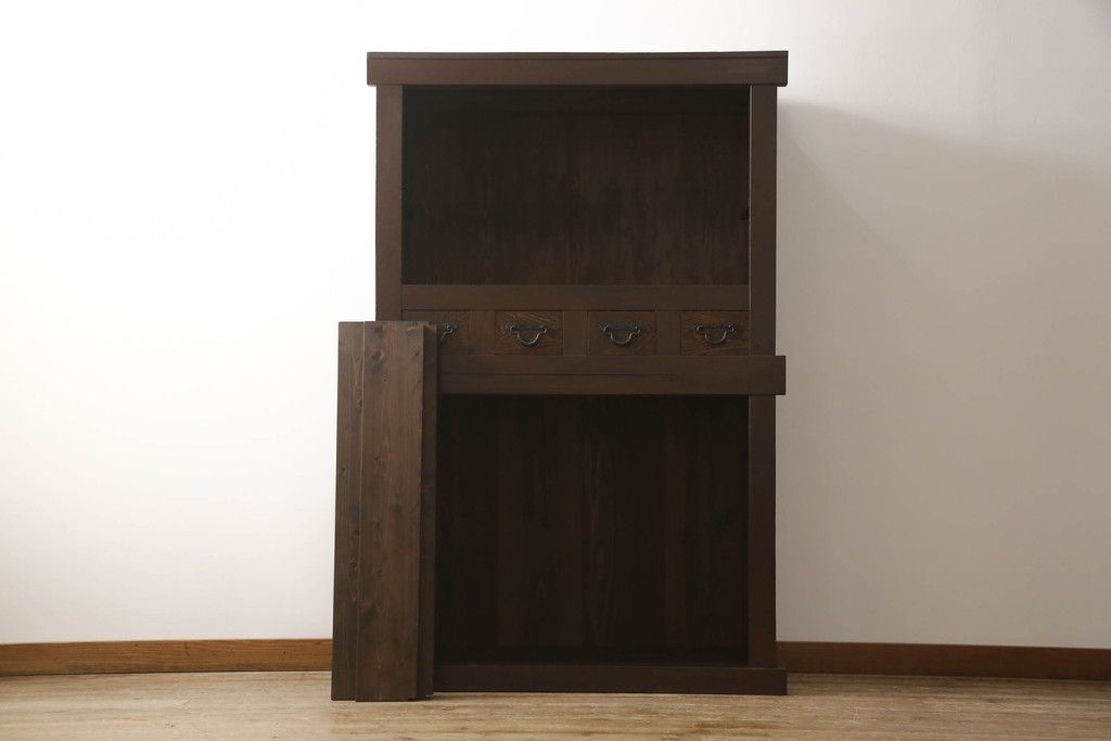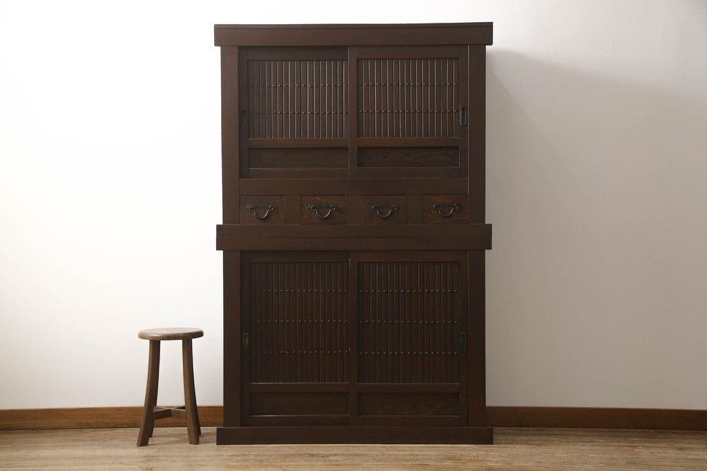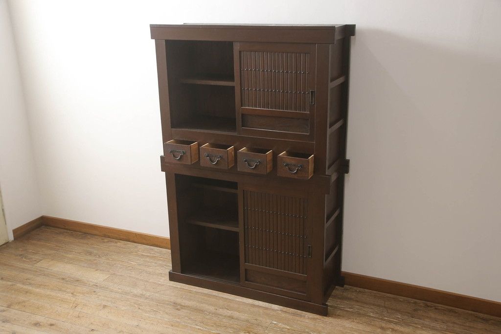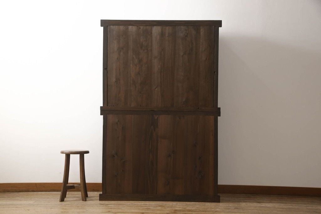 重ね水屋箪笥をリペア&カスタム!設置場所に合わせて左右側面の出をカットし、棚板は新材に交換。現状の色味をベースに着色仕上げ。(収納棚、戸棚、食器棚、キャビネット)
