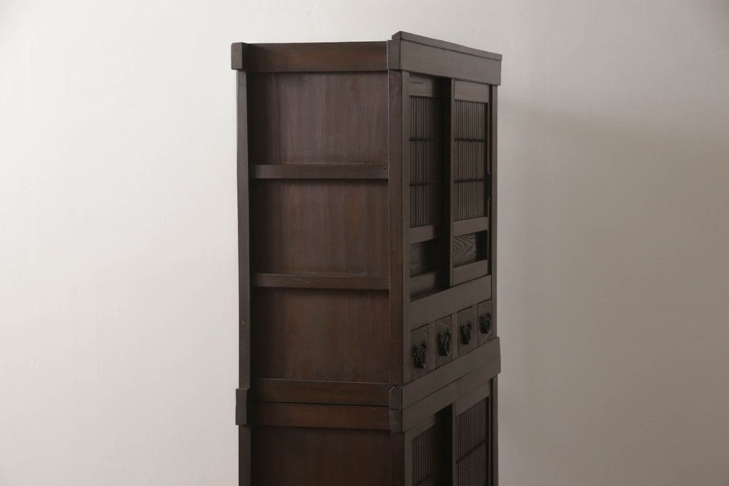 キャビネット・戸棚> 食器棚・カップボード > 重ね水屋箪笥をリペア&カスタム!設置場所に合わせて左右側面の出をカットし、棚板は新材に交換。現状の色味をベースに着色仕上げ。(収納棚、戸棚、食器棚、キャビネット)