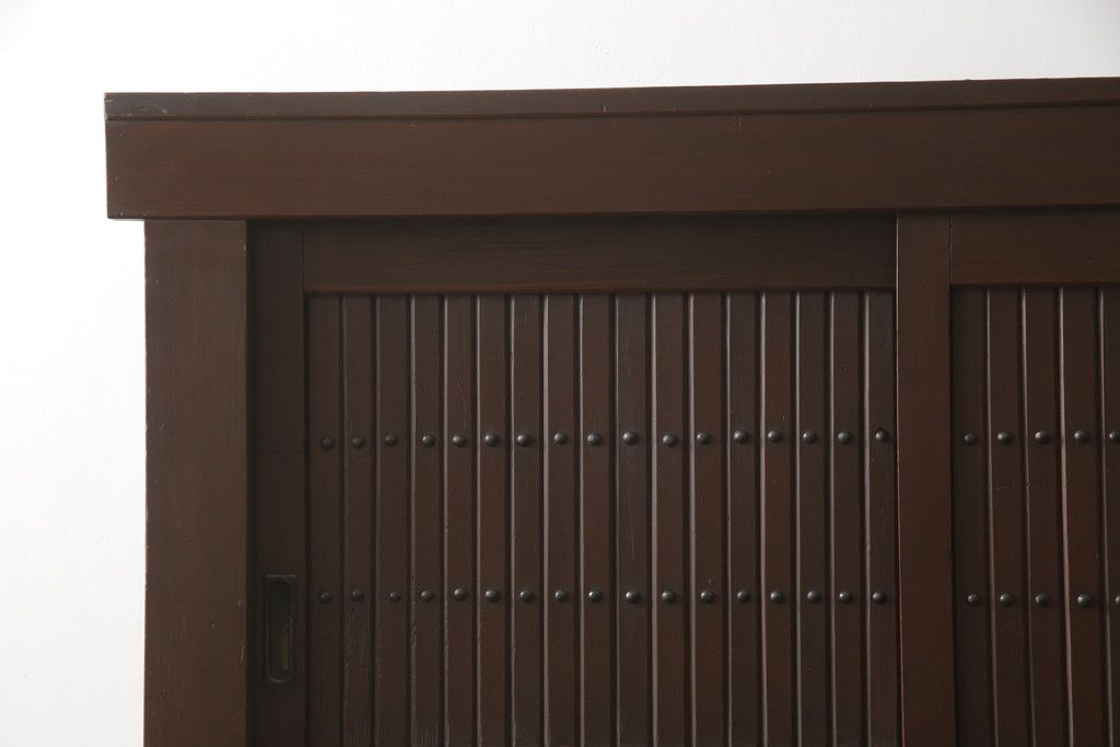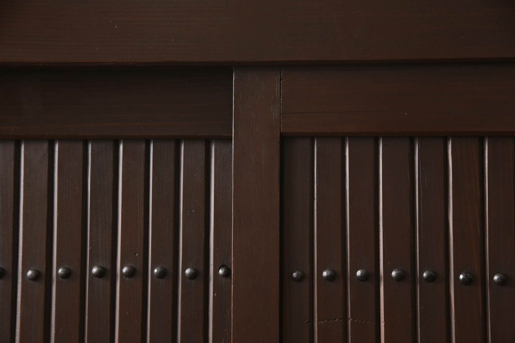 【セミオーダー家具実例】重ねの水屋箪笥に高品質リペアを施しました。設置場所の幅に合わせて左右側面の出をそれぞれ10mmずつカットし、棚板は新材に交換。お色味は現状のお色味をベースに、元の雰囲気を残して仕上げました。(収納棚、戸棚、食器棚、キャビネット)