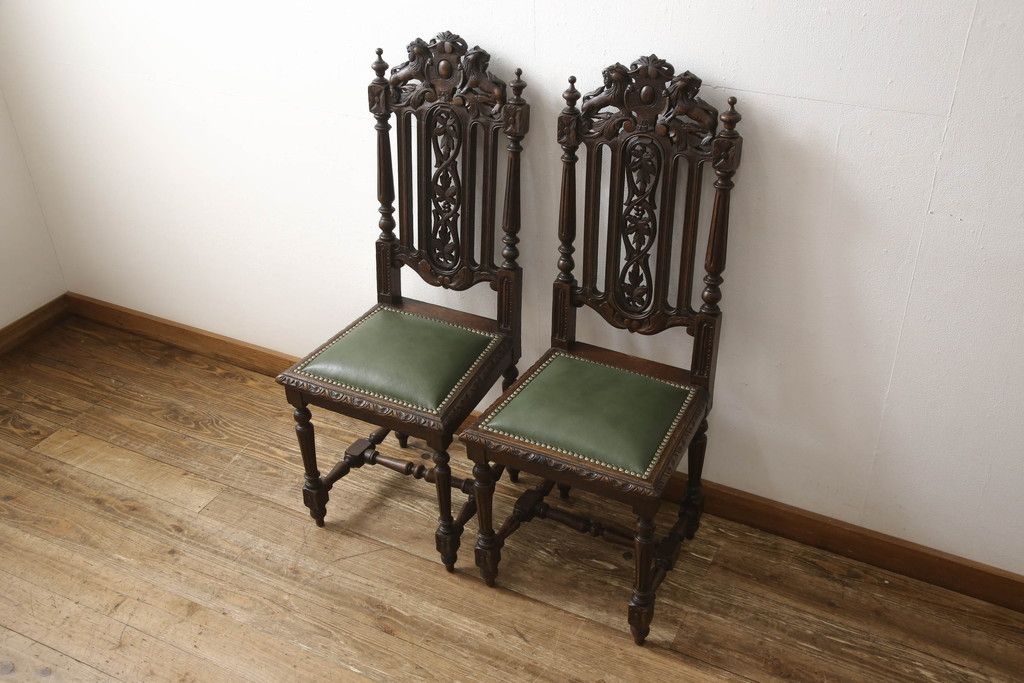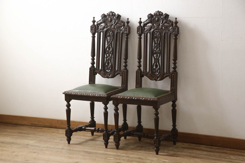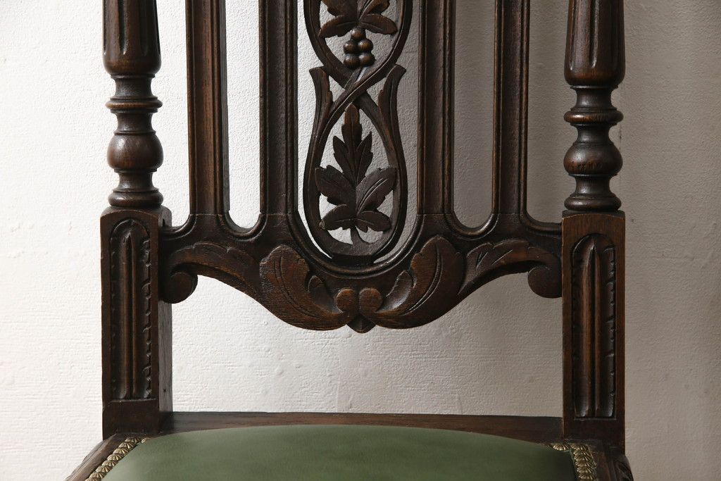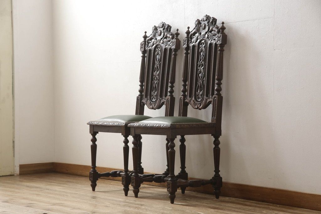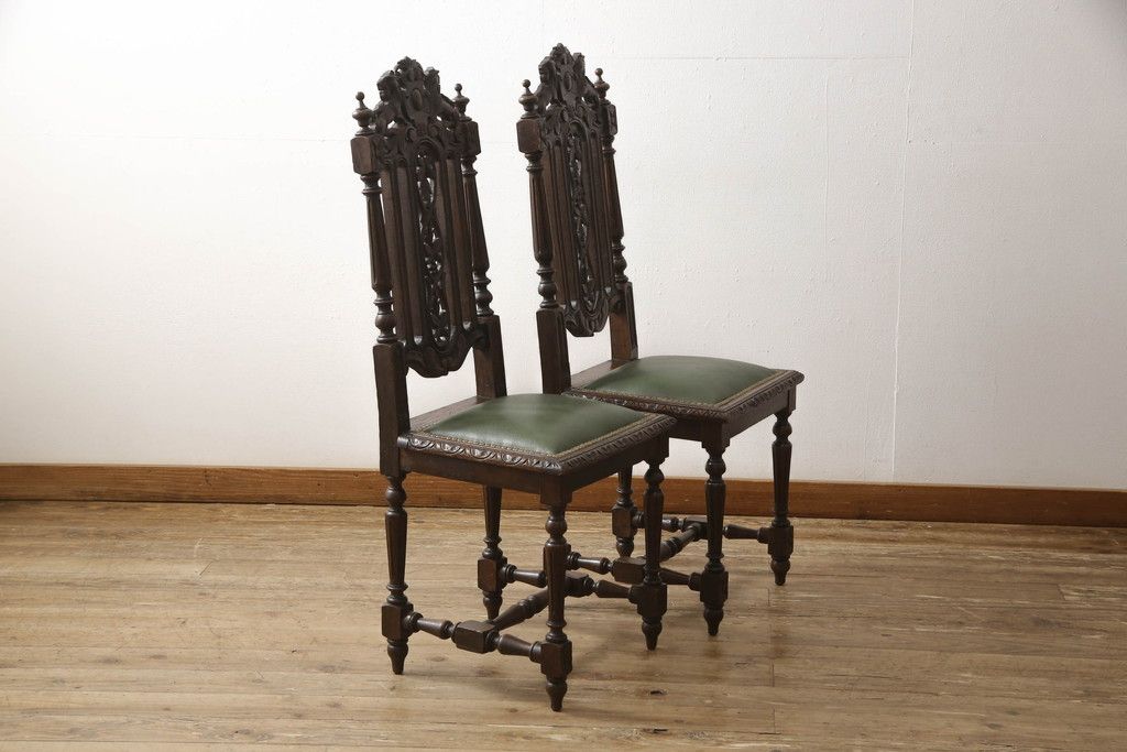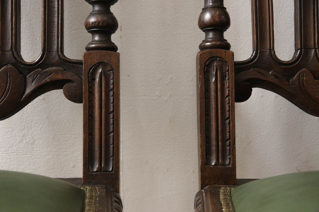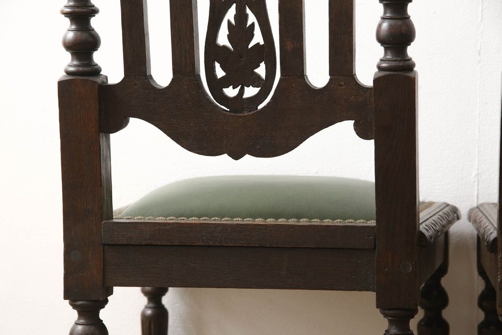 椅子・ベンチ > イギリスアンティークのチェア2脚をリペア&カスタム!座面をモスグリーンの本革に張替え、縁に鋲を取り付けアクセントに。木部は濃い茶色で着色仕上げ。(椅子、イス、ダイニングチェア)