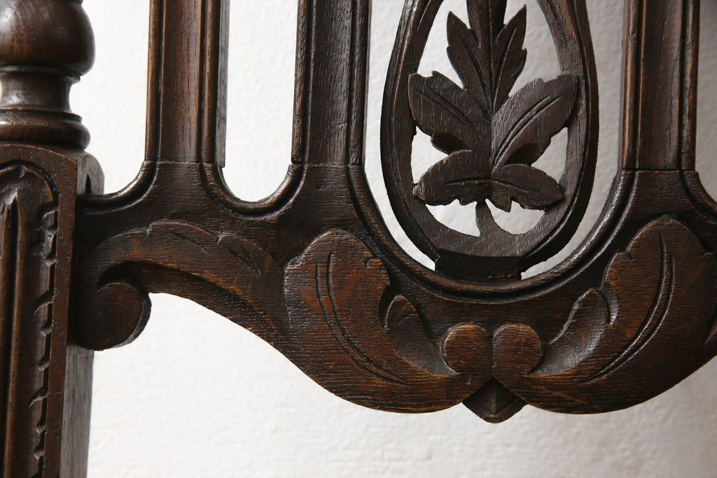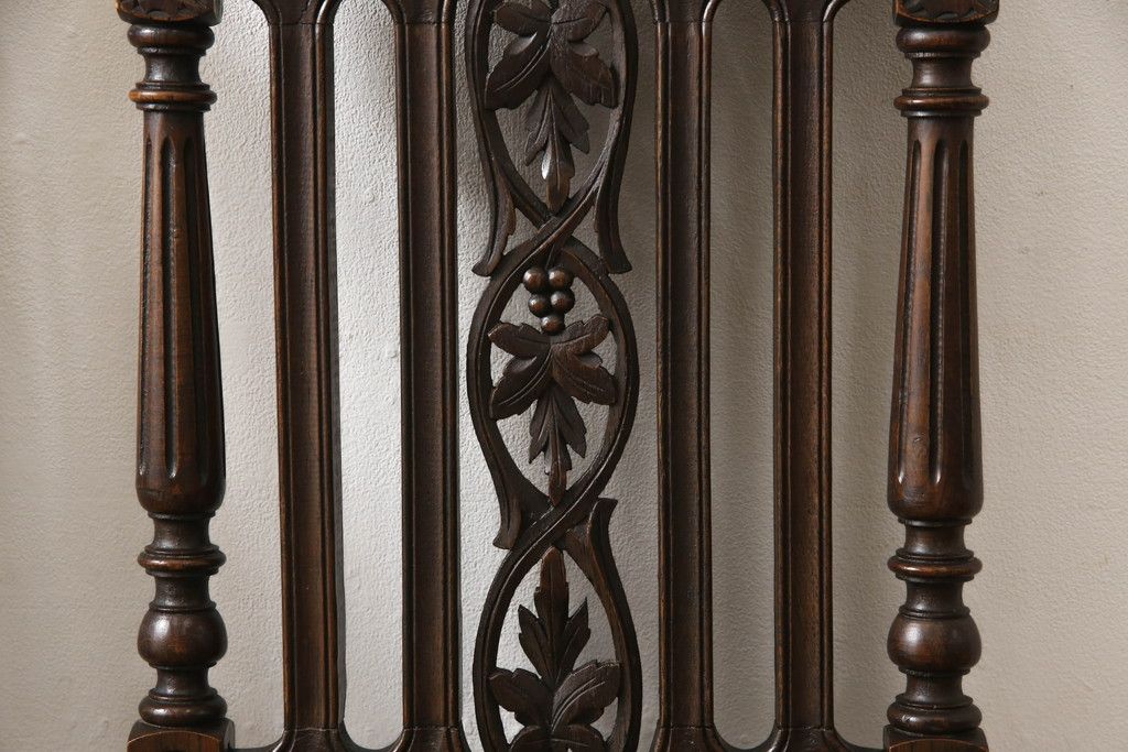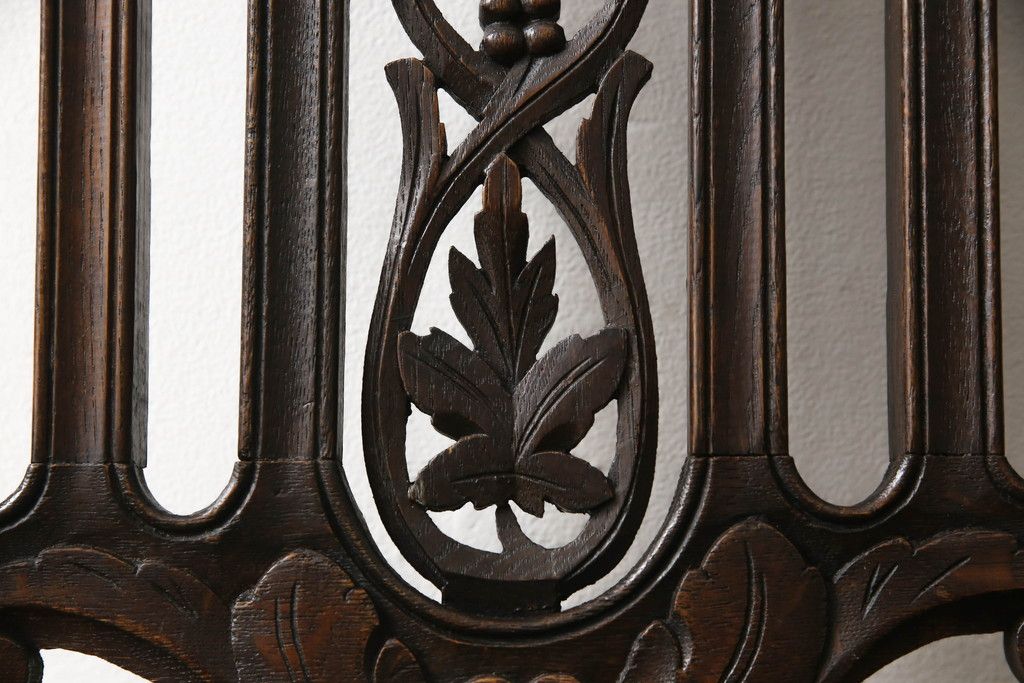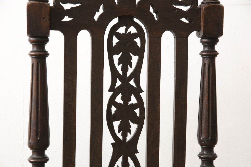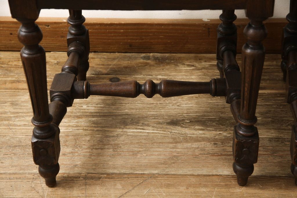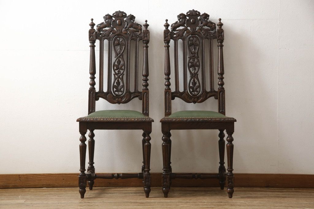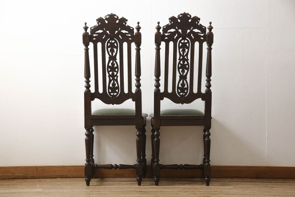 椅子・ベンチ > イギリスアンティークのチェア2脚をリペア&カスタム!座面をモスグリーンの本革に張替え、縁に鋲を取り付けアクセントに。木部は濃い茶色で着色仕上げ。(椅子、イス、ダイニングチェア)