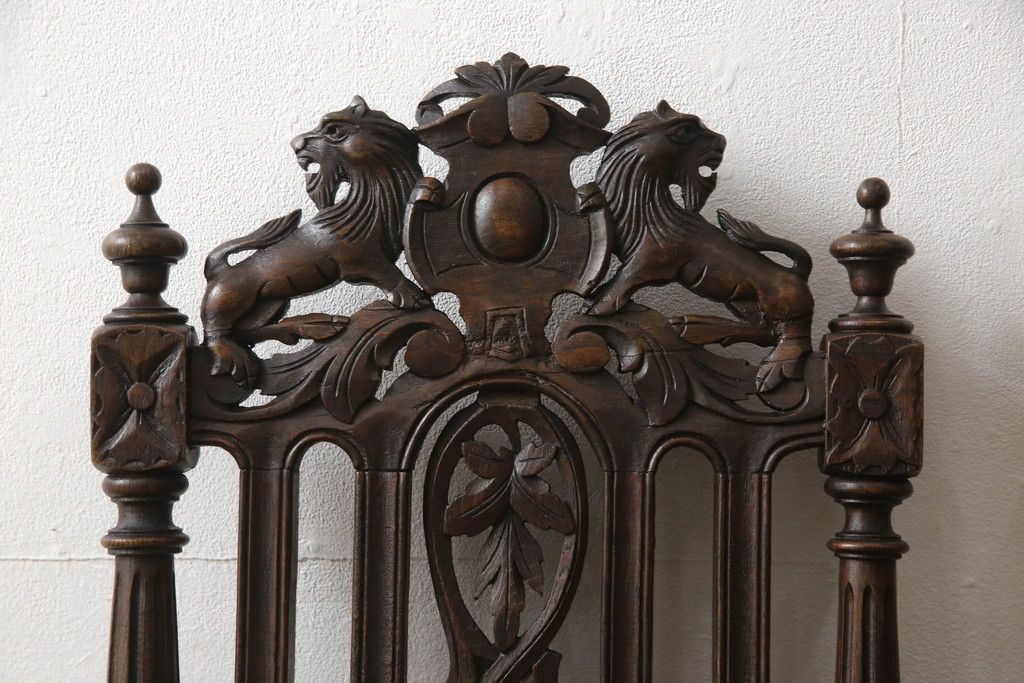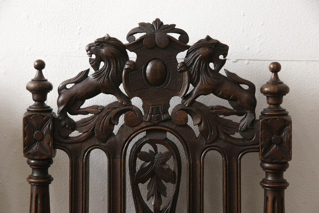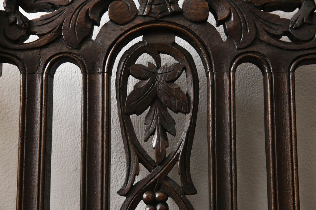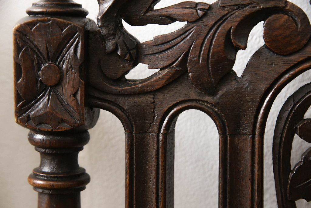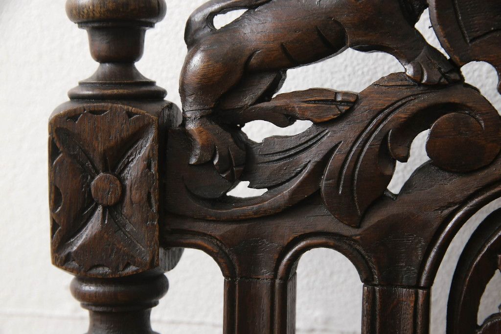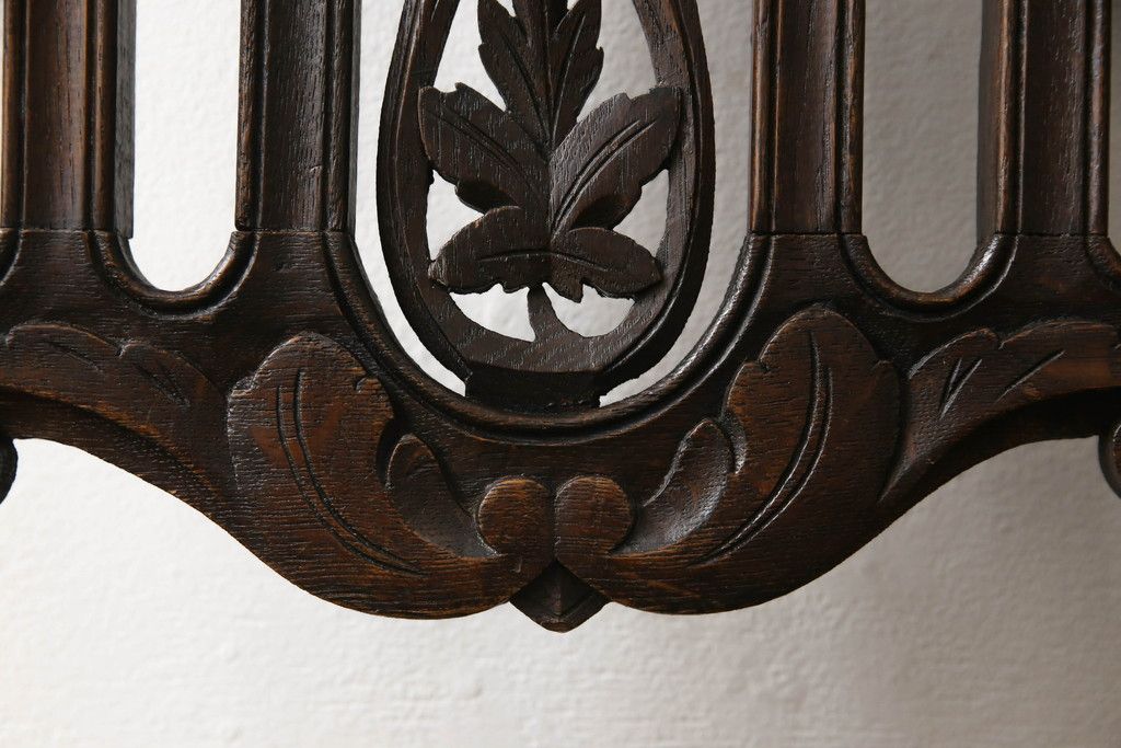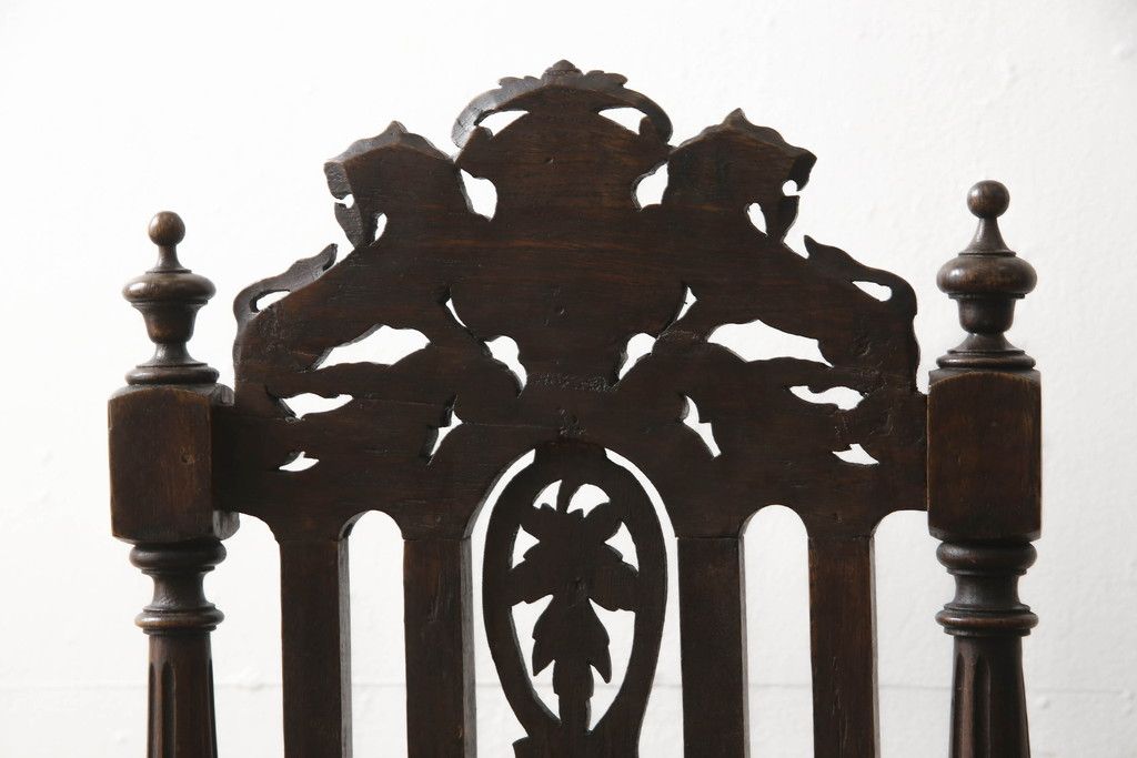 椅子・ベンチ > イギリスアンティークのチェア2脚をリペア&カスタム!座面をモスグリーンの本革に張替え、縁に鋲を取り付けアクセントに。木部は濃い茶色で着色仕上げ。(椅子、イス、ダイニングチェア)