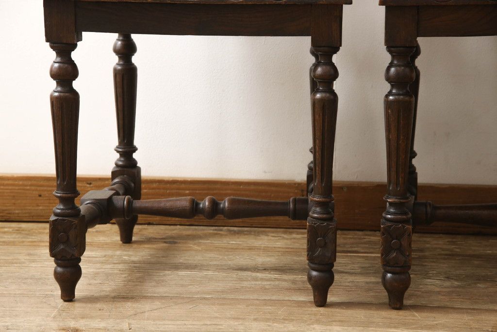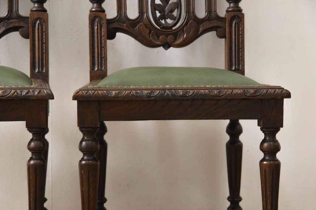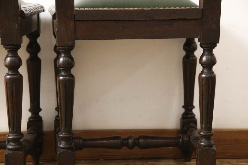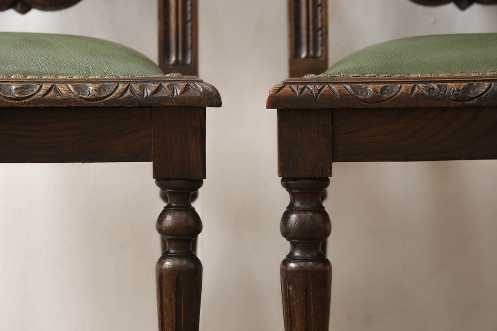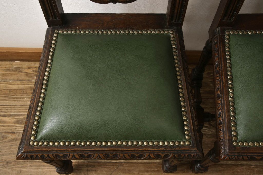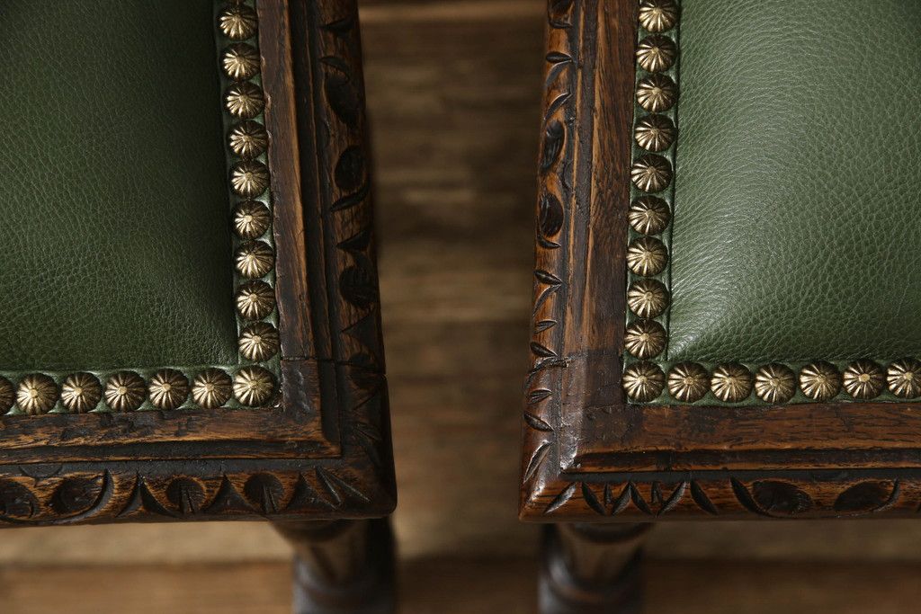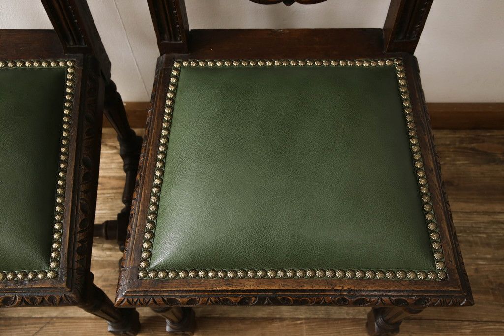 イギリスアンティークのチェア2脚をリペア&カスタム!座面をモスグリーンの本革に張替え、縁に鋲を取り付けアクセントに。木部は濃い茶色で着色仕上げ。(椅子、イス、ダイニングチェア)