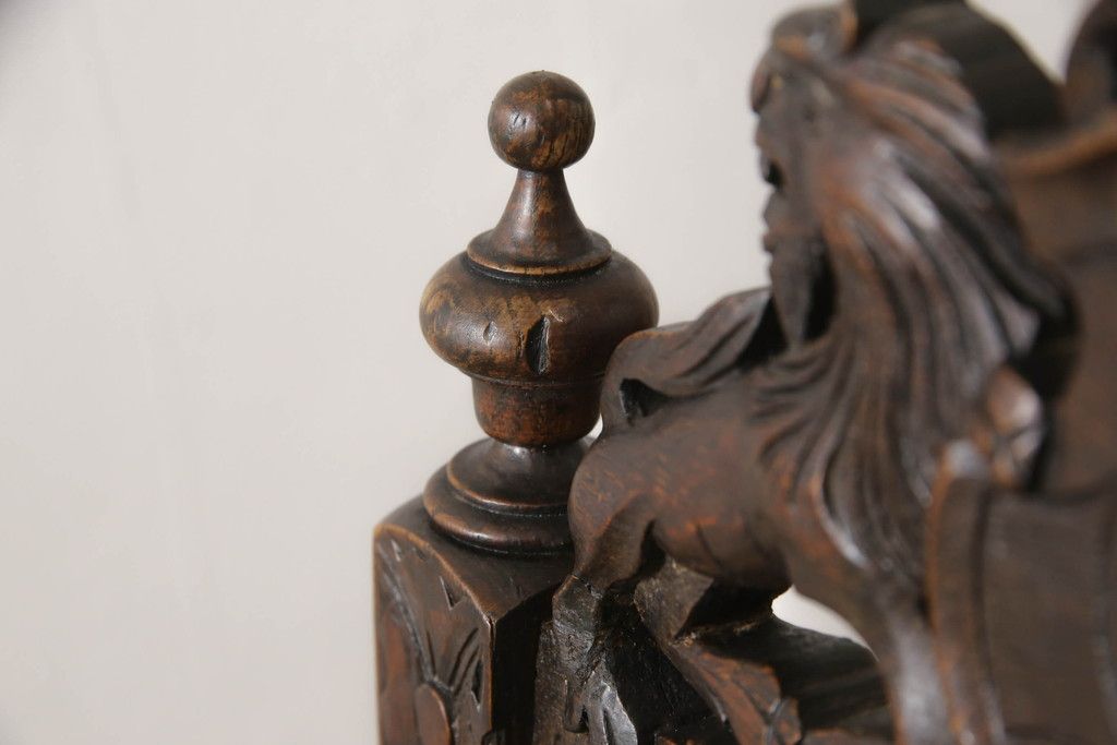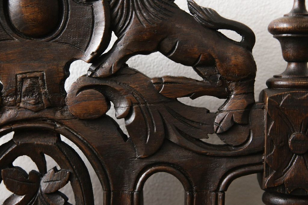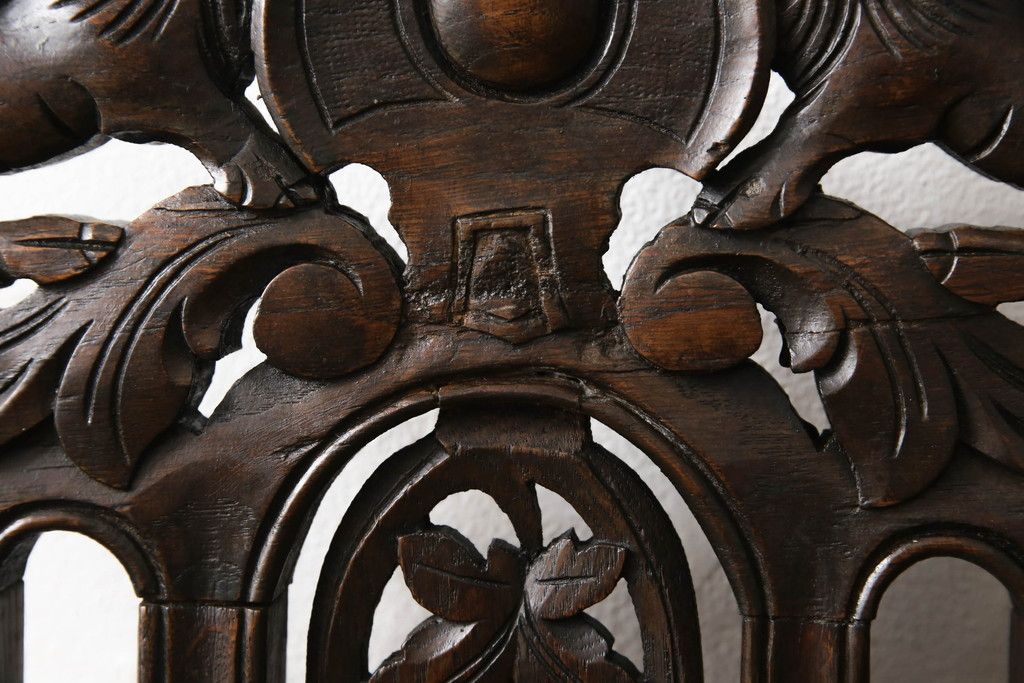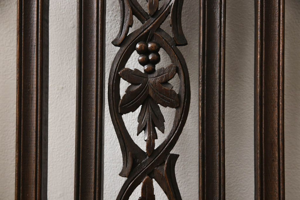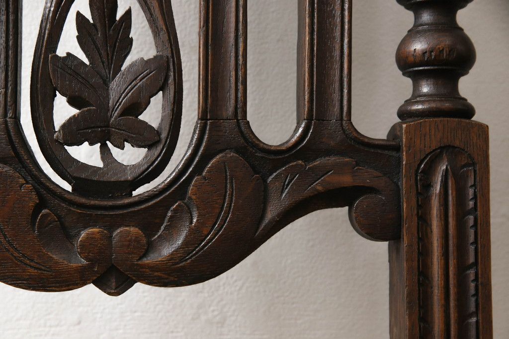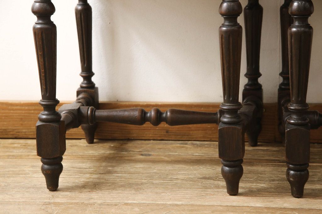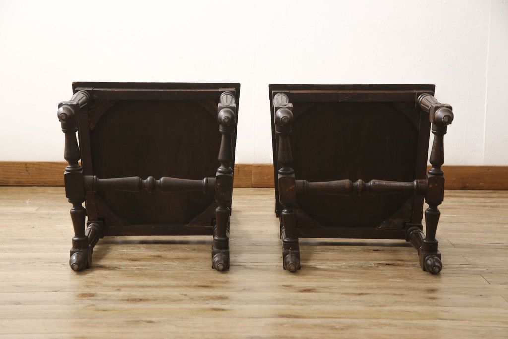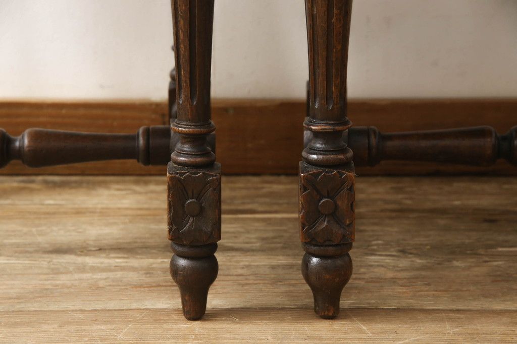 イギリスアンティークのチェア2脚をリペア&カスタム!座面をモスグリーンの本革に張替え、縁に鋲を取り付けアクセントに。木部は濃い茶色で着色仕上げ。(椅子、イス、ダイニングチェア)