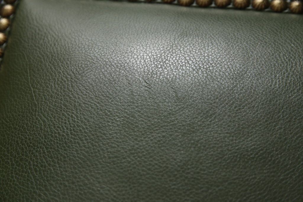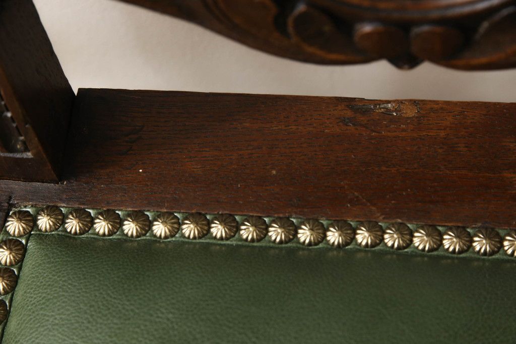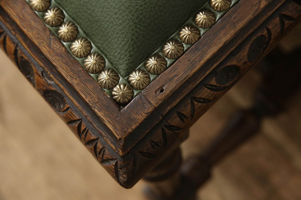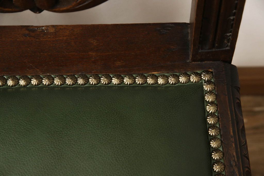 セミオーダー家具実績 > イギリスアンティークのチェア2脚をリペア&カスタム!座面をモスグリーンの本革に張替え、縁に鋲を取り付けアクセントに。木部は濃い茶色で着色仕上げ。(椅子、イス、ダイニングチェア)