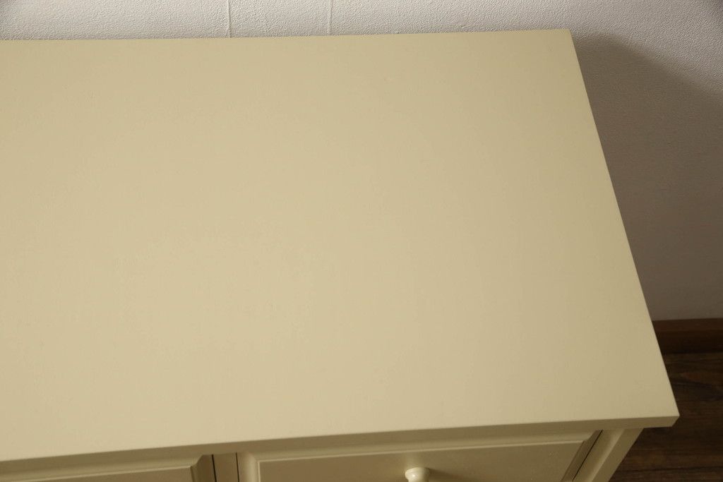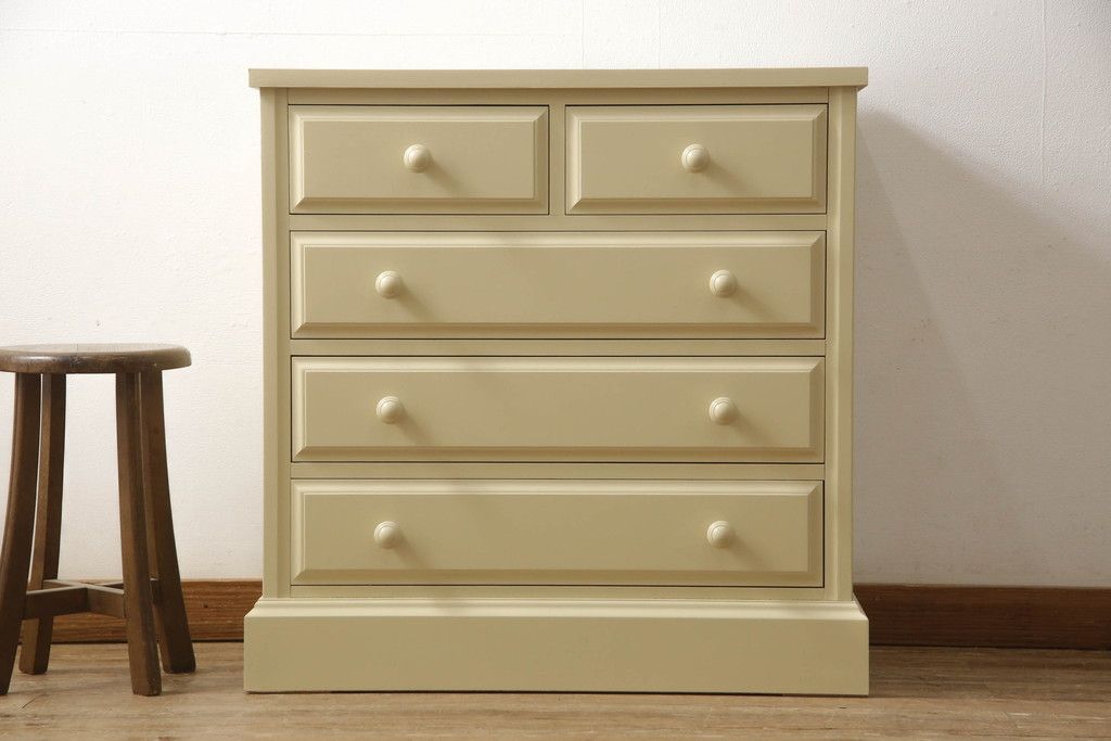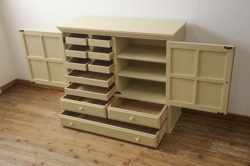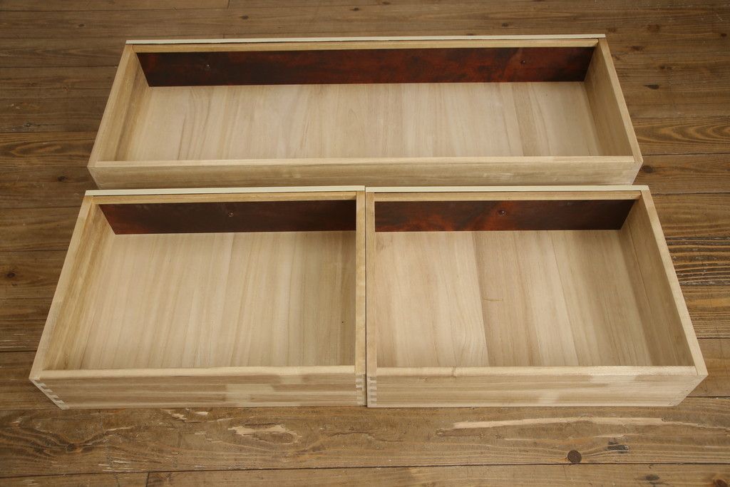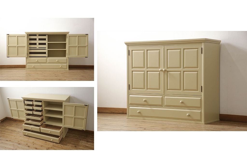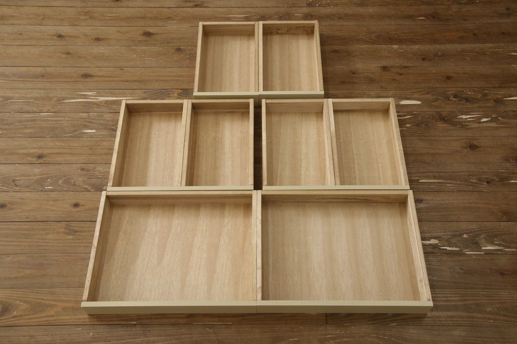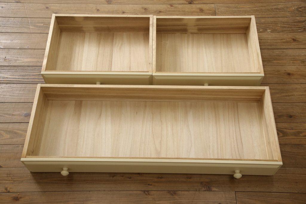 2段重ね箪笥を2つのチェストにリメイク!上段開き戸内は、左側は引き出し、右側は棚仕様に加工。下段は天板を取り付け、幅を小さくリサイズ。1段目の引き出しを横並び2杯に加工。いずれもモカベージュにペイント仕上げ。