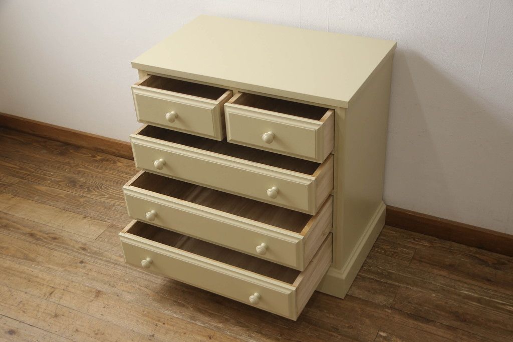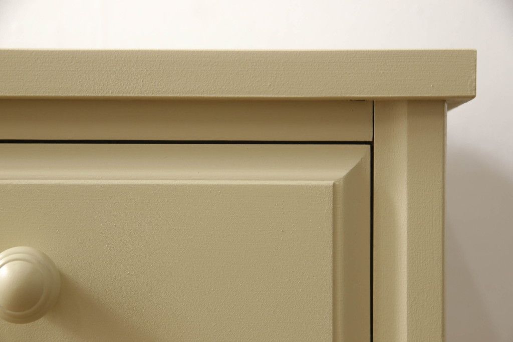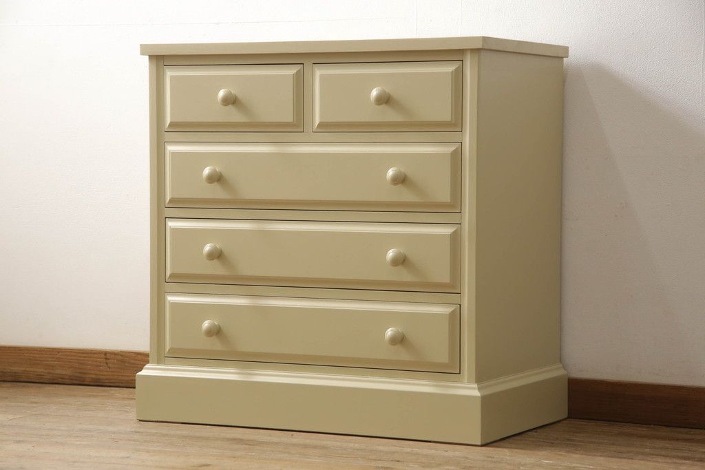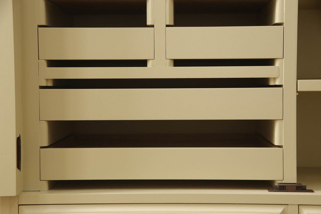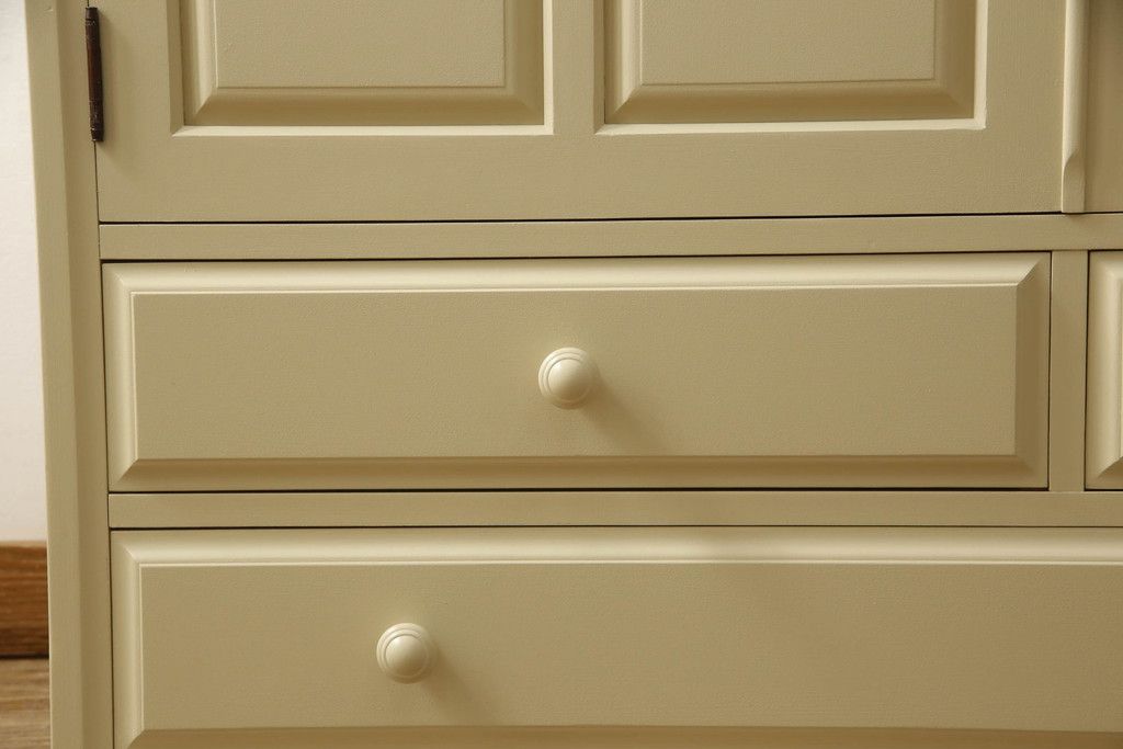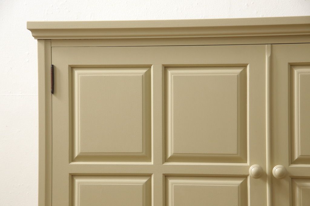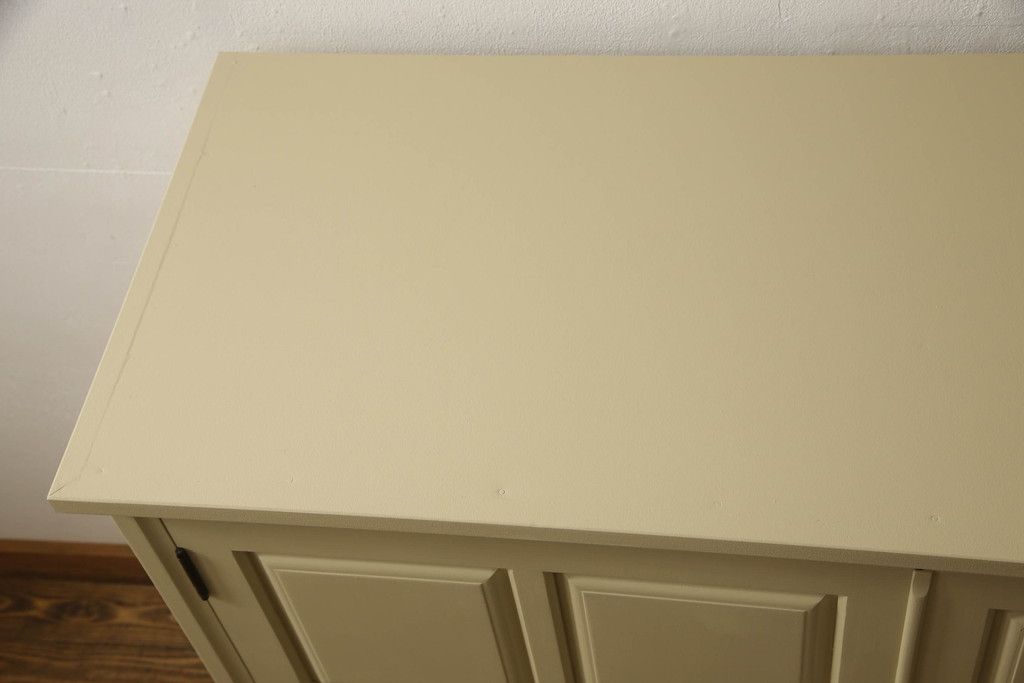 2段重ね箪笥を2つのチェストにリメイク!上段開き戸内は、左側は引き出し、右側は棚仕様に加工。下段は天板を取り付け、幅を小さくリサイズ。1段目の引き出しを横並び2杯に加工。いずれもモカベージュにペイント仕上げ。