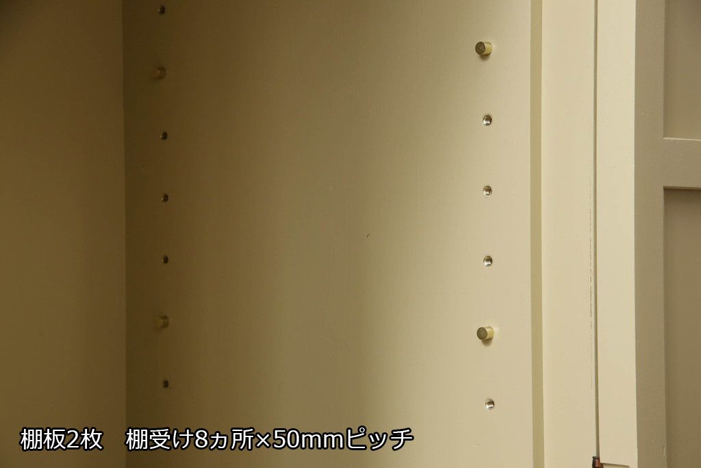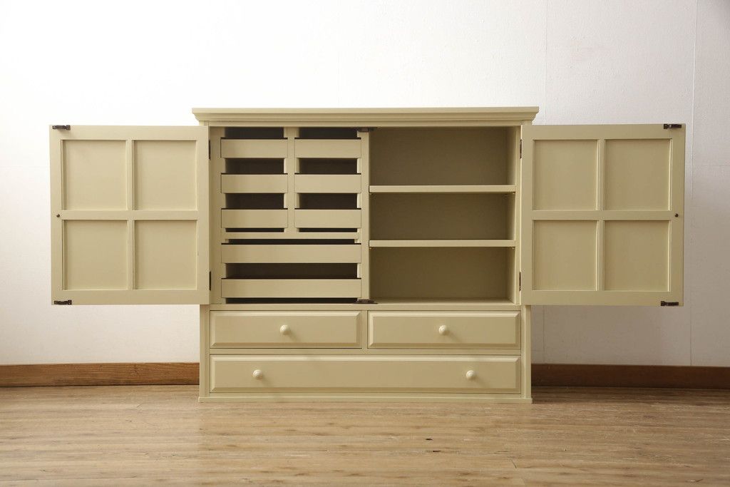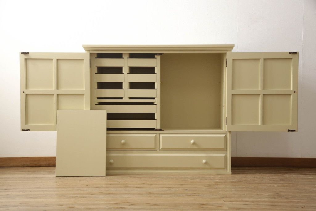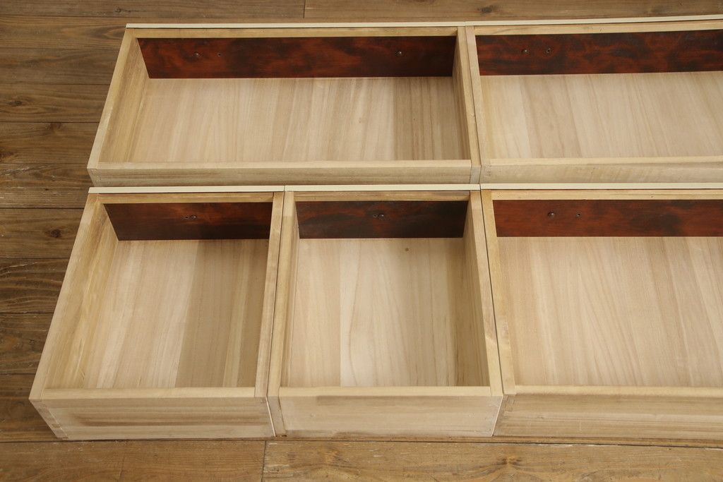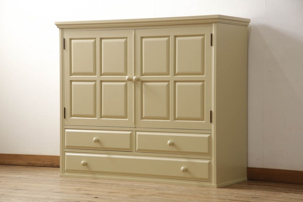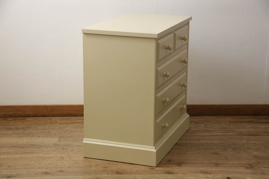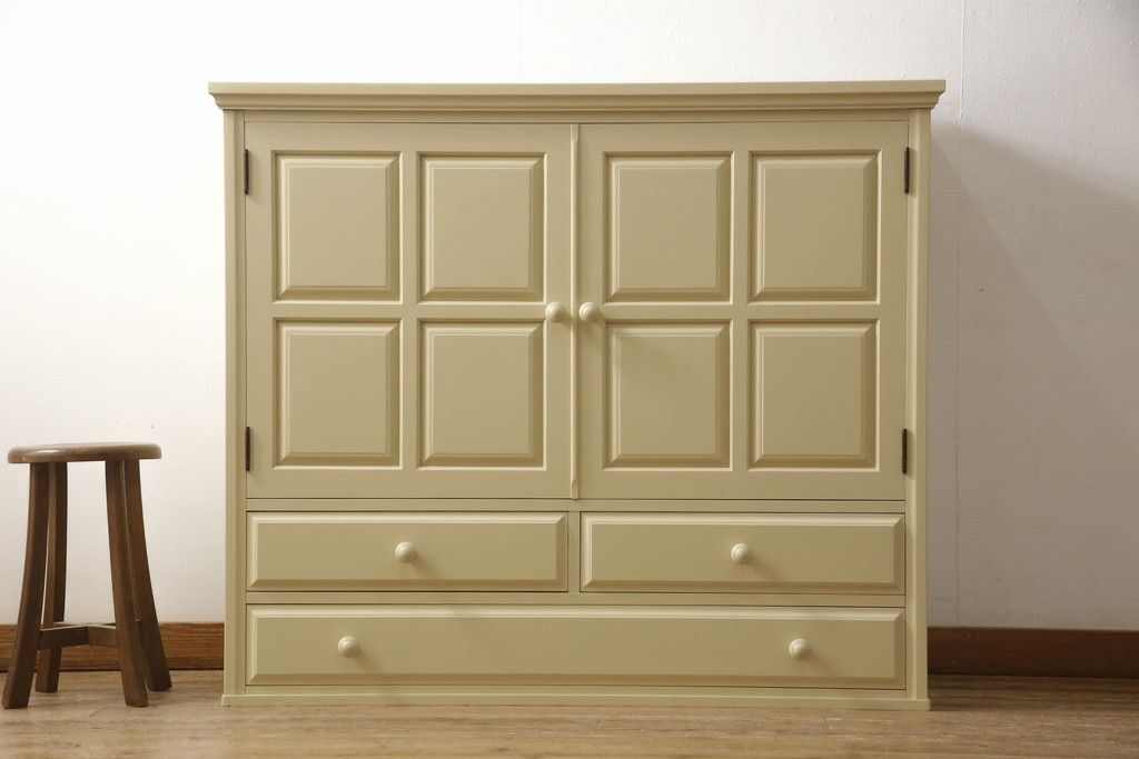 2段重ね箪笥を2つのチェストにリメイク!上段開き戸内は、左側は引き出し、右側は棚仕様に加工。下段は天板を取り付け、幅を小さくリサイズ。1段目の引き出しを横並び2杯に加工。いずれもモカベージュにペイント仕上げ。